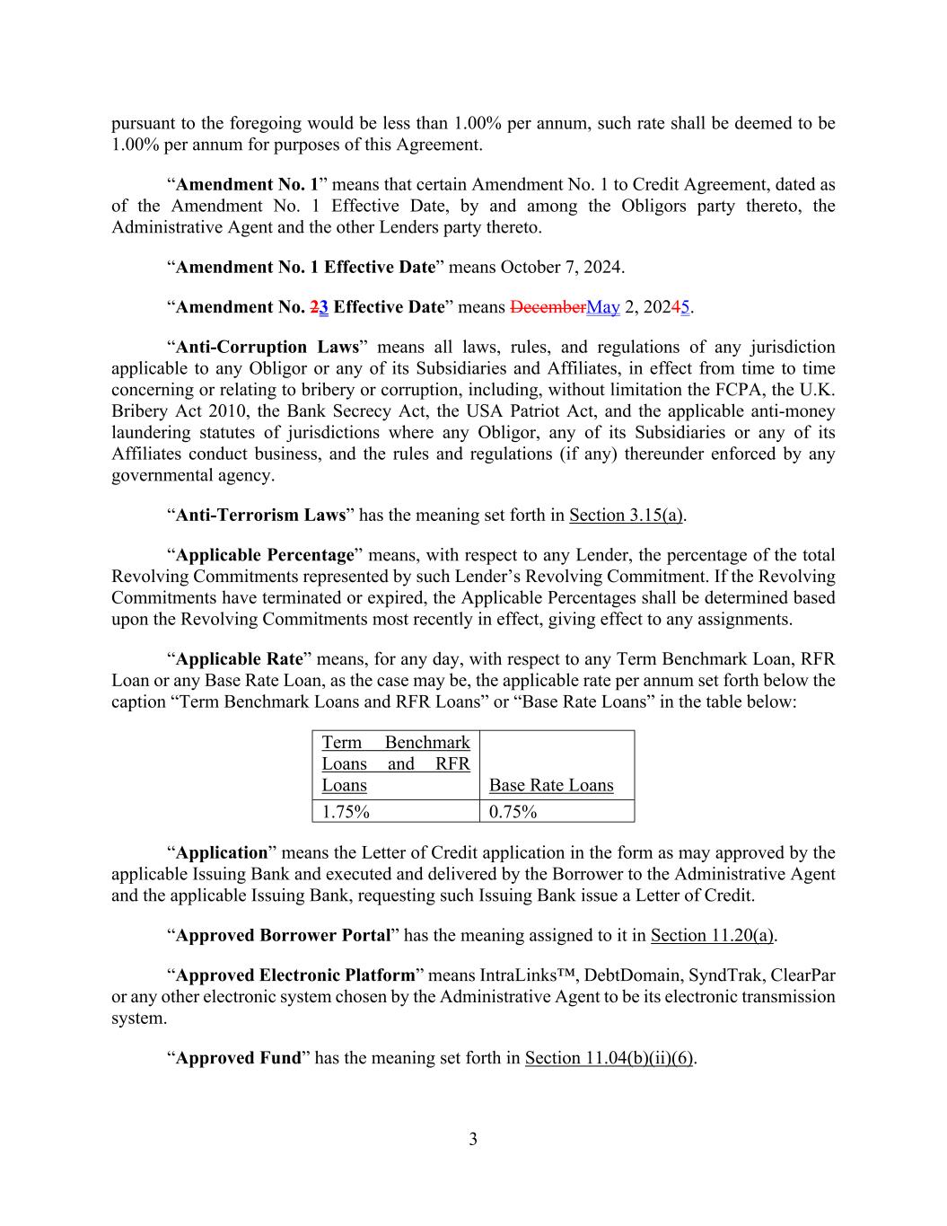 3 pursuant to the foregoing would be less than 1.00% per annum, such rate shall be deemed to be 1.00% per annum for purposes of this Agreement. “Amendment No. 1” means that certain Amendment No. 1 to Credit Agreement, dated as of the Amendment No. 1 Effective Date, by and among the Obligors party thereto, the Administrative Agent and the other Lenders party thereto. “Amendment No. 1 Effective Date” means October 7, 2024. “Amendment No. 23 Effective Date” means DecemberMay 2, 20245. “Anti-Corruption Laws” means all laws, rules, and regulations of any jurisdiction applicable to any Obligor or any of its Subsidiaries and Affiliates, in effect from time to time concerning or relating to bribery or corruption, including, without limitation the FCPA, the U.K. Bribery Act 2010, the Bank Secrecy Act, the USA Patriot Act, and the applicable anti-money laundering statutes of jurisdictions where any Obligor, any of its Subsidiaries or any of its Affiliates conduct business, and the rules and regulations (if any) thereunder enforced by any governmental agency. “Anti-Terrorism Laws” has the meaning set forth in Section 3.15(a). “Applicable Percentage” means, with respect to any Lender, the percentage of the total Revolving Commitments represented by such Lender’s Revolving Commitment. If the Revolving Commitments have terminated or expired, the Applicable Percentages shall be determined based upon the Revolving Commitments most recently in effect, giving effect to any assignments. “Applicable Rate” means, for any day, with respect to any Term Benchmark Loan, RFR Loan or any Base Rate Loan, as the case may be, the applicable rate per annum set forth below the caption “Term Benchmark Loans and RFR Loans” or “Base Rate Loans” in the table below: Term Benchmark Loans and RFR Loans Base Rate Loans 1.75% 0.75% “Application” means the Letter of Credit application in the form as may approved by the applicable Issuing Bank and executed and delivered by the Borrower to the Administrative Agent and the applicable Issuing Bank, requesting such Issuing Bank issue a Letter of Credit. “Approved Borrower Portal” has the meaning assigned to it in Section 11.20(a). “Approved Electronic Platform” means IntraLinks™, DebtDomain, SyndTrak, ClearPar or any other electronic system chosen by the Administrative Agent to be its electronic transmission system. “Approved Fund” has the meaning set forth in Section 11.04(b)(ii)(6).