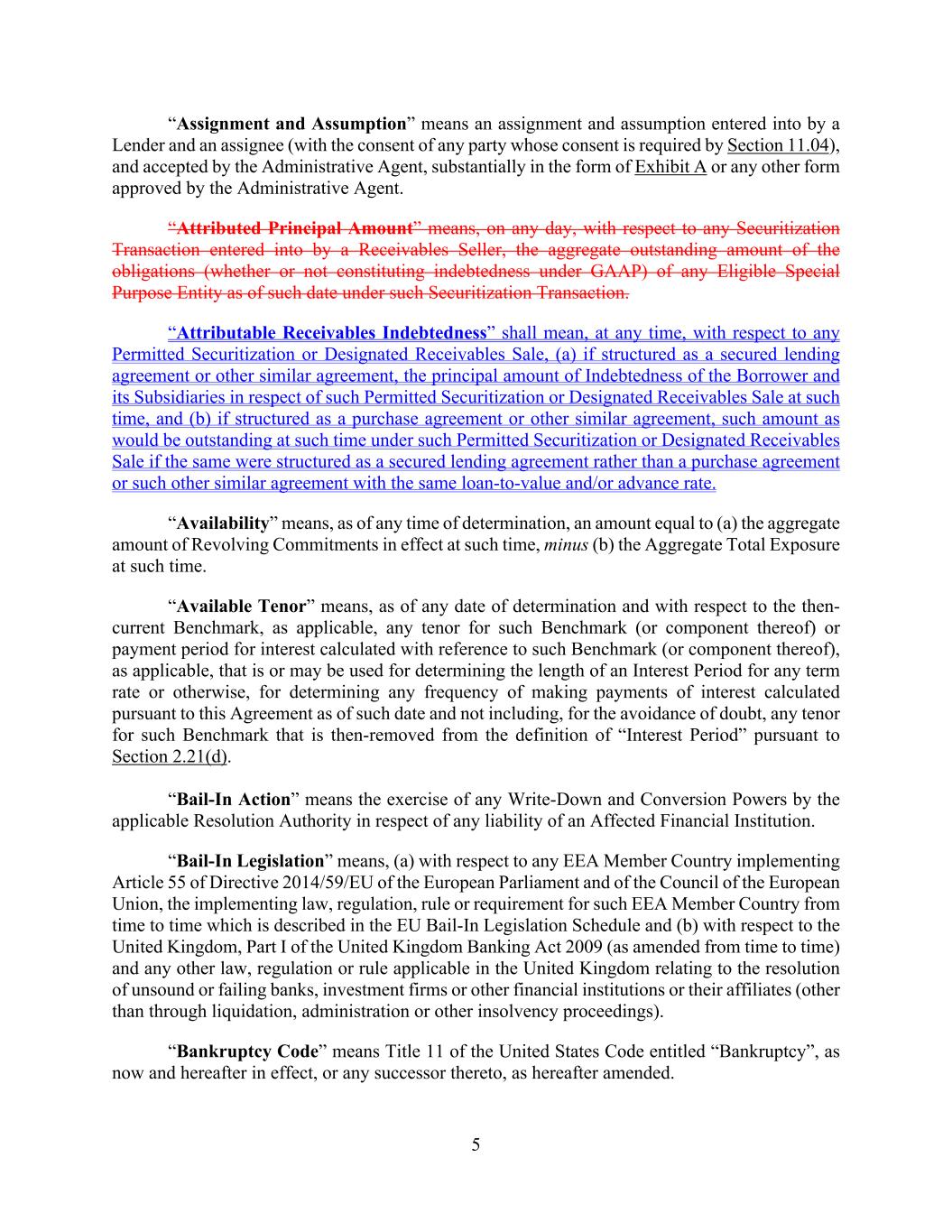5 “Assignment and Assumption” means an assignment and assumption entered into by a Lender and an assignee (with the consent of any party whose consent is required by Section 11.04), and accepted by the Administrative Agent, substantially in the form of Exhibit A or any other form approved by the Administrative Agent. “Attributed Principal Amount” means, on any day, with respect to any Securitization Transaction entered into by a Receivables Seller, the aggregate outstanding amount of the obligations (whether or not constituting indebtedness under GAAP) of any Eligible Special Purpose Entity as of such date under such Securitization Transaction. “Attributable Receivables Indebtedness” shall mean, at any time, with respect to any Permitted Securitization or Designated Receivables Sale, (a) if structured as a secured lending agreement or other similar agreement, the principal amount of Indebtedness of the Borrower and its Subsidiaries in respect of such Permitted Securitization or Designated Receivables Sale at such time, and (b) if structured as a purchase agreement or other similar agreement, such amount as would be outstanding at such time under such Permitted Securitization or Designated Receivables Sale if the same were structured as a secured lending agreement rather than a purchase agreement or such other similar agreement with the same loan-to-value and/or advance rate. “Availability” means, as of any time of determination, an amount equal to (a) the aggregate amount of Revolving Commitments in effect at such time, minus (b) the Aggregate Total Exposure at such time. “Available Tenor” means, as of any date of determination and with respect to the then- current Benchmark, as applicable, any tenor for such Benchmark (or component thereof) or payment period for interest calculated with reference to such Benchmark (or component thereof), as applicable, that is or may be used for determining the length of an Interest Period for any term rate or otherwise, for determining any frequency of making payments of interest calculated pursuant to this Agreement as of such date and not including, for the avoidance of doubt, any tenor for such Benchmark that is then-removed from the definition of “Interest Period” pursuant to Section 2.21(d). “Bail-In Action” means the exercise of any Write-Down and Conversion Powers by the applicable Resolution Authority in respect of any liability of an Affected Financial Institution. “Bail-In Legislation” means, (a) with respect to any EEA Member Country implementing Article 55 of Directive 2014/59/EU of the European Parliament and of the Council of the European Union, the implementing law, regulation, rule or requirement for such EEA Member Country from time to time which is described in the EU Bail-In Legislation Schedule and (b) with respect to the United Kingdom, Part I of the United Kingdom Banking Act 2009 (as amended from time to time) and any other law, regulation or rule applicable in the United Kingdom relating to the resolution of unsound or failing banks, investment firms or other financial institutions or their affiliates (other than through liquidation, administration or other insolvency proceedings). “Bankruptcy Code” means Title 11 of the United States Code entitled “Bankruptcy”, as now and hereafter in effect, or any successor thereto, as hereafter amended.