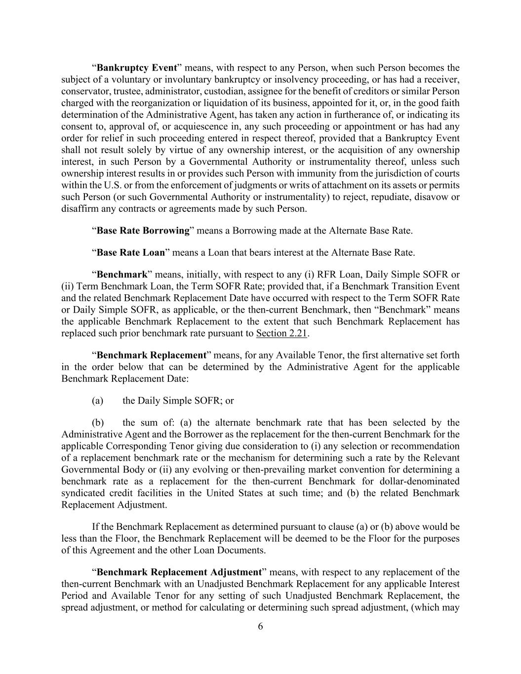6 “Bankruptcy Event” means, with respect to any Person, when such Person becomes the subject of a voluntary or involuntary bankruptcy or insolvency proceeding, or has had a receiver, conservator, trustee, administrator, custodian, assignee for the benefit of creditors or similar Person charged with the reorganization or liquidation of its business, appointed for it, or, in the good faith determination of the Administrative Agent, has taken any action in furtherance of, or indicating its consent to, approval of, or acquiescence in, any such proceeding or appointment or has had any order for relief in such proceeding entered in respect thereof, provided that a Bankruptcy Event shall not result solely by virtue of any ownership interest, or the acquisition of any ownership interest, in such Person by a Governmental Authority or instrumentality thereof, unless such ownership interest results in or provides such Person with immunity from the jurisdiction of courts within the U.S. or from the enforcement of judgments or writs of attachment on its assets or permits such Person (or such Governmental Authority or instrumentality) to reject, repudiate, disavow or disaffirm any contracts or agreements made by such Person. “Base Rate Borrowing” means a Borrowing made at the Alternate Base Rate. “Base Rate Loan” means a Loan that bears interest at the Alternate Base Rate. “Benchmark” means, initially, with respect to any (i) RFR Loan, Daily Simple SOFR or (ii) Term Benchmark Loan, the Term SOFR Rate; provided that, if a Benchmark Transition Event and the related Benchmark Replacement Date have occurred with respect to the Term SOFR Rate or Daily Simple SOFR, as applicable, or the then-current Benchmark, then “Benchmark” means the applicable Benchmark Replacement to the extent that such Benchmark Replacement has replaced such prior benchmark rate pursuant to Section 2.21. “Benchmark Replacement” means, for any Available Tenor, the first alternative set forth in the order below that can be determined by the Administrative Agent for the applicable Benchmark Replacement Date: (a) the Daily Simple SOFR; or (b) the sum of: (a) the alternate benchmark rate that has been selected by the Administrative Agent and the Borrower as the replacement for the then-current Benchmark for the applicable Corresponding Tenor giving due consideration to (i) any selection or recommendation of a replacement benchmark rate or the mechanism for determining such a rate by the Relevant Governmental Body or (ii) any evolving or then-prevailing market convention for determining a benchmark rate as a replacement for the then-current Benchmark for dollar-denominated syndicated credit facilities in the United States at such time; and (b) the related Benchmark Replacement Adjustment. If the Benchmark Replacement as determined pursuant to clause (a) or (b) above would be less than the Floor, the Benchmark Replacement will be deemed to be the Floor for the purposes of this Agreement and the other Loan Documents. “Benchmark Replacement Adjustment” means, with respect to any replacement of the then-current Benchmark with an Unadjusted Benchmark Replacement for any applicable Interest Period and Available Tenor for any setting of such Unadjusted Benchmark Replacement, the spread adjustment, or method for calculating or determining such spread adjustment, (which may
