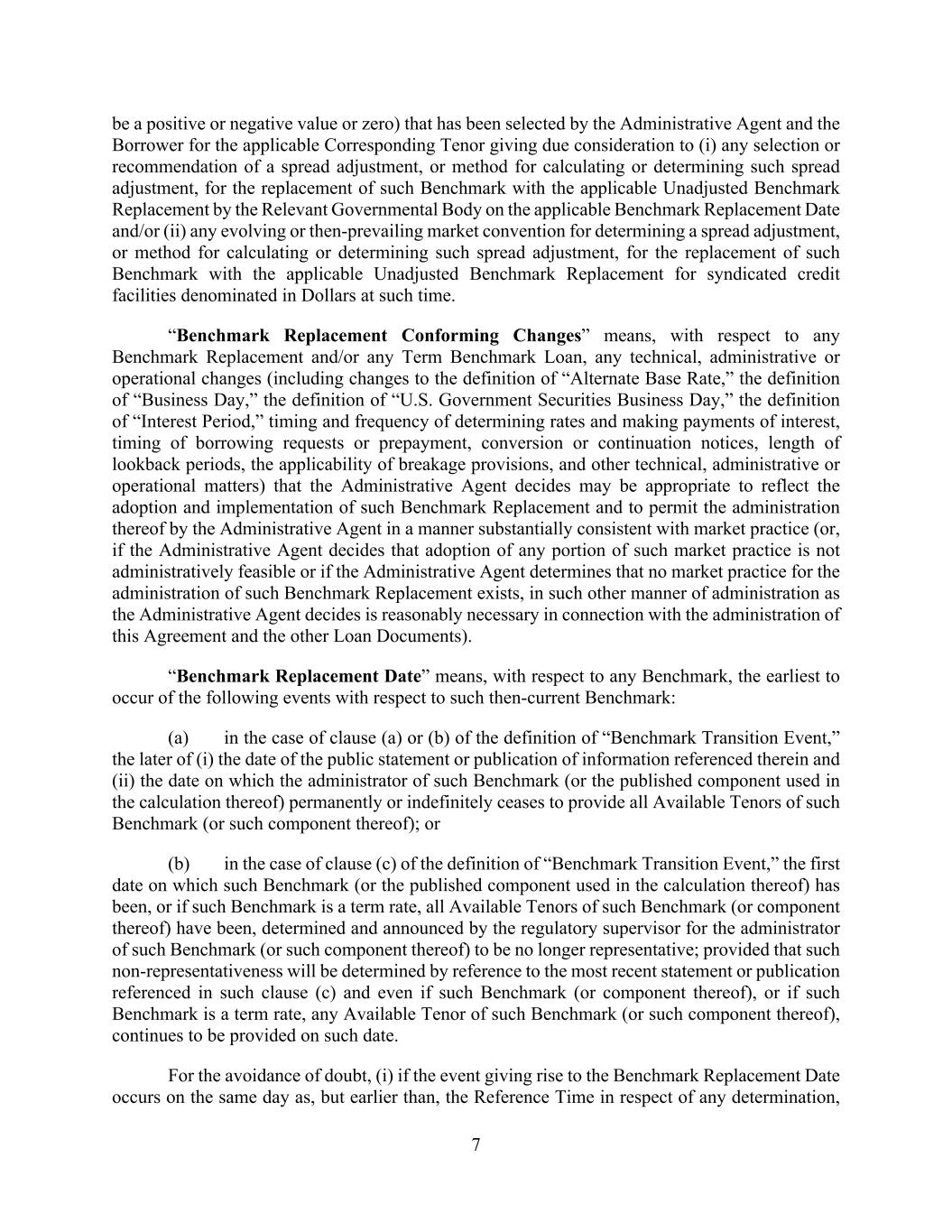 7 be a positive or negative value or zero) that has been selected by the Administrative Agent and the Borrower for the applicable Corresponding Tenor giving due consideration to (i) any selection or recommendation of a spread adjustment, or method for calculating or determining such spread adjustment, for the replacement of such Benchmark with the applicable Unadjusted Benchmark Replacement by the Relevant Governmental Body on the applicable Benchmark Replacement Date and/or (ii) any evolving or then-prevailing market convention for determining a spread adjustment, or method for calculating or determining such spread adjustment, for the replacement of such Benchmark with the applicable Unadjusted Benchmark Replacement for syndicated credit facilities denominated in Dollars at such time. “Benchmark Replacement Conforming Changes” means, with respect to any Benchmark Replacement and/or any Term Benchmark Loan, any technical, administrative or operational changes (including changes to the definition of “Alternate Base Rate,” the definition of “Business Day,” the definition of “U.S. Government Securities Business Day,” the definition of “Interest Period,” timing and frequency of determining rates and making payments of interest, timing of borrowing requests or prepayment, conversion or continuation notices, length of lookback periods, the applicability of breakage provisions, and other technical, administrative or operational matters) that the Administrative Agent decides may be appropriate to reflect the adoption and implementation of such Benchmark Replacement and to permit the administration thereof by the Administrative Agent in a manner substantially consistent with market practice (or, if the Administrative Agent decides that adoption of any portion of such market practice is not administratively feasible or if the Administrative Agent determines that no market practice for the administration of such Benchmark Replacement exists, in such other manner of administration as the Administrative Agent decides is reasonably necessary in connection with the administration of this Agreement and the other Loan Documents). “Benchmark Replacement Date” means, with respect to any Benchmark, the earliest to occur of the following events with respect to such then-current Benchmark: (a) in the case of clause (a) or (b) of the definition of “Benchmark Transition Event,” the later of (i) the date of the public statement or publication of information referenced therein and (ii) the date on which the administrator of such Benchmark (or the published component used in the calculation thereof) permanently or indefinitely ceases to provide all Available Tenors of such Benchmark (or such component thereof); or (b) in the case of clause (c) of the definition of “Benchmark Transition Event,” the first date on which such Benchmark (or the published component used in the calculation thereof) has been, or if such Benchmark is a term rate, all Available Tenors of such Benchmark (or component thereof) have been, determined and announced by the regulatory supervisor for the administrator of such Benchmark (or such component thereof) to be no longer representative; provided that such non-representativeness will be determined by reference to the most recent statement or publication referenced in such clause (c) and even if such Benchmark (or component thereof), or if such Benchmark is a term rate, any Available Tenor of such Benchmark (or such component thereof), continues to be provided on such date. For the avoidance of doubt, (i) if the event giving rise to the Benchmark Replacement Date occurs on the same day as, but earlier than, the Reference Time in respect of any determination,