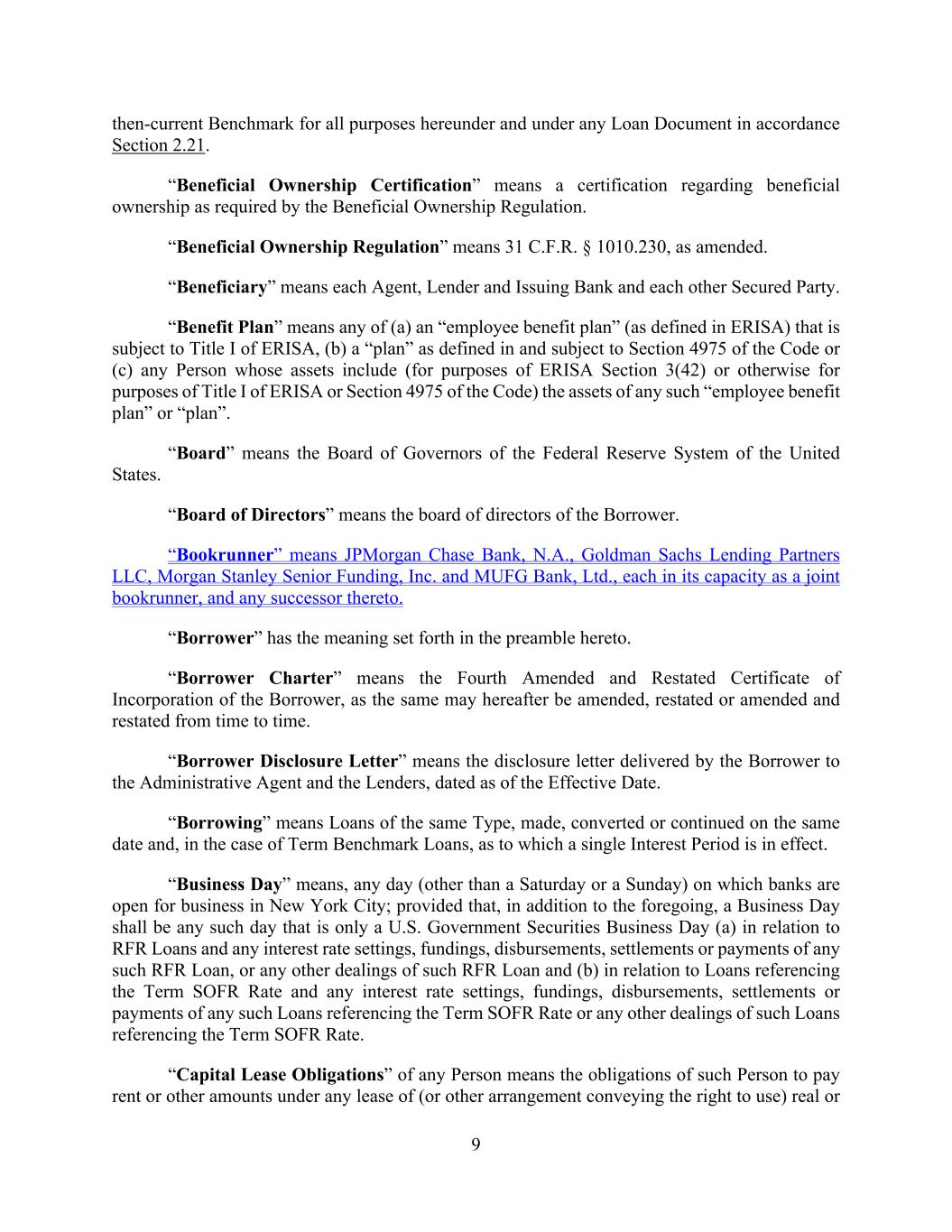 9 then-current Benchmark for all purposes hereunder and under any Loan Document in accordance Section 2.21. “Beneficial Ownership Certification” means a certification regarding beneficial ownership as required by the Beneficial Ownership Regulation. “Beneficial Ownership Regulation” means 31 C.F.R. § 1010.230, as amended. “Beneficiary” means each Agent, Lender and Issuing Bank and each other Secured Party. “Benefit Plan” means any of (a) an “employee benefit plan” (as defined in ERISA) that is subject to Title I of ERISA, (b) a “plan” as defined in and subject to Section 4975 of the Code or (c) any Person whose assets include (for purposes of ERISA Section 3(42) or otherwise for purposes of Title I of ERISA or Section 4975 of the Code) the assets of any such “employee benefit plan” or “plan”. “Board” means the Board of Governors of the Federal Reserve System of the United States. “Board of Directors” means the board of directors of the Borrower. “Bookrunner” means JPMorgan Chase Bank, N.A., Goldman Sachs Lending Partners LLC, Morgan Stanley Senior Funding, Inc. and MUFG Bank, Ltd., each in its capacity as a joint bookrunner, and any successor thereto. “Borrower” has the meaning set forth in the preamble hereto. “Borrower Charter” means the Fourth Amended and Restated Certificate of Incorporation of the Borrower, as the same may hereafter be amended, restated or amended and restated from time to time. “Borrower Disclosure Letter” means the disclosure letter delivered by the Borrower to the Administrative Agent and the Lenders, dated as of the Effective Date. “Borrowing” means Loans of the same Type, made, converted or continued on the same date and, in the case of Term Benchmark Loans, as to which a single Interest Period is in effect. “Business Day” means, any day (other than a Saturday or a Sunday) on which banks are open for business in New York City; provided that, in addition to the foregoing, a Business Day shall be any such day that is only a U.S. Government Securities Business Day (a) in relation to RFR Loans and any interest rate settings, fundings, disbursements, settlements or payments of any such RFR Loan, or any other dealings of such RFR Loan and (b) in relation to Loans referencing the Term SOFR Rate and any interest rate settings, fundings, disbursements, settlements or payments of any such Loans referencing the Term SOFR Rate or any other dealings of such Loans referencing the Term SOFR Rate. “Capital Lease Obligations” of any Person means the obligations of such Person to pay rent or other amounts under any lease of (or other arrangement conveying the right to use) real or