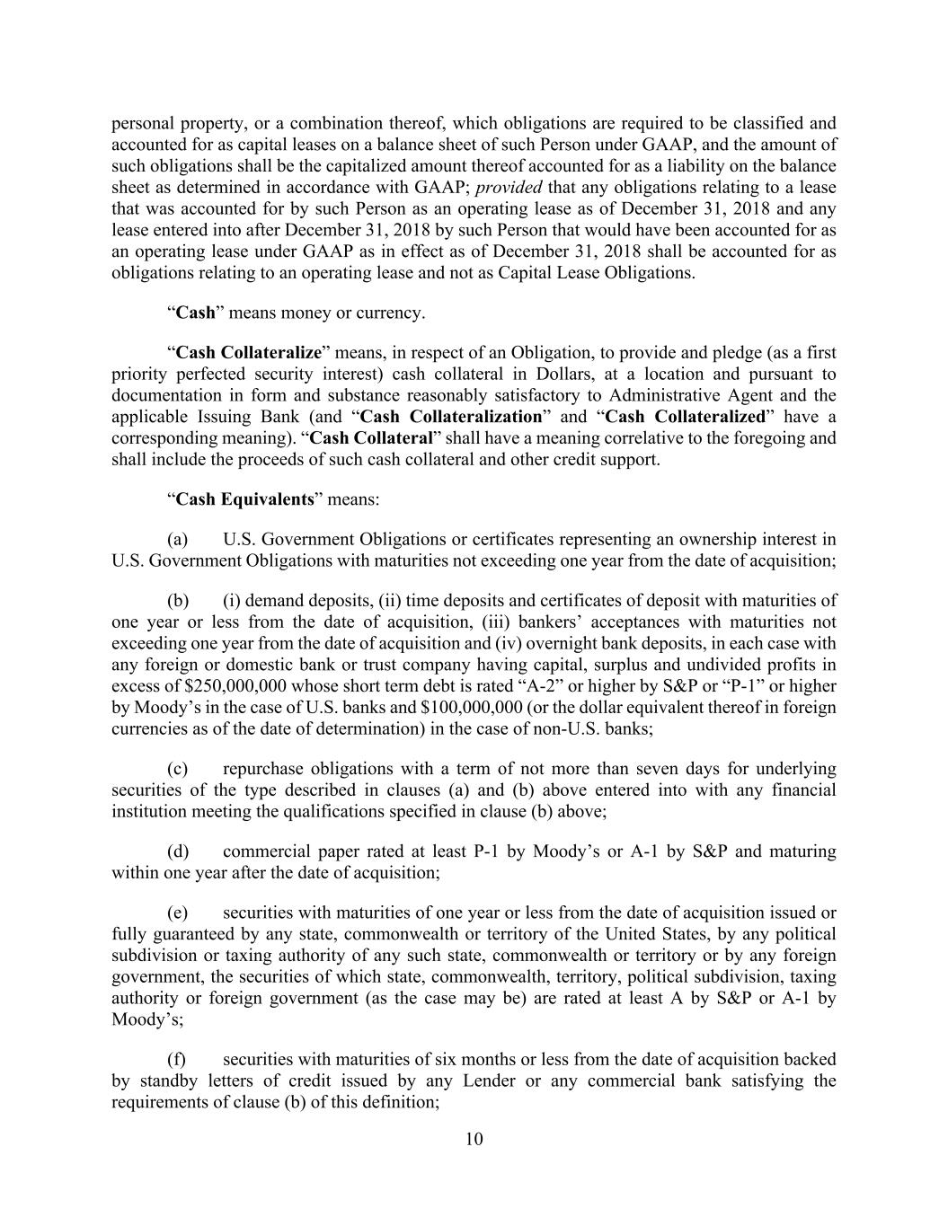 10 personal property, or a combination thereof, which obligations are required to be classified and accounted for as capital leases on a balance sheet of such Person under GAAP, and the amount of such obligations shall be the capitalized amount thereof accounted for as a liability on the balance sheet as determined in accordance with GAAP; provided that any obligations relating to a lease that was accounted for by such Person as an operating lease as of December 31, 2018 and any lease entered into after December 31, 2018 by such Person that would have been accounted for as an operating lease under GAAP as in effect as of December 31, 2018 shall be accounted for as obligations relating to an operating lease and not as Capital Lease Obligations. “Cash” means money or currency. “Cash Collateralize” means, in respect of an Obligation, to provide and pledge (as a first priority perfected security interest) cash collateral in Dollars, at a location and pursuant to documentation in form and substance reasonably satisfactory to Administrative Agent and the applicable Issuing Bank (and “Cash Collateralization” and “Cash Collateralized” have a corresponding meaning). “Cash Collateral” shall have a meaning correlative to the foregoing and shall include the proceeds of such cash collateral and other credit support. “Cash Equivalents” means: (a) U.S. Government Obligations or certificates representing an ownership interest in U.S. Government Obligations with maturities not exceeding one year from the date of acquisition; (b) (i) demand deposits, (ii) time deposits and certificates of deposit with maturities of one year or less from the date of acquisition, (iii) bankers’ acceptances with maturities not exceeding one year from the date of acquisition and (iv) overnight bank deposits, in each case with any foreign or domestic bank or trust company having capital, surplus and undivided profits in excess of $250,000,000 whose short term debt is rated “A-2” or higher by S&P or “P-1” or higher by Moody’s in the case of U.S. banks and $100,000,000 (or the dollar equivalent thereof in foreign currencies as of the date of determination) in the case of non-U.S. banks; (c) repurchase obligations with a term of not more than seven days for underlying securities of the type described in clauses (a) and (b) above entered into with any financial institution meeting the qualifications specified in clause (b) above; (d) commercial paper rated at least P-1 by Moody’s or A-1 by S&P and maturing within one year after the date of acquisition; (e) securities with maturities of one year or less from the date of acquisition issued or fully guaranteed by any state, commonwealth or territory of the United States, by any political subdivision or taxing authority of any such state, commonwealth or territory or by any foreign government, the securities of which state, commonwealth, territory, political subdivision, taxing authority or foreign government (as the case may be) are rated at least A by S&P or A-1 by Moody’s; (f) securities with maturities of six months or less from the date of acquisition backed by standby letters of credit issued by any Lender or any commercial bank satisfying the requirements of clause (b) of this definition;
