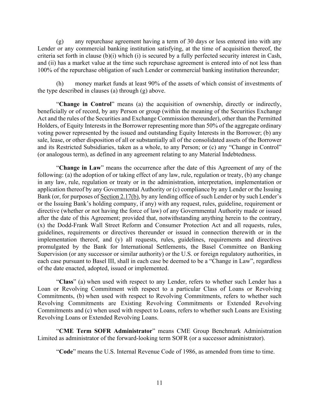 11 (g) any repurchase agreement having a term of 30 days or less entered into with any Lender or any commercial banking institution satisfying, at the time of acquisition thereof, the criteria set forth in clause (b)(i) which (i) is secured by a fully perfected security interest in Cash, and (ii) has a market value at the time such repurchase agreement is entered into of not less than 100% of the repurchase obligation of such Lender or commercial banking institution thereunder; (h) money market funds at least 90% of the assets of which consist of investments of the type described in clauses (a) through (g) above. “Change in Control” means (a) the acquisition of ownership, directly or indirectly, beneficially or of record, by any Person or group (within the meaning of the Securities Exchange Act and the rules of the Securities and Exchange Commission thereunder), other than the Permitted Holders, of Equity Interests in the Borrower representing more than 50% of the aggregate ordinary voting power represented by the issued and outstanding Equity Interests in the Borrower; (b) any sale, lease, or other disposition of all or substantially all of the consolidated assets of the Borrower and its Restricted Subsidiaries, taken as a whole, to any Person; or (c) any “Change in Control” (or analogous term), as defined in any agreement relating to any Material Indebtedness. “Change in Law” means the occurrence after the date of this Agreement of any of the following: (a) the adoption of or taking effect of any law, rule, regulation or treaty, (b) any change in any law, rule, regulation or treaty or in the administration, interpretation, implementation or application thereof by any Governmental Authority or (c) compliance by any Lender or the Issuing Bank (or, for purposes of Section 2.17(b), by any lending office of such Lender or by such Lender’s or the Issuing Bank’s holding company, if any) with any request, rules, guideline, requirement or directive (whether or not having the force of law) of any Governmental Authority made or issued after the date of this Agreement; provided that, notwithstanding anything herein to the contrary, (x) the Dodd-Frank Wall Street Reform and Consumer Protection Act and all requests, rules, guidelines, requirements or directives thereunder or issued in connection therewith or in the implementation thereof, and (y) all requests, rules, guidelines, requirements and directives promulgated by the Bank for International Settlements, the Basel Committee on Banking Supervision (or any successor or similar authority) or the U.S. or foreign regulatory authorities, in each case pursuant to Basel III, shall in each case be deemed to be a “Change in Law”, regardless of the date enacted, adopted, issued or implemented. “Class” (a) when used with respect to any Lender, refers to whether such Lender has a Loan or Revolving Commitment with respect to a particular Class of Loans or Revolving Commitments, (b) when used with respect to Revolving Commitments, refers to whether such Revolving Commitments are Existing Revolving Commitments or Extended Revolving Commitments and (c) when used with respect to Loans, refers to whether such Loans are Existing Revolving Loans or Extended Revolving Loans. “CME Term SOFR Administrator” means CME Group Benchmark Administration Limited as administrator of the forward-looking term SOFR (or a successor administrator). “Code” means the U.S. Internal Revenue Code of 1986, as amended from time to time.
