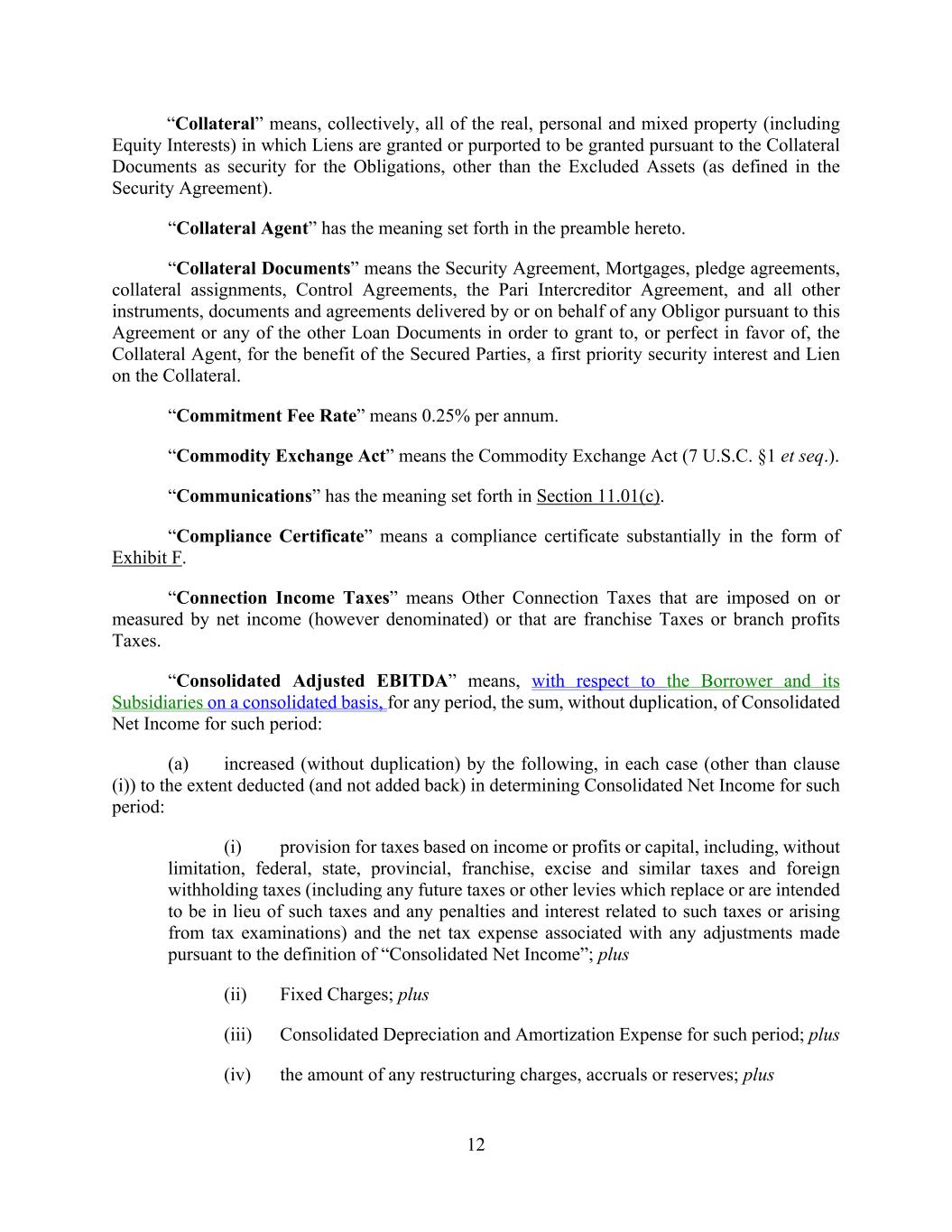 12 “Collateral” means, collectively, all of the real, personal and mixed property (including Equity Interests) in which Liens are granted or purported to be granted pursuant to the Collateral Documents as security for the Obligations, other than the Excluded Assets (as defined in the Security Agreement). “Collateral Agent” has the meaning set forth in the preamble hereto. “Collateral Documents” means the Security Agreement, Mortgages, pledge agreements, collateral assignments, Control Agreements, the Pari Intercreditor Agreement, and all other instruments, documents and agreements delivered by or on behalf of any Obligor pursuant to this Agreement or any of the other Loan Documents in order to grant to, or perfect in favor of, the Collateral Agent, for the benefit of the Secured Parties, a first priority security interest and Lien on the Collateral. “Commitment Fee Rate” means 0.25% per annum. “Commodity Exchange Act” means the Commodity Exchange Act (7 U.S.C. §1 et seq.). “Communications” has the meaning set forth in Section 11.01(c). “Compliance Certificate” means a compliance certificate substantially in the form of Exhibit F. “Connection Income Taxes” means Other Connection Taxes that are imposed on or measured by net income (however denominated) or that are franchise Taxes or branch profits Taxes. “Consolidated Adjusted EBITDA” means, with respect to the Borrower and its Subsidiaries on a consolidated basis, for any period, the sum, without duplication, of Consolidated Net Income for such period: (a) increased (without duplication) by the following, in each case (other than clause (i)) to the extent deducted (and not added back) in determining Consolidated Net Income for such period: (i) provision for taxes based on income or profits or capital, including, without limitation, federal, state, provincial, franchise, excise and similar taxes and foreign withholding taxes (including any future taxes or other levies which replace or are intended to be in lieu of such taxes and any penalties and interest related to such taxes or arising from tax examinations) and the net tax expense associated with any adjustments made pursuant to the definition of “Consolidated Net Income”; plus (ii) Fixed Charges; plus (iii) Consolidated Depreciation and Amortization Expense for such period; plus (iv) the amount of any restructuring charges, accruals or reserves; plus