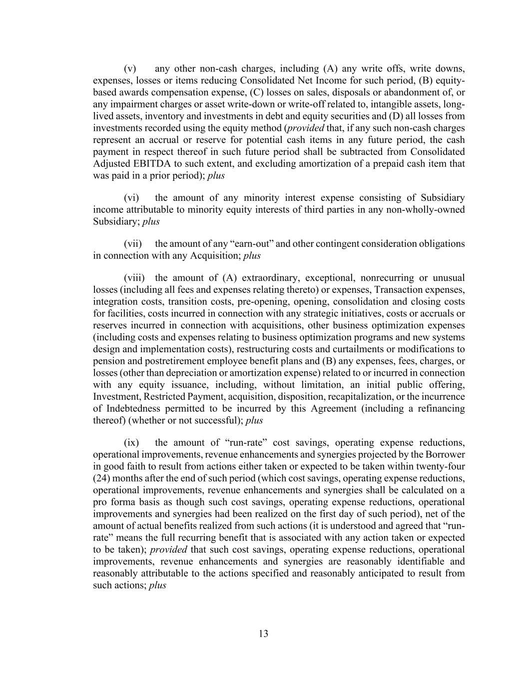13 (v) any other non-cash charges, including (A) any write offs, write downs, expenses, losses or items reducing Consolidated Net Income for such period, (B) equity- based awards compensation expense, (C) losses on sales, disposals or abandonment of, or any impairment charges or asset write-down or write-off related to, intangible assets, long- lived assets, inventory and investments in debt and equity securities and (D) all losses from investments recorded using the equity method (provided that, if any such non-cash charges represent an accrual or reserve for potential cash items in any future period, the cash payment in respect thereof in such future period shall be subtracted from Consolidated Adjusted EBITDA to such extent, and excluding amortization of a prepaid cash item that was paid in a prior period); plus (vi) the amount of any minority interest expense consisting of Subsidiary income attributable to minority equity interests of third parties in any non-wholly-owned Subsidiary; plus (vii) the amount of any “earn-out” and other contingent consideration obligations in connection with any Acquisition; plus (viii) the amount of (A) extraordinary, exceptional, nonrecurring or unusual losses (including all fees and expenses relating thereto) or expenses, Transaction expenses, integration costs, transition costs, pre-opening, opening, consolidation and closing costs for facilities, costs incurred in connection with any strategic initiatives, costs or accruals or reserves incurred in connection with acquisitions, other business optimization expenses (including costs and expenses relating to business optimization programs and new systems design and implementation costs), restructuring costs and curtailments or modifications to pension and postretirement employee benefit plans and (B) any expenses, fees, charges, or losses (other than depreciation or amortization expense) related to or incurred in connection with any equity issuance, including, without limitation, an initial public offering, Investment, Restricted Payment, acquisition, disposition, recapitalization, or the incurrence of Indebtedness permitted to be incurred by this Agreement (including a refinancing thereof) (whether or not successful); plus (ix) the amount of “run-rate” cost savings, operating expense reductions, operational improvements, revenue enhancements and synergies projected by the Borrower in good faith to result from actions either taken or expected to be taken within twenty-four (24) months after the end of such period (which cost savings, operating expense reductions, operational improvements, revenue enhancements and synergies shall be calculated on a pro forma basis as though such cost savings, operating expense reductions, operational improvements and synergies had been realized on the first day of such period), net of the amount of actual benefits realized from such actions (it is understood and agreed that “run- rate” means the full recurring benefit that is associated with any action taken or expected to be taken); provided that such cost savings, operating expense reductions, operational improvements, revenue enhancements and synergies are reasonably identifiable and reasonably attributable to the actions specified and reasonably anticipated to result from such actions; plus