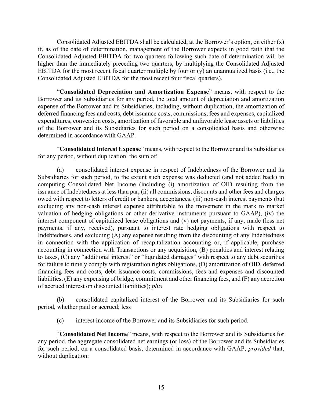 15 Consolidated Adjusted EBITDA shall be calculated, at the Borrower’s option, on either (x) if, as of the date of determination, management of the Borrower expects in good faith that the Consolidated Adjusted EBITDA for two quarters following such date of determination will be higher than the immediately preceding two quarters, by multiplying the Consolidated Adjusted EBITDA for the most recent fiscal quarter multiple by four or (y) an unannualized basis (i.e., the Consolidated Adjusted EBITDA for the most recent four fiscal quarters). “Consolidated Depreciation and Amortization Expense” means, with respect to the Borrower and its Subsidiaries for any period, the total amount of depreciation and amortization expense of the Borrower and its Subsidiaries, including, without duplication, the amortization of deferred financing fees and costs, debt issuance costs, commissions, fees and expenses, capitalized expenditures, conversion costs, amortization of favorable and unfavorable lease assets or liabilities of the Borrower and its Subsidiaries for such period on a consolidated basis and otherwise determined in accordance with GAAP. “Consolidated Interest Expense” means, with respect to the Borrower and its Subsidiaries for any period, without duplication, the sum of: (a) consolidated interest expense in respect of Indebtedness of the Borrower and its Subsidiaries for such period, to the extent such expense was deducted (and not added back) in computing Consolidated Net Income (including (i) amortization of OID resulting from the issuance of Indebtedness at less than par, (ii) all commissions, discounts and other fees and charges owed with respect to letters of credit or bankers, acceptances, (iii) non-cash interest payments (but excluding any non-cash interest expense attributable to the movement in the mark to market valuation of hedging obligations or other derivative instruments pursuant to GAAP), (iv) the interest component of capitalized lease obligations and (v) net payments, if any, made (less net payments, if any, received), pursuant to interest rate hedging obligations with respect to Indebtedness, and excluding (A) any expense resulting from the discounting of any Indebtedness in connection with the application of recapitalization accounting or, if applicable, purchase accounting in connection with Transactions or any acquisition, (B) penalties and interest relating to taxes, (C) any “additional interest” or “liquidated damages” with respect to any debt securities for failure to timely comply with registration rights obligations, (D) amortization of OID, deferred financing fees and costs, debt issuance costs, commissions, fees and expenses and discounted liabilities, (E) any expensing of bridge, commitment and other financing fees, and (F) any accretion of accrued interest on discounted liabilities); plus (b) consolidated capitalized interest of the Borrower and its Subsidiaries for such period, whether paid or accrued; less (c) interest income of the Borrower and its Subsidiaries for such period. “Consolidated Net Income” means, with respect to the Borrower and its Subsidiaries for any period, the aggregate consolidated net earnings (or loss) of the Borrower and its Subsidiaries for such period, on a consolidated basis, determined in accordance with GAAP; provided that, without duplication: