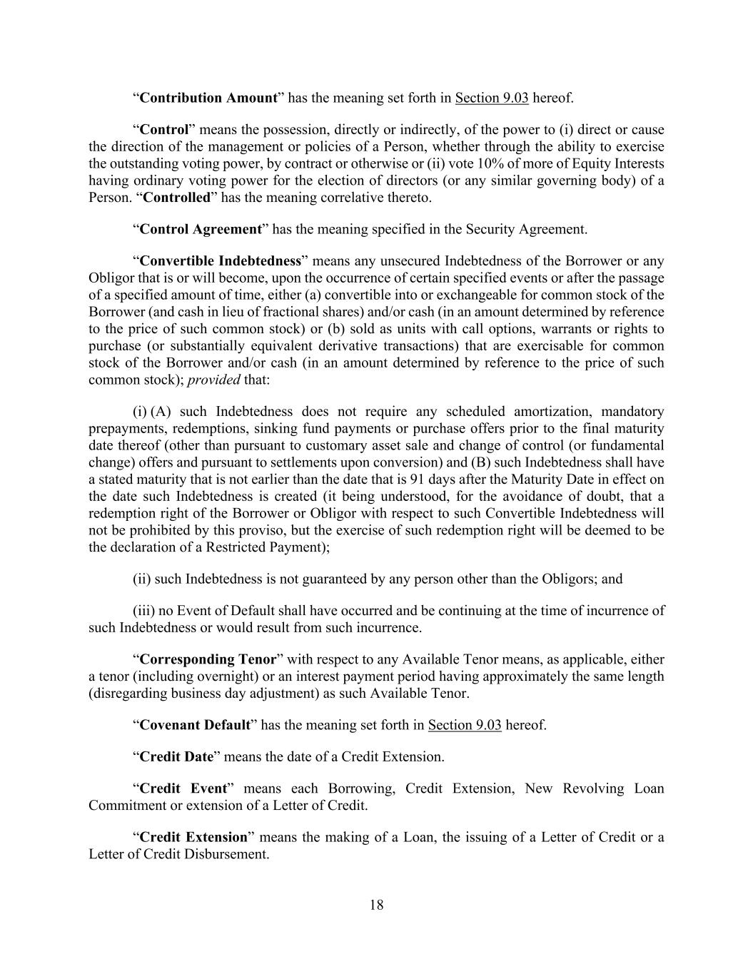 18 “Contribution Amount” has the meaning set forth in Section 9.03 hereof. “Control” means the possession, directly or indirectly, of the power to (i) direct or cause the direction of the management or policies of a Person, whether through the ability to exercise the outstanding voting power, by contract or otherwise or (ii) vote 10% of more of Equity Interests having ordinary voting power for the election of directors (or any similar governing body) of a Person. “Controlled” has the meaning correlative thereto. “Control Agreement” has the meaning specified in the Security Agreement. “Convertible Indebtedness” means any unsecured Indebtedness of the Borrower or any Obligor that is or will become, upon the occurrence of certain specified events or after the passage of a specified amount of time, either (a) convertible into or exchangeable for common stock of the Borrower (and cash in lieu of fractional shares) and/or cash (in an amount determined by reference to the price of such common stock) or (b) sold as units with call options, warrants or rights to purchase (or substantially equivalent derivative transactions) that are exercisable for common stock of the Borrower and/or cash (in an amount determined by reference to the price of such common stock); provided that: (i) (A) such Indebtedness does not require any scheduled amortization, mandatory prepayments, redemptions, sinking fund payments or purchase offers prior to the final maturity date thereof (other than pursuant to customary asset sale and change of control (or fundamental change) offers and pursuant to settlements upon conversion) and (B) such Indebtedness shall have a stated maturity that is not earlier than the date that is 91 days after the Maturity Date in effect on the date such Indebtedness is created (it being understood, for the avoidance of doubt, that a redemption right of the Borrower or Obligor with respect to such Convertible Indebtedness will not be prohibited by this proviso, but the exercise of such redemption right will be deemed to be the declaration of a Restricted Payment); (ii) such Indebtedness is not guaranteed by any person other than the Obligors; and (iii) no Event of Default shall have occurred and be continuing at the time of incurrence of such Indebtedness or would result from such incurrence. “Corresponding Tenor” with respect to any Available Tenor means, as applicable, either a tenor (including overnight) or an interest payment period having approximately the same length (disregarding business day adjustment) as such Available Tenor. “Covenant Default” has the meaning set forth in Section 9.03 hereof. “Credit Date” means the date of a Credit Extension. “Credit Event” means each Borrowing, Credit Extension, New Revolving Loan Commitment or extension of a Letter of Credit. “Credit Extension” means the making of a Loan, the issuing of a Letter of Credit or a Letter of Credit Disbursement.