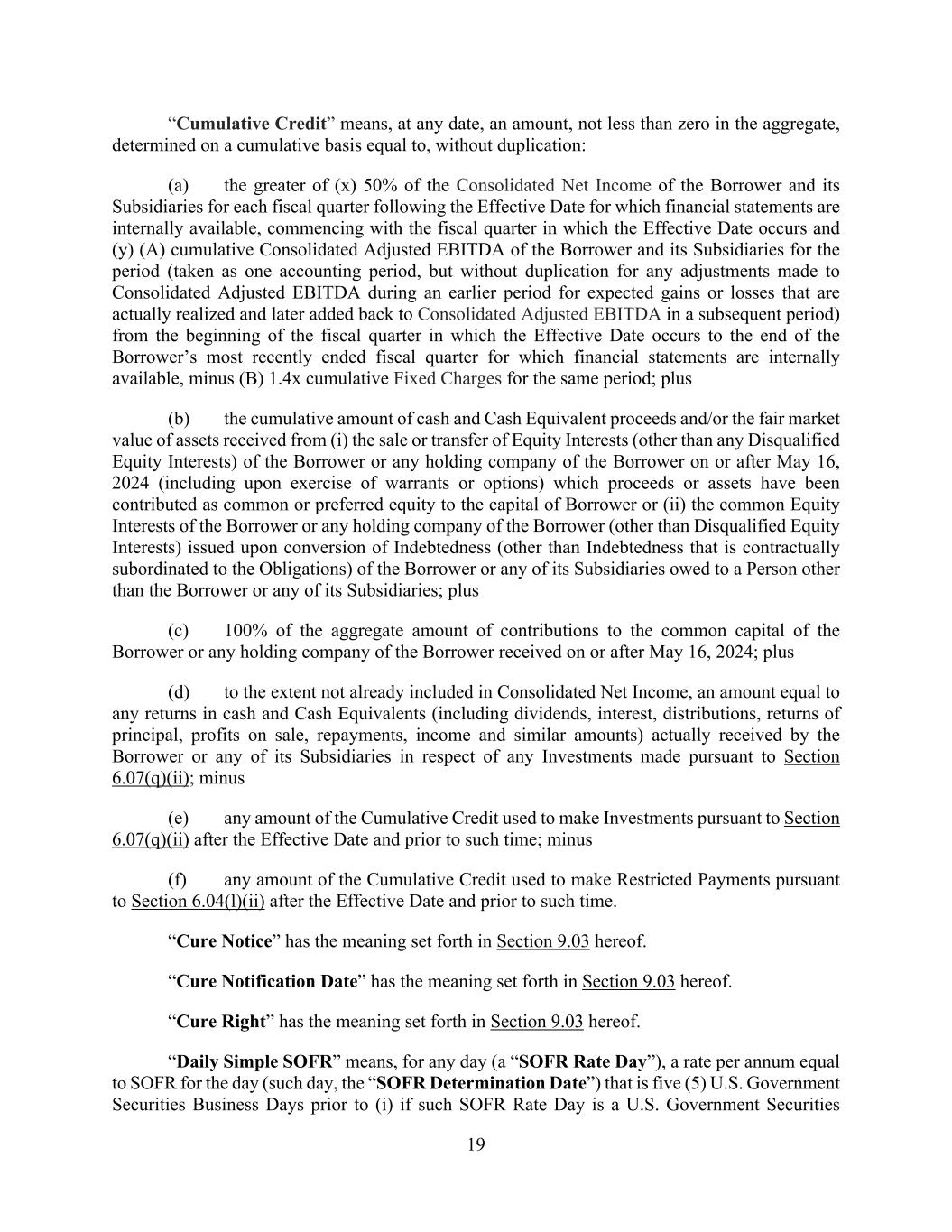 19 “Cumulative Credit” means, at any date, an amount, not less than zero in the aggregate, determined on a cumulative basis equal to, without duplication: (a) the greater of (x) 50% of the Consolidated Net Income of the Borrower and its Subsidiaries for each fiscal quarter following the Effective Date for which financial statements are internally available, commencing with the fiscal quarter in which the Effective Date occurs and (y) (A) cumulative Consolidated Adjusted EBITDA of the Borrower and its Subsidiaries for the period (taken as one accounting period, but without duplication for any adjustments made to Consolidated Adjusted EBITDA during an earlier period for expected gains or losses that are actually realized and later added back to Consolidated Adjusted EBITDA in a subsequent period) from the beginning of the fiscal quarter in which the Effective Date occurs to the end of the Borrower’s most recently ended fiscal quarter for which financial statements are internally available, minus (B) 1.4x cumulative Fixed Charges for the same period; plus (b) the cumulative amount of cash and Cash Equivalent proceeds and/or the fair market value of assets received from (i) the sale or transfer of Equity Interests (other than any Disqualified Equity Interests) of the Borrower or any holding company of the Borrower on or after May 16, 2024 (including upon exercise of warrants or options) which proceeds or assets have been contributed as common or preferred equity to the capital of Borrower or (ii) the common Equity Interests of the Borrower or any holding company of the Borrower (other than Disqualified Equity Interests) issued upon conversion of Indebtedness (other than Indebtedness that is contractually subordinated to the Obligations) of the Borrower or any of its Subsidiaries owed to a Person other than the Borrower or any of its Subsidiaries; plus (c) 100% of the aggregate amount of contributions to the common capital of the Borrower or any holding company of the Borrower received on or after May 16, 2024; plus (d) to the extent not already included in Consolidated Net Income, an amount equal to any returns in cash and Cash Equivalents (including dividends, interest, distributions, returns of principal, profits on sale, repayments, income and similar amounts) actually received by the Borrower or any of its Subsidiaries in respect of any Investments made pursuant to Section 6.07(q)(ii); minus (e) any amount of the Cumulative Credit used to make Investments pursuant to Section 6.07(q)(ii) after the Effective Date and prior to such time; minus (f) any amount of the Cumulative Credit used to make Restricted Payments pursuant to Section 6.04(l)(ii) after the Effective Date and prior to such time. “Cure Notice” has the meaning set forth in Section 9.03 hereof. “Cure Notification Date” has the meaning set forth in Section 9.03 hereof. “Cure Right” has the meaning set forth in Section 9.03 hereof. “Daily Simple SOFR” means, for any day (a “SOFR Rate Day”), a rate per annum equal to SOFR for the day (such day, the “SOFR Determination Date”) that is five (5) U.S. Government Securities Business Days prior to (i) if such SOFR Rate Day is a U.S. Government Securities