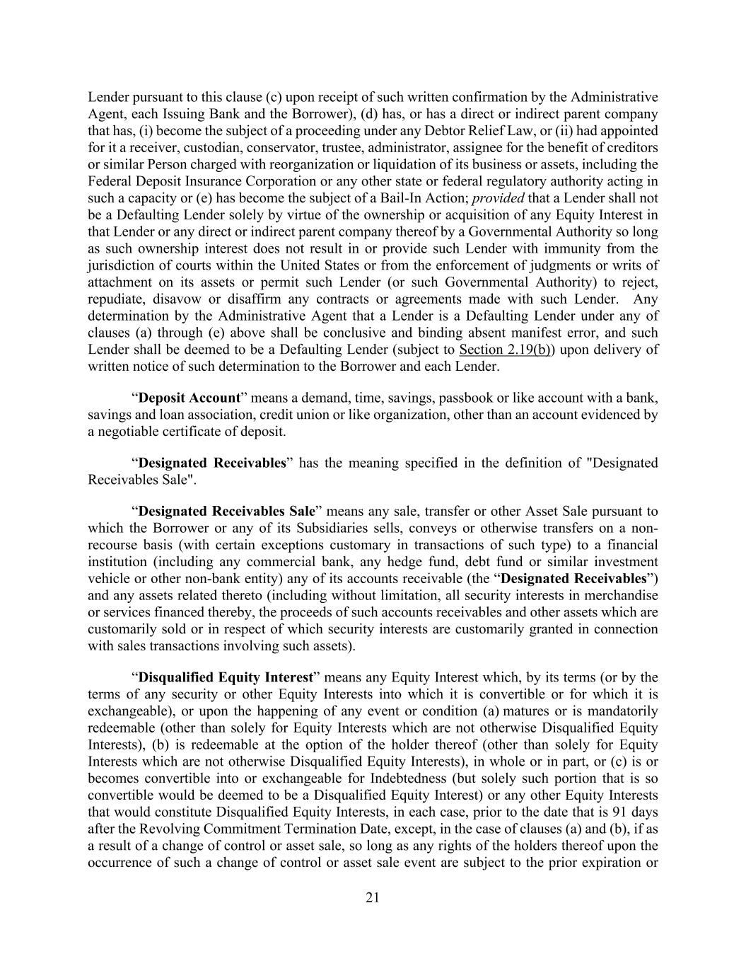 21 Lender pursuant to this clause (c) upon receipt of such written confirmation by the Administrative Agent, each Issuing Bank and the Borrower), (d) has, or has a direct or indirect parent company that has, (i) become the subject of a proceeding under any Debtor Relief Law, or (ii) had appointed for it a receiver, custodian, conservator, trustee, administrator, assignee for the benefit of creditors or similar Person charged with reorganization or liquidation of its business or assets, including the Federal Deposit Insurance Corporation or any other state or federal regulatory authority acting in such a capacity or (e) has become the subject of a Bail-In Action; provided that a Lender shall not be a Defaulting Lender solely by virtue of the ownership or acquisition of any Equity Interest in that Lender or any direct or indirect parent company thereof by a Governmental Authority so long as such ownership interest does not result in or provide such Lender with immunity from the jurisdiction of courts within the United States or from the enforcement of judgments or writs of attachment on its assets or permit such Lender (or such Governmental Authority) to reject, repudiate, disavow or disaffirm any contracts or agreements made with such Lender. Any determination by the Administrative Agent that a Lender is a Defaulting Lender under any of clauses (a) through (e) above shall be conclusive and binding absent manifest error, and such Lender shall be deemed to be a Defaulting Lender (subject to Section 2.19(b)) upon delivery of written notice of such determination to the Borrower and each Lender. “Deposit Account” means a demand, time, savings, passbook or like account with a bank, savings and loan association, credit union or like organization, other than an account evidenced by a negotiable certificate of deposit. “Designated Receivables” has the meaning specified in the definition of "Designated Receivables Sale". “Designated Receivables Sale” means any sale, transfer or other Asset Sale pursuant to which the Borrower or any of its Subsidiaries sells, conveys or otherwise transfers on a non- recourse basis (with certain exceptions customary in transactions of such type) to a financial institution (including any commercial bank, any hedge fund, debt fund or similar investment vehicle or other non-bank entity) any of its accounts receivable (the “Designated Receivables”) and any assets related thereto (including without limitation, all security interests in merchandise or services financed thereby, the proceeds of such accounts receivables and other assets which are customarily sold or in respect of which security interests are customarily granted in connection with sales transactions involving such assets). “Disqualified Equity Interest” means any Equity Interest which, by its terms (or by the terms of any security or other Equity Interests into which it is convertible or for which it is exchangeable), or upon the happening of any event or condition (a) matures or is mandatorily redeemable (other than solely for Equity Interests which are not otherwise Disqualified Equity Interests), (b) is redeemable at the option of the holder thereof (other than solely for Equity Interests which are not otherwise Disqualified Equity Interests), in whole or in part, or (c) is or becomes convertible into or exchangeable for Indebtedness (but solely such portion that is so convertible would be deemed to be a Disqualified Equity Interest) or any other Equity Interests that would constitute Disqualified Equity Interests, in each case, prior to the date that is 91 days after the Revolving Commitment Termination Date, except, in the case of clauses (a) and (b), if as a result of a change of control or asset sale, so long as any rights of the holders thereof upon the occurrence of such a change of control or asset sale event are subject to the prior expiration or