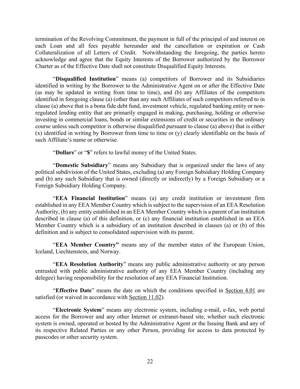 22 termination of the Revolving Commitment, the payment in full of the principal of and interest on each Loan and all fees payable hereunder and the cancellation or expiration or Cash Collateralization of all Letters of Credit. Notwithstanding the foregoing, the parties hereto acknowledge and agree that the Equity Interests of the Borrower authorized by the Borrower Charter as of the Effective Date shall not constitute Disqualified Equity Interests. “Disqualified Institution” means (a) competitors of Borrower and its Subsidiaries identified in writing by the Borrower to the Administrative Agent on or after the Effective Date (as may be updated in writing from time to time), and (b) any Affiliates of the competitors identified in foregoing clause (a) (other than any such Affiliates of such competitors referred to in clause (a) above that is a bona fide debt fund, investment vehicle, regulated banking entity or non- regulated lending entity that are primarily engaged in making, purchasing, holding or otherwise investing in commercial loans, bonds or similar extensions of credit or securities in the ordinary course unless such competitor is otherwise disqualified pursuant to clause (a) above) that is either (x) identified in writing by Borrower from time to time or (y) clearly identifiable on the basis of such Affiliate’s name or otherwise. “Dollars” or “$” refers to lawful money of the United States. “Domestic Subsidiary” means any Subsidiary that is organized under the laws of any political subdivision of the United States, excluding (a) any Foreign Subsidiary Holding Company and (b) any such Subsidiary that is owned (directly or indirectly) by a Foreign Subsidiary or a Foreign Subsidiary Holding Company. “EEA Financial Institution” means (a) any credit institution or investment firm established in any EEA Member Country which is subject to the supervision of an EEA Resolution Authority, (b) any entity established in an EEA Member Country which is a parent of an institution described in clause (a) of this definition, or (c) any financial institution established in an EEA Member Country which is a subsidiary of an institution described in clauses (a) or (b) of this definition and is subject to consolidated supervision with its parent. “EEA Member Country” means any of the member states of the European Union, Iceland, Liechtenstein, and Norway. “EEA Resolution Authority” means any public administrative authority or any person entrusted with public administrative authority of any EEA Member Country (including any delegee) having responsibility for the resolution of any EEA Financial Institution. “Effective Date” means the date on which the conditions specified in Section 4.01 are satisfied (or waived in accordance with Section 11.02). “Electronic System” means any electronic system, including e-mail, e-fax, web portal access for the Borrower and any other Internet or extranet-based site, whether such electronic system is owned, operated or hosted by the Administrative Agent or the Issuing Bank and any of its respective Related Parties or any other Person, providing for access to data protected by passcodes or other security system.