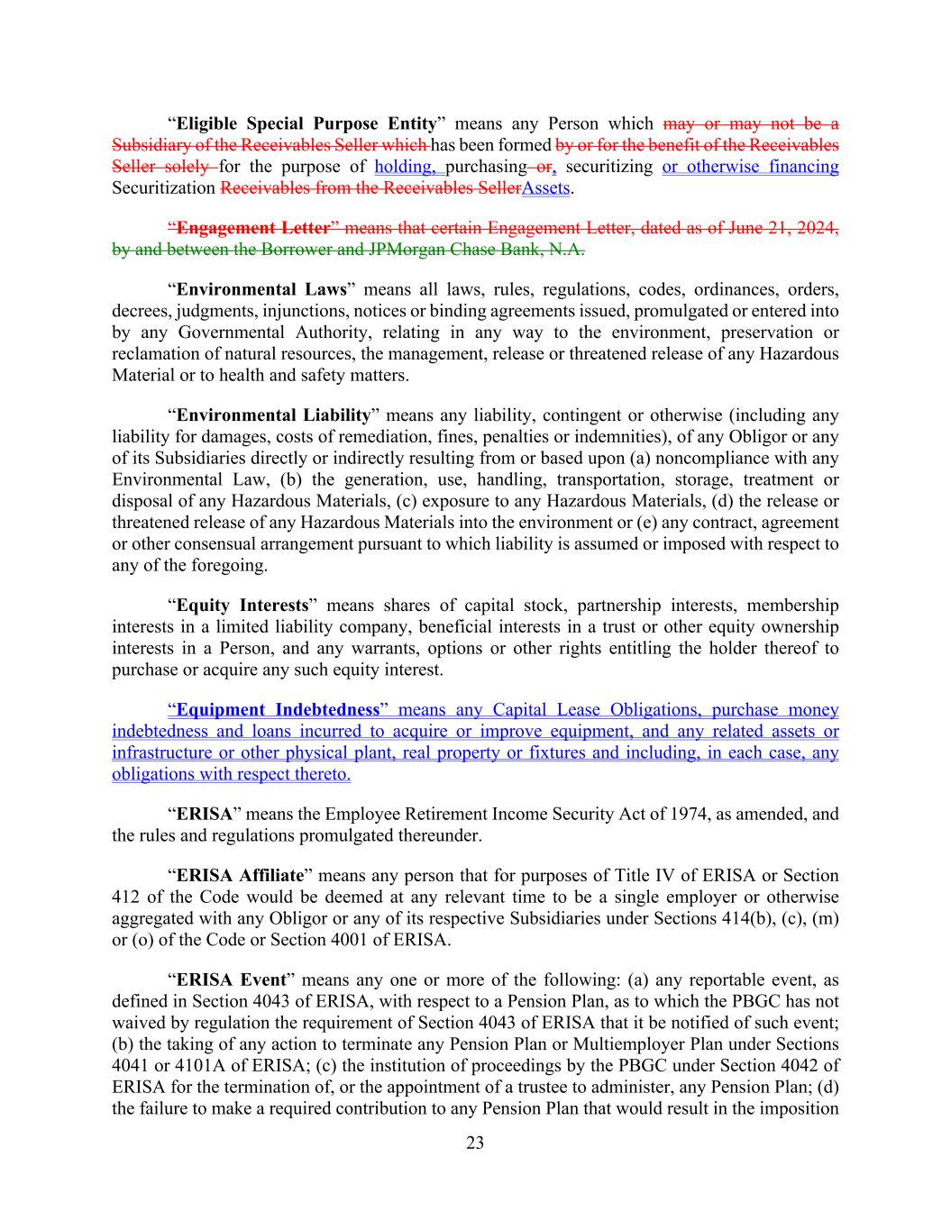 23 “Eligible Special Purpose Entity” means any Person which may or may not be a Subsidiary of the Receivables Seller which has been formed by or for the benefit of the Receivables Seller solely for the purpose of holding, purchasing or, securitizing or otherwise financing Securitization Receivables from the Receivables SellerAssets. “Engagement Letter” means that certain Engagement Letter, dated as of June 21, 2024, by and between the Borrower and JPMorgan Chase Bank, N.A. “Environmental Laws” means all laws, rules, regulations, codes, ordinances, orders, decrees, judgments, injunctions, notices or binding agreements issued, promulgated or entered into by any Governmental Authority, relating in any way to the environment, preservation or reclamation of natural resources, the management, release or threatened release of any Hazardous Material or to health and safety matters. “Environmental Liability” means any liability, contingent or otherwise (including any liability for damages, costs of remediation, fines, penalties or indemnities), of any Obligor or any of its Subsidiaries directly or indirectly resulting from or based upon (a) noncompliance with any Environmental Law, (b) the generation, use, handling, transportation, storage, treatment or disposal of any Hazardous Materials, (c) exposure to any Hazardous Materials, (d) the release or threatened release of any Hazardous Materials into the environment or (e) any contract, agreement or other consensual arrangement pursuant to which liability is assumed or imposed with respect to any of the foregoing. “Equity Interests” means shares of capital stock, partnership interests, membership interests in a limited liability company, beneficial interests in a trust or other equity ownership interests in a Person, and any warrants, options or other rights entitling the holder thereof to purchase or acquire any such equity interest. “Equipment Indebtedness” means any Capital Lease Obligations, purchase money indebtedness and loans incurred to acquire or improve equipment, and any related assets or infrastructure or other physical plant, real property or fixtures and including, in each case, any obligations with respect thereto. “ERISA” means the Employee Retirement Income Security Act of 1974, as amended, and the rules and regulations promulgated thereunder. “ERISA Affiliate” means any person that for purposes of Title IV of ERISA or Section 412 of the Code would be deemed at any relevant time to be a single employer or otherwise aggregated with any Obligor or any of its respective Subsidiaries under Sections 414(b), (c), (m) or (o) of the Code or Section 4001 of ERISA. “ERISA Event” means any one or more of the following: (a) any reportable event, as defined in Section 4043 of ERISA, with respect to a Pension Plan, as to which the PBGC has not waived by regulation the requirement of Section 4043 of ERISA that it be notified of such event; (b) the taking of any action to terminate any Pension Plan or Multiemployer Plan under Sections 4041 or 4101A of ERISA; (c) the institution of proceedings by the PBGC under Section 4042 of ERISA for the termination of, or the appointment of a trustee to administer, any Pension Plan; (d) the failure to make a required contribution to any Pension Plan that would result in the imposition
