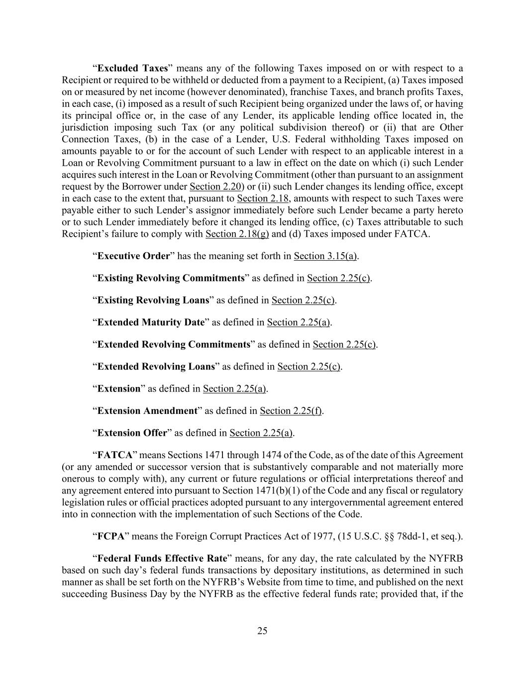 25 “Excluded Taxes” means any of the following Taxes imposed on or with respect to a Recipient or required to be withheld or deducted from a payment to a Recipient, (a) Taxes imposed on or measured by net income (however denominated), franchise Taxes, and branch profits Taxes, in each case, (i) imposed as a result of such Recipient being organized under the laws of, or having its principal office or, in the case of any Lender, its applicable lending office located in, the jurisdiction imposing such Tax (or any political subdivision thereof) or (ii) that are Other Connection Taxes, (b) in the case of a Lender, U.S. Federal withholding Taxes imposed on amounts payable to or for the account of such Lender with respect to an applicable interest in a Loan or Revolving Commitment pursuant to a law in effect on the date on which (i) such Lender acquires such interest in the Loan or Revolving Commitment (other than pursuant to an assignment request by the Borrower under Section 2.20) or (ii) such Lender changes its lending office, except in each case to the extent that, pursuant to Section 2.18, amounts with respect to such Taxes were payable either to such Lender’s assignor immediately before such Lender became a party hereto or to such Lender immediately before it changed its lending office, (c) Taxes attributable to such Recipient’s failure to comply with Section 2.18(g) and (d) Taxes imposed under FATCA. “Executive Order” has the meaning set forth in Section 3.15(a). “Existing Revolving Commitments” as defined in Section 2.25(c). “Existing Revolving Loans” as defined in Section 2.25(c). “Extended Maturity Date” as defined in Section 2.25(a). “Extended Revolving Commitments” as defined in Section 2.25(c). “Extended Revolving Loans” as defined in Section 2.25(c). “Extension” as defined in Section 2.25(a). “Extension Amendment” as defined in Section 2.25(f). “Extension Offer” as defined in Section 2.25(a). “FATCA” means Sections 1471 through 1474 of the Code, as of the date of this Agreement (or any amended or successor version that is substantively comparable and not materially more onerous to comply with), any current or future regulations or official interpretations thereof and any agreement entered into pursuant to Section 1471(b)(1) of the Code and any fiscal or regulatory legislation rules or official practices adopted pursuant to any intergovernmental agreement entered into in connection with the implementation of such Sections of the Code. “FCPA” means the Foreign Corrupt Practices Act of 1977, (15 U.S.C. §§ 78dd-1, et seq.). “Federal Funds Effective Rate” means, for any day, the rate calculated by the NYFRB based on such day’s federal funds transactions by depositary institutions, as determined in such manner as shall be set forth on the NYFRB’s Website from time to time, and published on the next succeeding Business Day by the NYFRB as the effective federal funds rate; provided that, if the