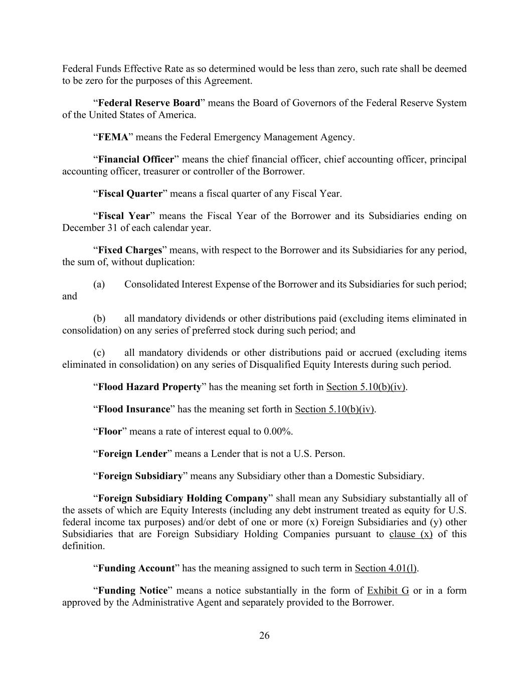 26 Federal Funds Effective Rate as so determined would be less than zero, such rate shall be deemed to be zero for the purposes of this Agreement. “Federal Reserve Board” means the Board of Governors of the Federal Reserve System of the United States of America. “FEMA” means the Federal Emergency Management Agency. “Financial Officer” means the chief financial officer, chief accounting officer, principal accounting officer, treasurer or controller of the Borrower. “Fiscal Quarter” means a fiscal quarter of any Fiscal Year. “Fiscal Year” means the Fiscal Year of the Borrower and its Subsidiaries ending on December 31 of each calendar year. “Fixed Charges” means, with respect to the Borrower and its Subsidiaries for any period, the sum of, without duplication: (a) Consolidated Interest Expense of the Borrower and its Subsidiaries for such period; and (b) all mandatory dividends or other distributions paid (excluding items eliminated in consolidation) on any series of preferred stock during such period; and (c) all mandatory dividends or other distributions paid or accrued (excluding items eliminated in consolidation) on any series of Disqualified Equity Interests during such period. “Flood Hazard Property” has the meaning set forth in Section 5.10(b)(iv). “Flood Insurance” has the meaning set forth in Section 5.10(b)(iv). “Floor” means a rate of interest equal to 0.00%. “Foreign Lender” means a Lender that is not a U.S. Person. “Foreign Subsidiary” means any Subsidiary other than a Domestic Subsidiary. “Foreign Subsidiary Holding Company” shall mean any Subsidiary substantially all of the assets of which are Equity Interests (including any debt instrument treated as equity for U.S. federal income tax purposes) and/or debt of one or more (x) Foreign Subsidiaries and (y) other Subsidiaries that are Foreign Subsidiary Holding Companies pursuant to clause (x) of this definition. “Funding Account” has the meaning assigned to such term in Section 4.01(l). “Funding Notice” means a notice substantially in the form of Exhibit G or in a form approved by the Administrative Agent and separately provided to the Borrower.
