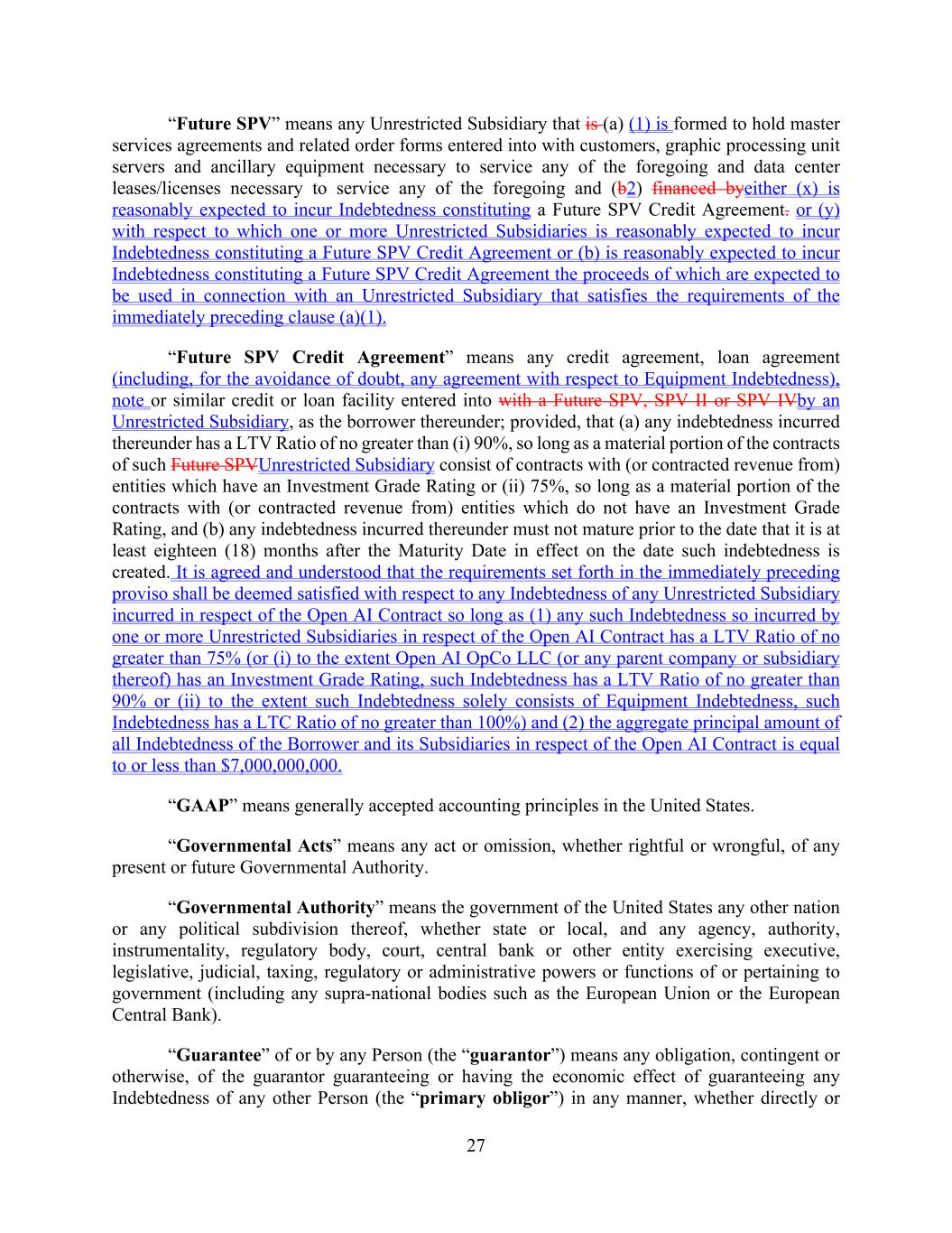 27 “Future SPV” means any Unrestricted Subsidiary that is (a) (1) is formed to hold master services agreements and related order forms entered into with customers, graphic processing unit servers and ancillary equipment necessary to service any of the foregoing and data center leases/licenses necessary to service any of the foregoing and (b2) financed byeither (x) is reasonably expected to incur Indebtedness constituting a Future SPV Credit Agreement. or (y) with respect to which one or more Unrestricted Subsidiaries is reasonably expected to incur Indebtedness constituting a Future SPV Credit Agreement or (b) is reasonably expected to incur Indebtedness constituting a Future SPV Credit Agreement the proceeds of which are expected to be used in connection with an Unrestricted Subsidiary that satisfies the requirements of the immediately preceding clause (a)(1). “Future SPV Credit Agreement” means any credit agreement, loan agreement (including, for the avoidance of doubt, any agreement with respect to Equipment Indebtedness), note or similar credit or loan facility entered into with a Future SPV, SPV II or SPV IVby an Unrestricted Subsidiary, as the borrower thereunder; provided, that (a) any indebtedness incurred thereunder has a LTV Ratio of no greater than (i) 90%, so long as a material portion of the contracts of such Future SPVUnrestricted Subsidiary consist of contracts with (or contracted revenue from) entities which have an Investment Grade Rating or (ii) 75%, so long as a material portion of the contracts with (or contracted revenue from) entities which do not have an Investment Grade Rating, and (b) any indebtedness incurred thereunder must not mature prior to the date that it is at least eighteen (18) months after the Maturity Date in effect on the date such indebtedness is created. It is agreed and understood that the requirements set forth in the immediately preceding proviso shall be deemed satisfied with respect to any Indebtedness of any Unrestricted Subsidiary incurred in respect of the Open AI Contract so long as (1) any such Indebtedness so incurred by one or more Unrestricted Subsidiaries in respect of the Open AI Contract has a LTV Ratio of no greater than 75% (or (i) to the extent Open AI OpCo LLC (or any parent company or subsidiary thereof) has an Investment Grade Rating, such Indebtedness has a LTV Ratio of no greater than 90% or (ii) to the extent such Indebtedness solely consists of Equipment Indebtedness, such Indebtedness has a LTC Ratio of no greater than 100%) and (2) the aggregate principal amount of all Indebtedness of the Borrower and its Subsidiaries in respect of the Open AI Contract is equal to or less than $7,000,000,000. “GAAP” means generally accepted accounting principles in the United States. “Governmental Acts” means any act or omission, whether rightful or wrongful, of any present or future Governmental Authority. “Governmental Authority” means the government of the United States any other nation or any political subdivision thereof, whether state or local, and any agency, authority, instrumentality, regulatory body, court, central bank or other entity exercising executive, legislative, judicial, taxing, regulatory or administrative powers or functions of or pertaining to government (including any supra-national bodies such as the European Union or the European Central Bank). “Guarantee” of or by any Person (the “guarantor”) means any obligation, contingent or otherwise, of the guarantor guaranteeing or having the economic effect of guaranteeing any Indebtedness of any other Person (the “primary obligor”) in any manner, whether directly or