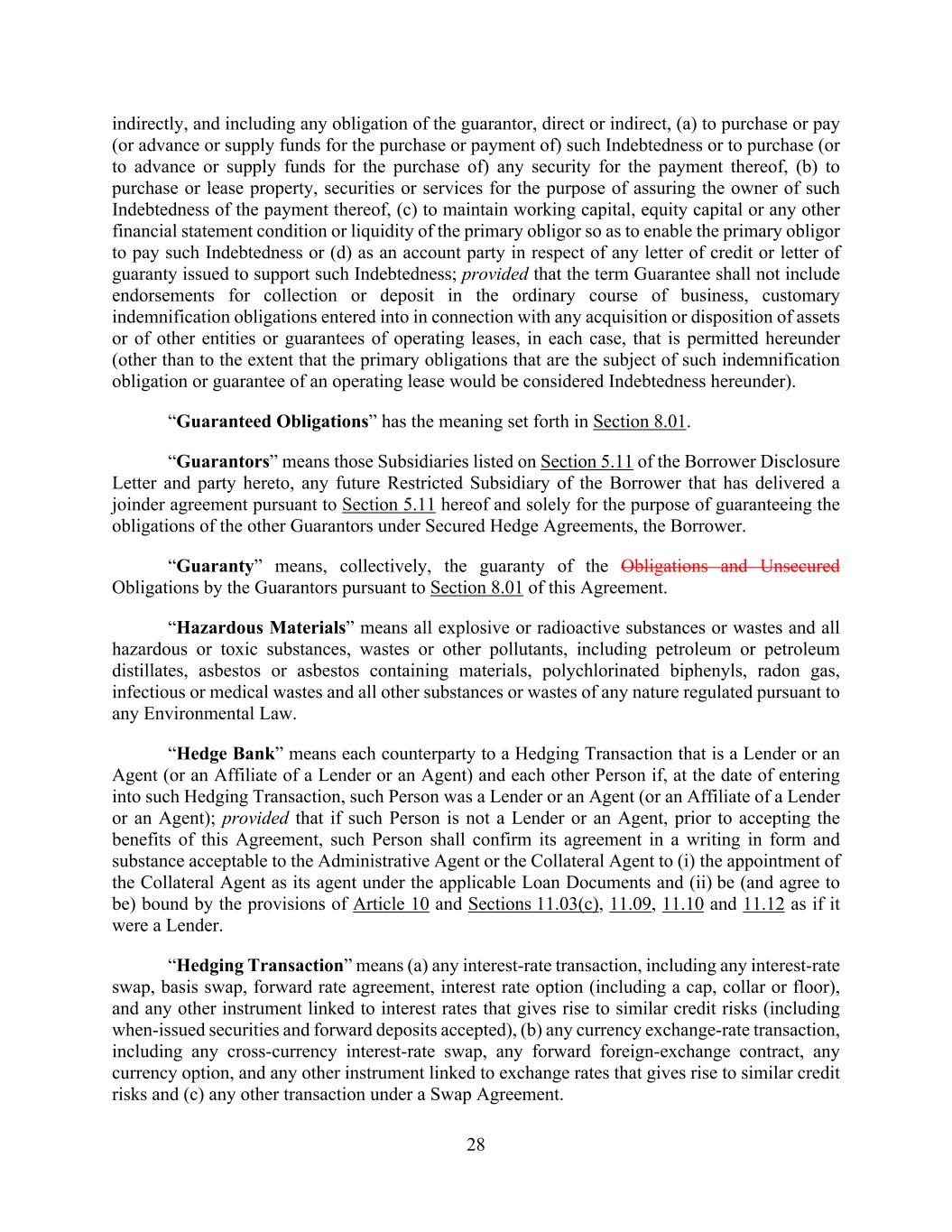 28 indirectly, and including any obligation of the guarantor, direct or indirect, (a) to purchase or pay (or advance or supply funds for the purchase or payment of) such Indebtedness or to purchase (or to advance or supply funds for the purchase of) any security for the payment thereof, (b) to purchase or lease property, securities or services for the purpose of assuring the owner of such Indebtedness of the payment thereof, (c) to maintain working capital, equity capital or any other financial statement condition or liquidity of the primary obligor so as to enable the primary obligor to pay such Indebtedness or (d) as an account party in respect of any letter of credit or letter of guaranty issued to support such Indebtedness; provided that the term Guarantee shall not include endorsements for collection or deposit in the ordinary course of business, customary indemnification obligations entered into in connection with any acquisition or disposition of assets or of other entities or guarantees of operating leases, in each case, that is permitted hereunder (other than to the extent that the primary obligations that are the subject of such indemnification obligation or guarantee of an operating lease would be considered Indebtedness hereunder). “Guaranteed Obligations” has the meaning set forth in Section 8.01. “Guarantors” means those Subsidiaries listed on Section 5.11 of the Borrower Disclosure Letter and party hereto, any future Restricted Subsidiary of the Borrower that has delivered a joinder agreement pursuant to Section 5.11 hereof and solely for the purpose of guaranteeing the obligations of the other Guarantors under Secured Hedge Agreements, the Borrower. “Guaranty” means, collectively, the guaranty of the Obligations and Unsecured Obligations by the Guarantors pursuant to Section 8.01 of this Agreement. “Hazardous Materials” means all explosive or radioactive substances or wastes and all hazardous or toxic substances, wastes or other pollutants, including petroleum or petroleum distillates, asbestos or asbestos containing materials, polychlorinated biphenyls, radon gas, infectious or medical wastes and all other substances or wastes of any nature regulated pursuant to any Environmental Law. “Hedge Bank” means each counterparty to a Hedging Transaction that is a Lender or an Agent (or an Affiliate of a Lender or an Agent) and each other Person if, at the date of entering into such Hedging Transaction, such Person was a Lender or an Agent (or an Affiliate of a Lender or an Agent); provided that if such Person is not a Lender or an Agent, prior to accepting the benefits of this Agreement, such Person shall confirm its agreement in a writing in form and substance acceptable to the Administrative Agent or the Collateral Agent to (i) the appointment of the Collateral Agent as its agent under the applicable Loan Documents and (ii) be (and agree to be) bound by the provisions of Article 10 and Sections 11.03(c), 11.09, 11.10 and 11.12 as if it were a Lender. “Hedging Transaction” means (a) any interest-rate transaction, including any interest-rate swap, basis swap, forward rate agreement, interest rate option (including a cap, collar or floor), and any other instrument linked to interest rates that gives rise to similar credit risks (including when-issued securities and forward deposits accepted), (b) any currency exchange-rate transaction, including any cross-currency interest-rate swap, any forward foreign-exchange contract, any currency option, and any other instrument linked to exchange rates that gives rise to similar credit risks and (c) any other transaction under a Swap Agreement.