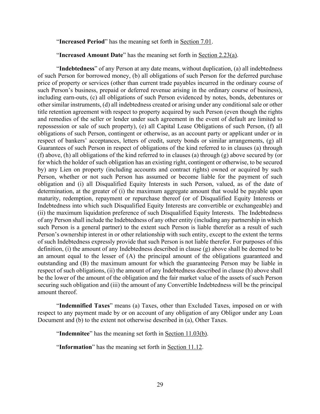 29 “Increased Period” has the meaning set forth in Section 7.01. “Increased Amount Date” has the meaning set forth in Section 2.23(a). “Indebtedness” of any Person at any date means, without duplication, (a) all indebtedness of such Person for borrowed money, (b) all obligations of such Person for the deferred purchase price of property or services (other than current trade payables incurred in the ordinary course of such Person’s business, prepaid or deferred revenue arising in the ordinary course of business), including earn-outs, (c) all obligations of such Person evidenced by notes, bonds, debentures or other similar instruments, (d) all indebtedness created or arising under any conditional sale or other title retention agreement with respect to property acquired by such Person (even though the rights and remedies of the seller or lender under such agreement in the event of default are limited to repossession or sale of such property), (e) all Capital Lease Obligations of such Person, (f) all obligations of such Person, contingent or otherwise, as an account party or applicant under or in respect of bankers’ acceptances, letters of credit, surety bonds or similar arrangements, (g) all Guarantees of such Person in respect of obligations of the kind referred to in clauses (a) through (f) above, (h) all obligations of the kind referred to in clauses (a) through (g) above secured by (or for which the holder of such obligation has an existing right, contingent or otherwise, to be secured by) any Lien on property (including accounts and contract rights) owned or acquired by such Person, whether or not such Person has assumed or become liable for the payment of such obligation and (i) all Disqualified Equity Interests in such Person, valued, as of the date of determination, at the greater of (i) the maximum aggregate amount that would be payable upon maturity, redemption, repayment or repurchase thereof (or of Disqualified Equity Interests or Indebtedness into which such Disqualified Equity Interests are convertible or exchangeable) and (ii) the maximum liquidation preference of such Disqualified Equity Interests. The Indebtedness of any Person shall include the Indebtedness of any other entity (including any partnership in which such Person is a general partner) to the extent such Person is liable therefor as a result of such Person’s ownership interest in or other relationship with such entity, except to the extent the terms of such Indebtedness expressly provide that such Person is not liable therefor. For purposes of this definition, (i) the amount of any Indebtedness described in clause (g) above shall be deemed to be an amount equal to the lesser of (A) the principal amount of the obligations guaranteed and outstanding and (B) the maximum amount for which the guaranteeing Person may be liable in respect of such obligations, (ii) the amount of any Indebtedness described in clause (h) above shall be the lower of the amount of the obligation and the fair market value of the assets of such Person securing such obligation and (iii) the amount of any Convertible Indebtedness will be the principal amount thereof. “Indemnified Taxes” means (a) Taxes, other than Excluded Taxes, imposed on or with respect to any payment made by or on account of any obligation of any Obligor under any Loan Document and (b) to the extent not otherwise described in (a), Other Taxes. “Indemnitee” has the meaning set forth in Section 11.03(b). “Information” has the meaning set forth in Section 11.12.