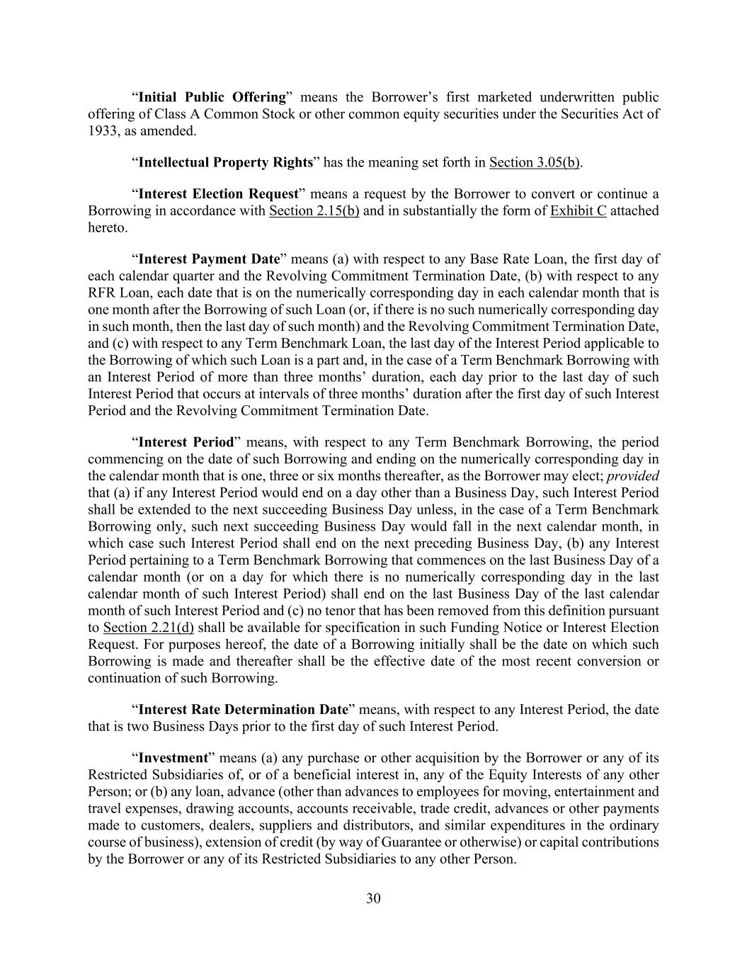 30 “Initial Public Offering” means the Borrower’s first marketed underwritten public offering of Class A Common Stock or other common equity securities under the Securities Act of 1933, as amended. “Intellectual Property Rights” has the meaning set forth in Section 3.05(b). “Interest Election Request” means a request by the Borrower to convert or continue a Borrowing in accordance with Section 2.15(b) and in substantially the form of Exhibit C attached hereto. “Interest Payment Date” means (a) with respect to any Base Rate Loan, the first day of each calendar quarter and the Revolving Commitment Termination Date, (b) with respect to any RFR Loan, each date that is on the numerically corresponding day in each calendar month that is one month after the Borrowing of such Loan (or, if there is no such numerically corresponding day in such month, then the last day of such month) and the Revolving Commitment Termination Date, and (c) with respect to any Term Benchmark Loan, the last day of the Interest Period applicable to the Borrowing of which such Loan is a part and, in the case of a Term Benchmark Borrowing with an Interest Period of more than three months’ duration, each day prior to the last day of such Interest Period that occurs at intervals of three months’ duration after the first day of such Interest Period and the Revolving Commitment Termination Date. “Interest Period” means, with respect to any Term Benchmark Borrowing, the period commencing on the date of such Borrowing and ending on the numerically corresponding day in the calendar month that is one, three or six months thereafter, as the Borrower may elect; provided that (a) if any Interest Period would end on a day other than a Business Day, such Interest Period shall be extended to the next succeeding Business Day unless, in the case of a Term Benchmark Borrowing only, such next succeeding Business Day would fall in the next calendar month, in which case such Interest Period shall end on the next preceding Business Day, (b) any Interest Period pertaining to a Term Benchmark Borrowing that commences on the last Business Day of a calendar month (or on a day for which there is no numerically corresponding day in the last calendar month of such Interest Period) shall end on the last Business Day of the last calendar month of such Interest Period and (c) no tenor that has been removed from this definition pursuant to Section 2.21(d) shall be available for specification in such Funding Notice or Interest Election Request. For purposes hereof, the date of a Borrowing initially shall be the date on which such Borrowing is made and thereafter shall be the effective date of the most recent conversion or continuation of such Borrowing. “Interest Rate Determination Date” means, with respect to any Interest Period, the date that is two Business Days prior to the first day of such Interest Period. “Investment” means (a) any purchase or other acquisition by the Borrower or any of its Restricted Subsidiaries of, or of a beneficial interest in, any of the Equity Interests of any other Person; or (b) any loan, advance (other than advances to employees for moving, entertainment and travel expenses, drawing accounts, accounts receivable, trade credit, advances or other payments made to customers, dealers, suppliers and distributors, and similar expenditures in the ordinary course of business), extension of credit (by way of Guarantee or otherwise) or capital contributions by the Borrower or any of its Restricted Subsidiaries to any other Person.