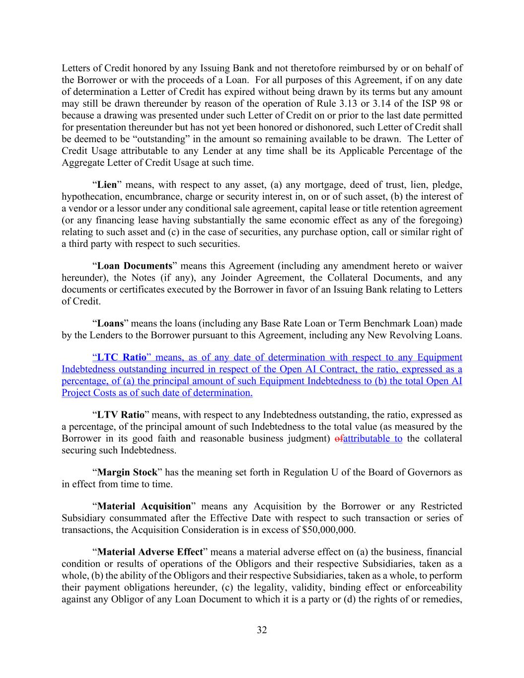 32 Letters of Credit honored by any Issuing Bank and not theretofore reimbursed by or on behalf of the Borrower or with the proceeds of a Loan. For all purposes of this Agreement, if on any date of determination a Letter of Credit has expired without being drawn by its terms but any amount may still be drawn thereunder by reason of the operation of Rule 3.13 or 3.14 of the ISP 98 or because a drawing was presented under such Letter of Credit on or prior to the last date permitted for presentation thereunder but has not yet been honored or dishonored, such Letter of Credit shall be deemed to be “outstanding” in the amount so remaining available to be drawn. The Letter of Credit Usage attributable to any Lender at any time shall be its Applicable Percentage of the Aggregate Letter of Credit Usage at such time. “Lien” means, with respect to any asset, (a) any mortgage, deed of trust, lien, pledge, hypothecation, encumbrance, charge or security interest in, on or of such asset, (b) the interest of a vendor or a lessor under any conditional sale agreement, capital lease or title retention agreement (or any financing lease having substantially the same economic effect as any of the foregoing) relating to such asset and (c) in the case of securities, any purchase option, call or similar right of a third party with respect to such securities. “Loan Documents” means this Agreement (including any amendment hereto or waiver hereunder), the Notes (if any), any Joinder Agreement, the Collateral Documents, and any documents or certificates executed by the Borrower in favor of an Issuing Bank relating to Letters of Credit. “Loans” means the loans (including any Base Rate Loan or Term Benchmark Loan) made by the Lenders to the Borrower pursuant to this Agreement, including any New Revolving Loans. “LTC Ratio” means, as of any date of determination with respect to any Equipment Indebtedness outstanding incurred in respect of the Open AI Contract, the ratio, expressed as a percentage, of (a) the principal amount of such Equipment Indebtedness to (b) the total Open AI Project Costs as of such date of determination. “LTV Ratio” means, with respect to any Indebtedness outstanding, the ratio, expressed as a percentage, of the principal amount of such Indebtedness to the total value (as measured by the Borrower in its good faith and reasonable business judgment) ofattributable to the collateral securing such Indebtedness. “Margin Stock” has the meaning set forth in Regulation U of the Board of Governors as in effect from time to time. “Material Acquisition” means any Acquisition by the Borrower or any Restricted Subsidiary consummated after the Effective Date with respect to such transaction or series of transactions, the Acquisition Consideration is in excess of $50,000,000. “Material Adverse Effect” means a material adverse effect on (a) the business, financial condition or results of operations of the Obligors and their respective Subsidiaries, taken as a whole, (b) the ability of the Obligors and their respective Subsidiaries, taken as a whole, to perform their payment obligations hereunder, (c) the legality, validity, binding effect or enforceability against any Obligor of any Loan Document to which it is a party or (d) the rights of or remedies,