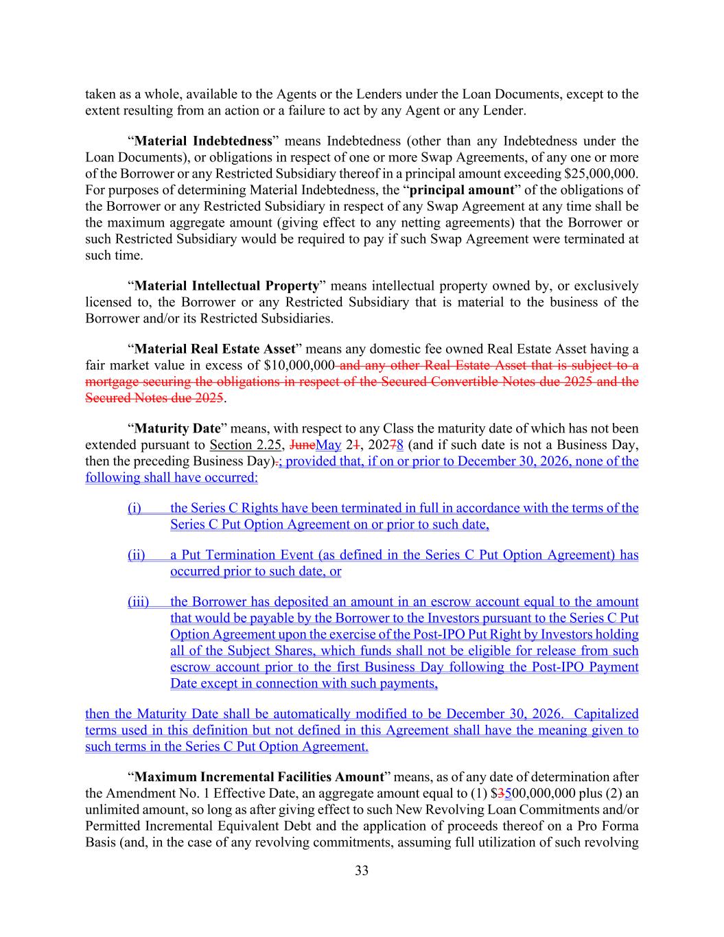 33 taken as a whole, available to the Agents or the Lenders under the Loan Documents, except to the extent resulting from an action or a failure to act by any Agent or any Lender. “Material Indebtedness” means Indebtedness (other than any Indebtedness under the Loan Documents), or obligations in respect of one or more Swap Agreements, of any one or more of the Borrower or any Restricted Subsidiary thereof in a principal amount exceeding $25,000,000. For purposes of determining Material Indebtedness, the “principal amount” of the obligations of the Borrower or any Restricted Subsidiary in respect of any Swap Agreement at any time shall be the maximum aggregate amount (giving effect to any netting agreements) that the Borrower or such Restricted Subsidiary would be required to pay if such Swap Agreement were terminated at such time. “Material Intellectual Property” means intellectual property owned by, or exclusively licensed to, the Borrower or any Restricted Subsidiary that is material to the business of the Borrower and/or its Restricted Subsidiaries. “Material Real Estate Asset” means any domestic fee owned Real Estate Asset having a fair market value in excess of $10,000,000 and any other Real Estate Asset that is subject to a mortgage securing the obligations in respect of the Secured Convertible Notes due 2025 and the Secured Notes due 2025. “Maturity Date” means, with respect to any Class the maturity date of which has not been extended pursuant to Section 2.25, JuneMay 21, 20278 (and if such date is not a Business Day, then the preceding Business Day).; provided that, if on or prior to December 30, 2026, none of the following shall have occurred: (i) the Series C Rights have been terminated in full in accordance with the terms of the Series C Put Option Agreement on or prior to such date, (ii) a Put Termination Event (as defined in the Series C Put Option Agreement) has occurred prior to such date, or (iii) the Borrower has deposited an amount in an escrow account equal to the amount that would be payable by the Borrower to the Investors pursuant to the Series C Put Option Agreement upon the exercise of the Post-IPO Put Right by Investors holding all of the Subject Shares, which funds shall not be eligible for release from such escrow account prior to the first Business Day following the Post-IPO Payment Date except in connection with such payments, then the Maturity Date shall be automatically modified to be December 30, 2026. Capitalized terms used in this definition but not defined in this Agreement shall have the meaning given to such terms in the Series C Put Option Agreement. “Maximum Incremental Facilities Amount” means, as of any date of determination after the Amendment No. 1 Effective Date, an aggregate amount equal to (1) $3500,000,000 plus (2) an unlimited amount, so long as after giving effect to such New Revolving Loan Commitments and/or Permitted Incremental Equivalent Debt and the application of proceeds thereof on a Pro Forma Basis (and, in the case of any revolving commitments, assuming full utilization of such revolving