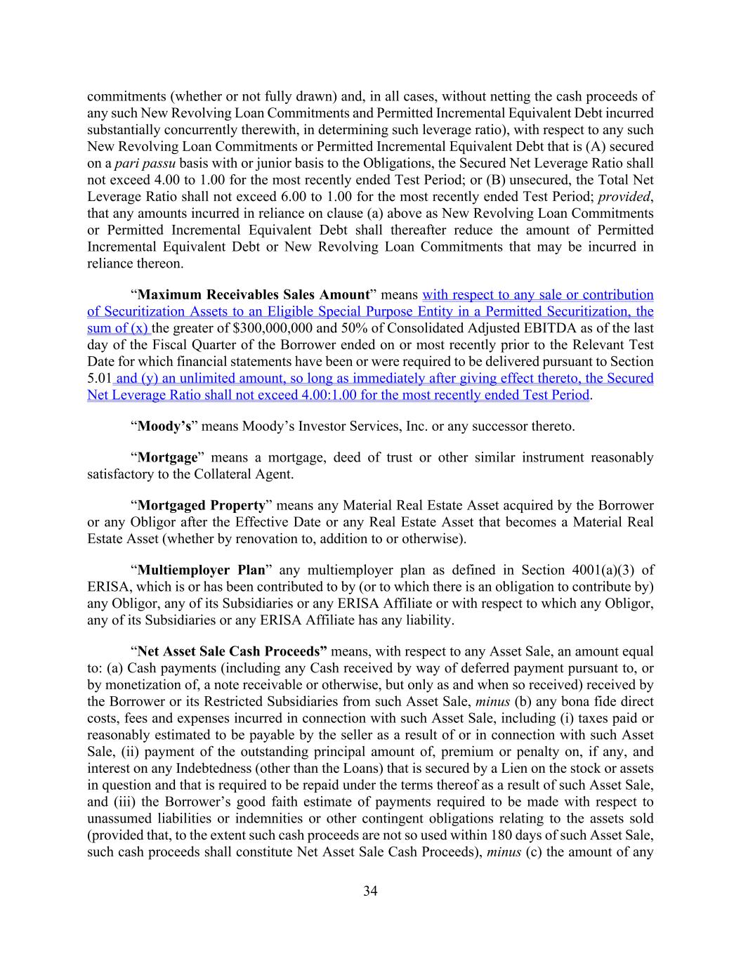 34 commitments (whether or not fully drawn) and, in all cases, without netting the cash proceeds of any such New Revolving Loan Commitments and Permitted Incremental Equivalent Debt incurred substantially concurrently therewith, in determining such leverage ratio), with respect to any such New Revolving Loan Commitments or Permitted Incremental Equivalent Debt that is (A) secured on a pari passu basis with or junior basis to the Obligations, the Secured Net Leverage Ratio shall not exceed 4.00 to 1.00 for the most recently ended Test Period; or (B) unsecured, the Total Net Leverage Ratio shall not exceed 6.00 to 1.00 for the most recently ended Test Period; provided, that any amounts incurred in reliance on clause (a) above as New Revolving Loan Commitments or Permitted Incremental Equivalent Debt shall thereafter reduce the amount of Permitted Incremental Equivalent Debt or New Revolving Loan Commitments that may be incurred in reliance thereon. “Maximum Receivables Sales Amount” means with respect to any sale or contribution of Securitization Assets to an Eligible Special Purpose Entity in a Permitted Securitization, the sum of (x) the greater of $300,000,000 and 50% of Consolidated Adjusted EBITDA as of the last day of the Fiscal Quarter of the Borrower ended on or most recently prior to the Relevant Test Date for which financial statements have been or were required to be delivered pursuant to Section 5.01 and (y) an unlimited amount, so long as immediately after giving effect thereto, the Secured Net Leverage Ratio shall not exceed 4.00:1.00 for the most recently ended Test Period. “Moody’s” means Moody’s Investor Services, Inc. or any successor thereto. “Mortgage” means a mortgage, deed of trust or other similar instrument reasonably satisfactory to the Collateral Agent. “Mortgaged Property” means any Material Real Estate Asset acquired by the Borrower or any Obligor after the Effective Date or any Real Estate Asset that becomes a Material Real Estate Asset (whether by renovation to, addition to or otherwise). “Multiemployer Plan” any multiemployer plan as defined in Section 4001(a)(3) of ERISA, which is or has been contributed to by (or to which there is an obligation to contribute by) any Obligor, any of its Subsidiaries or any ERISA Affiliate or with respect to which any Obligor, any of its Subsidiaries or any ERISA Affiliate has any liability. “Net Asset Sale Cash Proceeds” means, with respect to any Asset Sale, an amount equal to: (a) Cash payments (including any Cash received by way of deferred payment pursuant to, or by monetization of, a note receivable or otherwise, but only as and when so received) received by the Borrower or its Restricted Subsidiaries from such Asset Sale, minus (b) any bona fide direct costs, fees and expenses incurred in connection with such Asset Sale, including (i) taxes paid or reasonably estimated to be payable by the seller as a result of or in connection with such Asset Sale, (ii) payment of the outstanding principal amount of, premium or penalty on, if any, and interest on any Indebtedness (other than the Loans) that is secured by a Lien on the stock or assets in question and that is required to be repaid under the terms thereof as a result of such Asset Sale, and (iii) the Borrower’s good faith estimate of payments required to be made with respect to unassumed liabilities or indemnities or other contingent obligations relating to the assets sold (provided that, to the extent such cash proceeds are not so used within 180 days of such Asset Sale, such cash proceeds shall constitute Net Asset Sale Cash Proceeds), minus (c) the amount of any