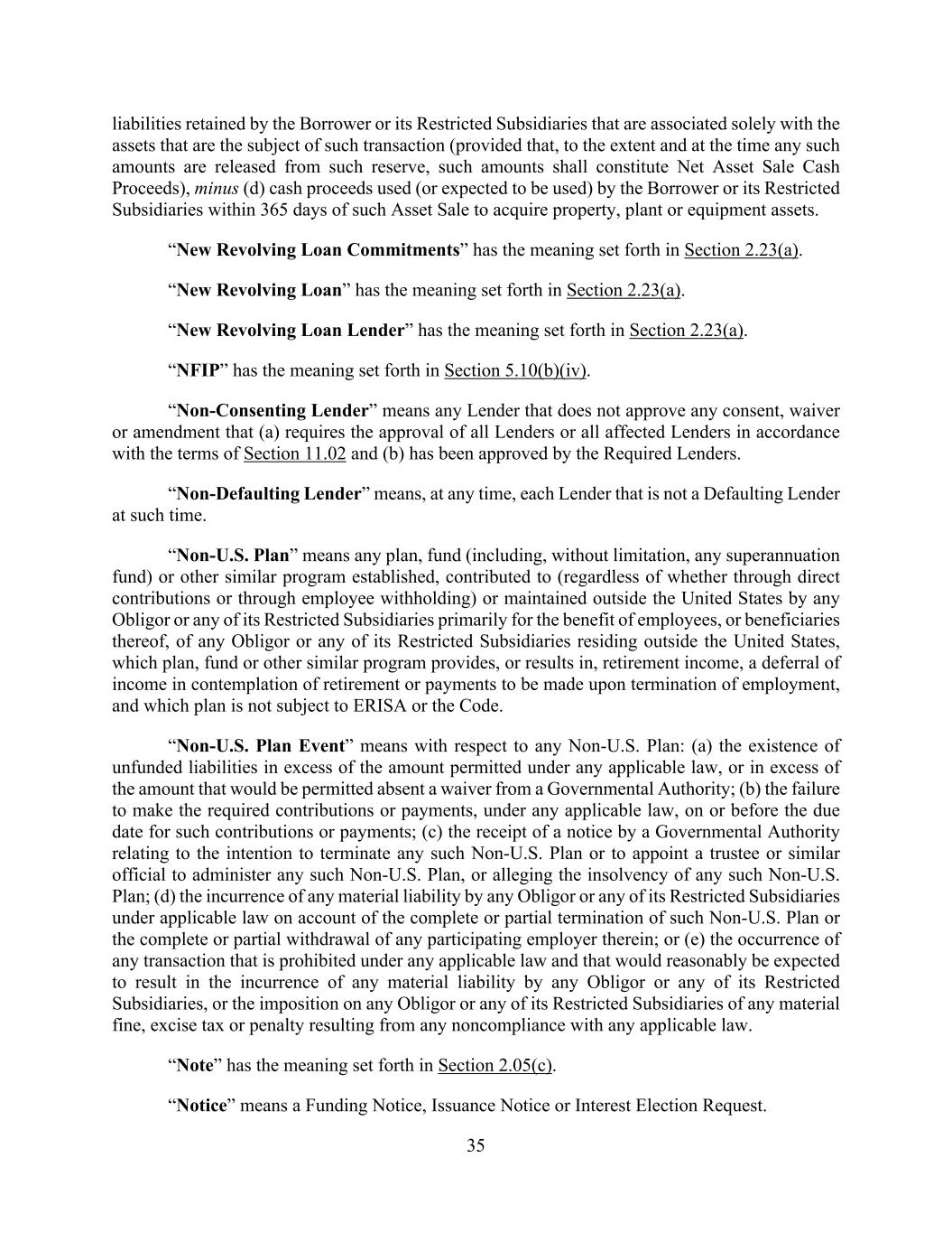 35 liabilities retained by the Borrower or its Restricted Subsidiaries that are associated solely with the assets that are the subject of such transaction (provided that, to the extent and at the time any such amounts are released from such reserve, such amounts shall constitute Net Asset Sale Cash Proceeds), minus (d) cash proceeds used (or expected to be used) by the Borrower or its Restricted Subsidiaries within 365 days of such Asset Sale to acquire property, plant or equipment assets. “New Revolving Loan Commitments” has the meaning set forth in Section 2.23(a). “New Revolving Loan” has the meaning set forth in Section 2.23(a). “New Revolving Loan Lender” has the meaning set forth in Section 2.23(a). “NFIP” has the meaning set forth in Section 5.10(b)(iv). “Non-Consenting Lender” means any Lender that does not approve any consent, waiver or amendment that (a) requires the approval of all Lenders or all affected Lenders in accordance with the terms of Section 11.02 and (b) has been approved by the Required Lenders. “Non-Defaulting Lender” means, at any time, each Lender that is not a Defaulting Lender at such time. “Non-U.S. Plan” means any plan, fund (including, without limitation, any superannuation fund) or other similar program established, contributed to (regardless of whether through direct contributions or through employee withholding) or maintained outside the United States by any Obligor or any of its Restricted Subsidiaries primarily for the benefit of employees, or beneficiaries thereof, of any Obligor or any of its Restricted Subsidiaries residing outside the United States, which plan, fund or other similar program provides, or results in, retirement income, a deferral of income in contemplation of retirement or payments to be made upon termination of employment, and which plan is not subject to ERISA or the Code. “Non-U.S. Plan Event” means with respect to any Non-U.S. Plan: (a) the existence of unfunded liabilities in excess of the amount permitted under any applicable law, or in excess of the amount that would be permitted absent a waiver from a Governmental Authority; (b) the failure to make the required contributions or payments, under any applicable law, on or before the due date for such contributions or payments; (c) the receipt of a notice by a Governmental Authority relating to the intention to terminate any such Non-U.S. Plan or to appoint a trustee or similar official to administer any such Non-U.S. Plan, or alleging the insolvency of any such Non-U.S. Plan; (d) the incurrence of any material liability by any Obligor or any of its Restricted Subsidiaries under applicable law on account of the complete or partial termination of such Non-U.S. Plan or the complete or partial withdrawal of any participating employer therein; or (e) the occurrence of any transaction that is prohibited under any applicable law and that would reasonably be expected to result in the incurrence of any material liability by any Obligor or any of its Restricted Subsidiaries, or the imposition on any Obligor or any of its Restricted Subsidiaries of any material fine, excise tax or penalty resulting from any noncompliance with any applicable law. “Note” has the meaning set forth in Section 2.05(c). “Notice” means a Funding Notice, Issuance Notice or Interest Election Request.