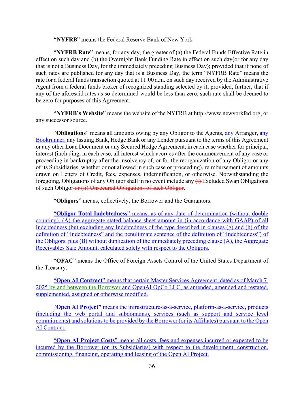 36 “NYFRB” means the Federal Reserve Bank of New York. “NYFRB Rate” means, for any day, the greater of (a) the Federal Funds Effective Rate in effect on such day and (b) the Overnight Bank Funding Rate in effect on such day(or for any day that is not a Business Day, for the immediately preceding Business Day); provided that if none of such rates are published for any day that is a Business Day, the term “NYFRB Rate” means the rate for a federal funds transaction quoted at 11:00 a.m. on such day received by the Administrative Agent from a federal funds broker of recognized standing selected by it; provided, further, that if any of the aforesaid rates as so determined would be less than zero, such rate shall be deemed to be zero for purposes of this Agreement. “NYFRB’s Website” means the website of the NYFRB at http://www.newyorkfed.org, or any successor source. “Obligations” means all amounts owing by any Obligor to the Agents, any Arranger, any Bookrunner, any Issuing Bank, Hedge Bank or any Lender pursuant to the terms of this Agreement or any other Loan Document or any Secured Hedge Agreement, in each case whether for principal, interest (including, in each case, all interest which accrues after the commencement of any case or proceeding in bankruptcy after the insolvency of, or for the reorganization of any Obligor or any of its Subsidiaries, whether or not allowed in such case or proceeding), reimbursement of amounts drawn on Letters of Credit, fees, expenses, indemnification, or otherwise. Notwithstanding the foregoing, Obligations of any Obligor shall in no event include any (i) Excluded Swap Obligations of such Obligor or (ii) Unsecured Obligations of such Obligor. “Obligors” means, collectively, the Borrower and the Guarantors. “Obligor Total Indebtedness” means, as of any date of determination (without double counting), (A) the aggregate stated balance sheet amount in (in accordance with GAAP) of all Indebtedness (but excluding any Indebtedness of the type described in clauses (g) and (h) of the definition of “Indebtedness” and the penultimate sentence of the definition of “Indebtedness”) of the Obligors, plus (B) without duplication of the immediately preceding clause (A), the Aggregate Receivables Sale Amount, calculated solely with respect to the Obligors. “OFAC” means the Office of Foreign Assets Control of the United States Department of the Treasury. “Open AI Contract” means that certain Master Services Agreement, dated as of March 7, 2025 by and between the Borrower and OpenAI OpCo LLC, as amended, amended and restated, supplemented, assigned or otherwise modified. “Open AI Project” means the infrastructure-as-a-service, platform-as-a-service, products (including the web portal and subdomains), services (such as support and service level commitments) and solutions to be provided by the Borrower (or its Affiliates) pursuant to the Open AI Contract. “Open AI Project Costs” means all costs, fees and expenses incurred or expected to be incurred by the Borrower (or its Subsidiaries) with respect to the development, construction, commissioning, financing, operating and leasing of the Open AI Project.