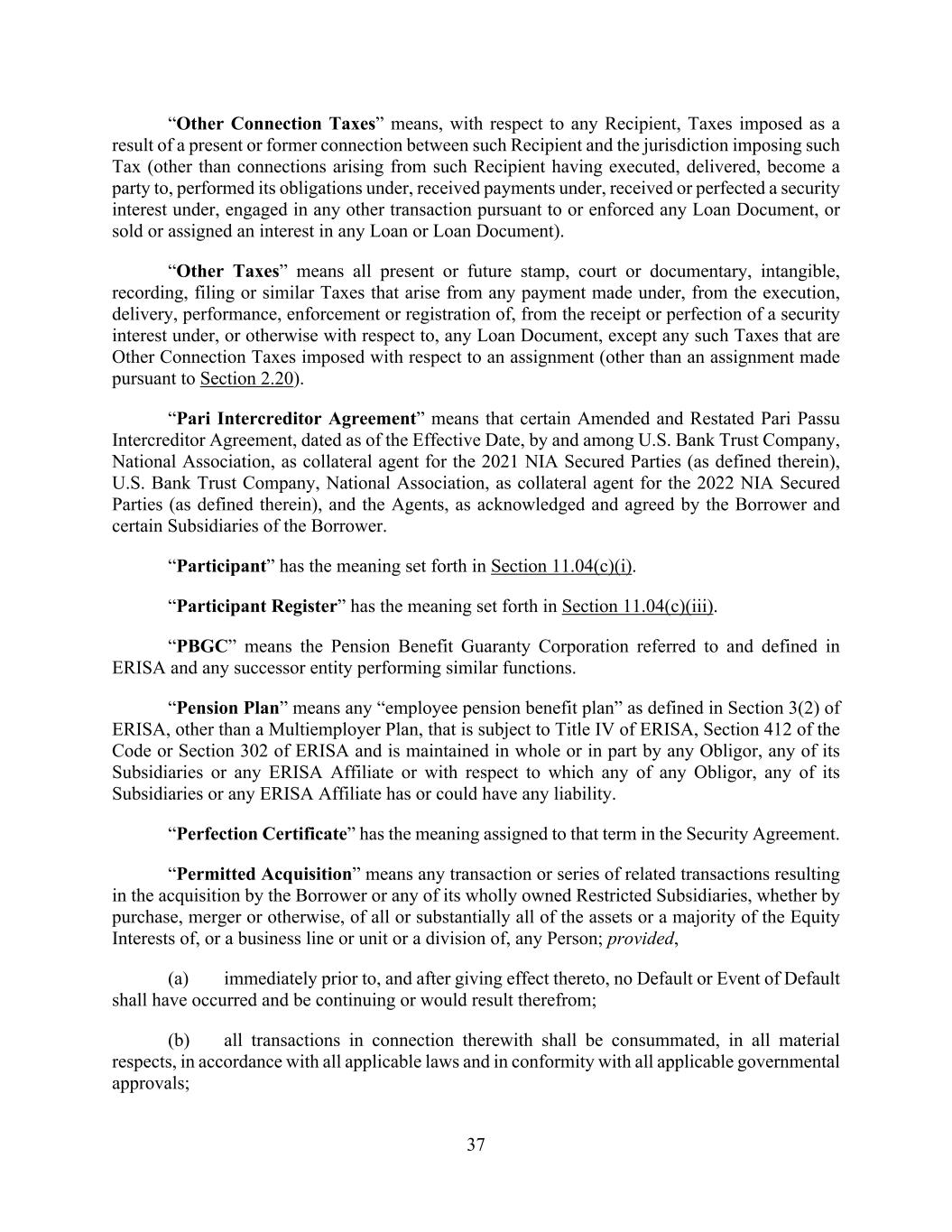 37 “Other Connection Taxes” means, with respect to any Recipient, Taxes imposed as a result of a present or former connection between such Recipient and the jurisdiction imposing such Tax (other than connections arising from such Recipient having executed, delivered, become a party to, performed its obligations under, received payments under, received or perfected a security interest under, engaged in any other transaction pursuant to or enforced any Loan Document, or sold or assigned an interest in any Loan or Loan Document). “Other Taxes” means all present or future stamp, court or documentary, intangible, recording, filing or similar Taxes that arise from any payment made under, from the execution, delivery, performance, enforcement or registration of, from the receipt or perfection of a security interest under, or otherwise with respect to, any Loan Document, except any such Taxes that are Other Connection Taxes imposed with respect to an assignment (other than an assignment made pursuant to Section 2.20). “Pari Intercreditor Agreement” means that certain Amended and Restated Pari Passu Intercreditor Agreement, dated as of the Effective Date, by and among U.S. Bank Trust Company, National Association, as collateral agent for the 2021 NIA Secured Parties (as defined therein), U.S. Bank Trust Company, National Association, as collateral agent for the 2022 NIA Secured Parties (as defined therein), and the Agents, as acknowledged and agreed by the Borrower and certain Subsidiaries of the Borrower. “Participant” has the meaning set forth in Section 11.04(c)(i). “Participant Register” has the meaning set forth in Section 11.04(c)(iii). “PBGC” means the Pension Benefit Guaranty Corporation referred to and defined in ERISA and any successor entity performing similar functions. “Pension Plan” means any “employee pension benefit plan” as defined in Section 3(2) of ERISA, other than a Multiemployer Plan, that is subject to Title IV of ERISA, Section 412 of the Code or Section 302 of ERISA and is maintained in whole or in part by any Obligor, any of its Subsidiaries or any ERISA Affiliate or with respect to which any of any Obligor, any of its Subsidiaries or any ERISA Affiliate has or could have any liability. “Perfection Certificate” has the meaning assigned to that term in the Security Agreement. “Permitted Acquisition” means any transaction or series of related transactions resulting in the acquisition by the Borrower or any of its wholly owned Restricted Subsidiaries, whether by purchase, merger or otherwise, of all or substantially all of the assets or a majority of the Equity Interests of, or a business line or unit or a division of, any Person; provided, (a) immediately prior to, and after giving effect thereto, no Default or Event of Default shall have occurred and be continuing or would result therefrom; (b) all transactions in connection therewith shall be consummated, in all material respects, in accordance with all applicable laws and in conformity with all applicable governmental approvals;