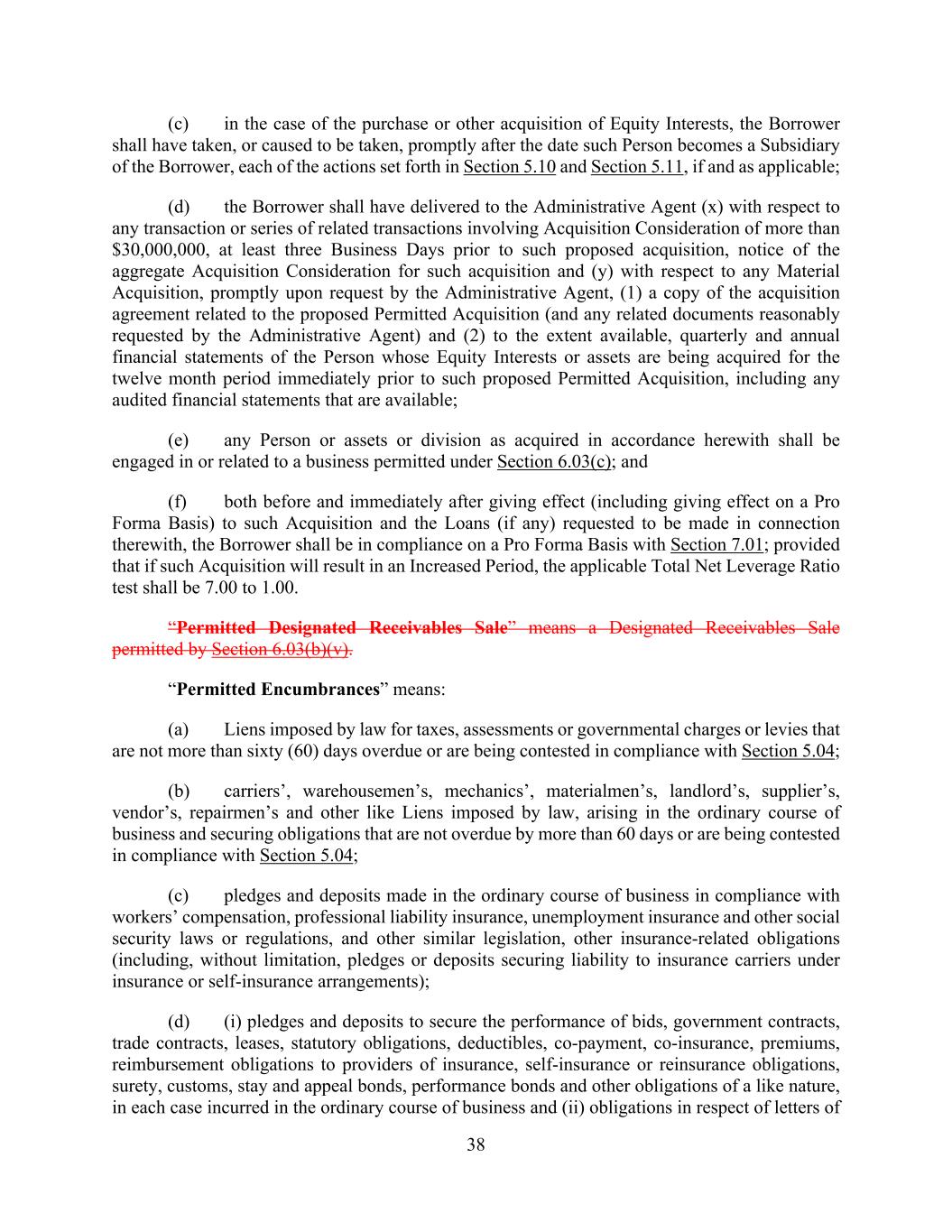 38 (c) in the case of the purchase or other acquisition of Equity Interests, the Borrower shall have taken, or caused to be taken, promptly after the date such Person becomes a Subsidiary of the Borrower, each of the actions set forth in Section 5.10 and Section 5.11, if and as applicable; (d) the Borrower shall have delivered to the Administrative Agent (x) with respect to any transaction or series of related transactions involving Acquisition Consideration of more than $30,000,000, at least three Business Days prior to such proposed acquisition, notice of the aggregate Acquisition Consideration for such acquisition and (y) with respect to any Material Acquisition, promptly upon request by the Administrative Agent, (1) a copy of the acquisition agreement related to the proposed Permitted Acquisition (and any related documents reasonably requested by the Administrative Agent) and (2) to the extent available, quarterly and annual financial statements of the Person whose Equity Interests or assets are being acquired for the twelve month period immediately prior to such proposed Permitted Acquisition, including any audited financial statements that are available; (e) any Person or assets or division as acquired in accordance herewith shall be engaged in or related to a business permitted under Section 6.03(c); and (f) both before and immediately after giving effect (including giving effect on a Pro Forma Basis) to such Acquisition and the Loans (if any) requested to be made in connection therewith, the Borrower shall be in compliance on a Pro Forma Basis with Section 7.01; provided that if such Acquisition will result in an Increased Period, the applicable Total Net Leverage Ratio test shall be 7.00 to 1.00. “Permitted Designated Receivables Sale” means a Designated Receivables Sale permitted by Section 6.03(b)(v). “Permitted Encumbrances” means: (a) Liens imposed by law for taxes, assessments or governmental charges or levies that are not more than sixty (60) days overdue or are being contested in compliance with Section 5.04; (b) carriers’, warehousemen’s, mechanics’, materialmen’s, landlord’s, supplier’s, vendor’s, repairmen’s and other like Liens imposed by law, arising in the ordinary course of business and securing obligations that are not overdue by more than 60 days or are being contested in compliance with Section 5.04; (c) pledges and deposits made in the ordinary course of business in compliance with workers’ compensation, professional liability insurance, unemployment insurance and other social security laws or regulations, and other similar legislation, other insurance-related obligations (including, without limitation, pledges or deposits securing liability to insurance carriers under insurance or self-insurance arrangements); (d) (i) pledges and deposits to secure the performance of bids, government contracts, trade contracts, leases, statutory obligations, deductibles, co-payment, co-insurance, premiums, reimbursement obligations to providers of insurance, self-insurance or reinsurance obligations, surety, customs, stay and appeal bonds, performance bonds and other obligations of a like nature, in each case incurred in the ordinary course of business and (ii) obligations in respect of letters of