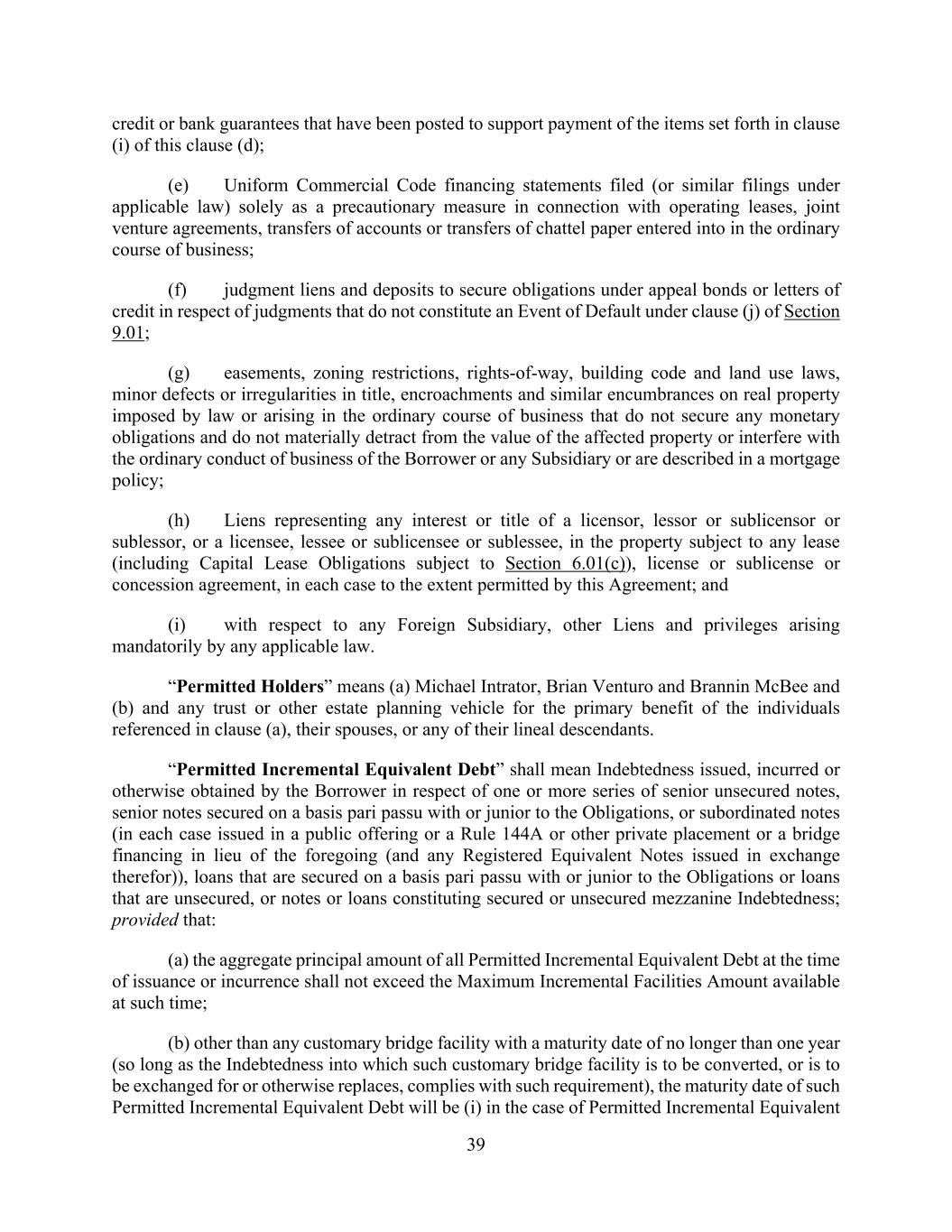 39 credit or bank guarantees that have been posted to support payment of the items set forth in clause (i) of this clause (d); (e) Uniform Commercial Code financing statements filed (or similar filings under applicable law) solely as a precautionary measure in connection with operating leases, joint venture agreements, transfers of accounts or transfers of chattel paper entered into in the ordinary course of business; (f) judgment liens and deposits to secure obligations under appeal bonds or letters of credit in respect of judgments that do not constitute an Event of Default under clause (j) of Section 9.01; (g) easements, zoning restrictions, rights-of-way, building code and land use laws, minor defects or irregularities in title, encroachments and similar encumbrances on real property imposed by law or arising in the ordinary course of business that do not secure any monetary obligations and do not materially detract from the value of the affected property or interfere with the ordinary conduct of business of the Borrower or any Subsidiary or are described in a mortgage policy; (h) Liens representing any interest or title of a licensor, lessor or sublicensor or sublessor, or a licensee, lessee or sublicensee or sublessee, in the property subject to any lease (including Capital Lease Obligations subject to Section 6.01(c)), license or sublicense or concession agreement, in each case to the extent permitted by this Agreement; and (i) with respect to any Foreign Subsidiary, other Liens and privileges arising mandatorily by any applicable law. “Permitted Holders” means (a) Michael Intrator, Brian Venturo and Brannin McBee and (b) and any trust or other estate planning vehicle for the primary benefit of the individuals referenced in clause (a), their spouses, or any of their lineal descendants. “Permitted Incremental Equivalent Debt” shall mean Indebtedness issued, incurred or otherwise obtained by the Borrower in respect of one or more series of senior unsecured notes, senior notes secured on a basis pari passu with or junior to the Obligations, or subordinated notes (in each case issued in a public offering or a Rule 144A or other private placement or a bridge financing in lieu of the foregoing (and any Registered Equivalent Notes issued in exchange therefor)), loans that are secured on a basis pari passu with or junior to the Obligations or loans that are unsecured, or notes or loans constituting secured or unsecured mezzanine Indebtedness; provided that: (a) the aggregate principal amount of all Permitted Incremental Equivalent Debt at the time of issuance or incurrence shall not exceed the Maximum Incremental Facilities Amount available at such time; (b) other than any customary bridge facility with a maturity date of no longer than one year (so long as the Indebtedness into which such customary bridge facility is to be converted, or is to be exchanged for or otherwise replaces, complies with such requirement), the maturity date of such Permitted Incremental Equivalent Debt will be (i) in the case of Permitted Incremental Equivalent