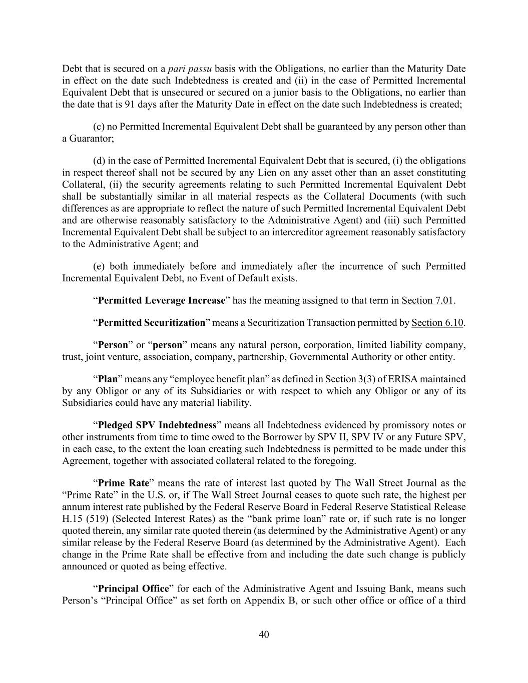 40 Debt that is secured on a pari passu basis with the Obligations, no earlier than the Maturity Date in effect on the date such Indebtedness is created and (ii) in the case of Permitted Incremental Equivalent Debt that is unsecured or secured on a junior basis to the Obligations, no earlier than the date that is 91 days after the Maturity Date in effect on the date such Indebtedness is created; (c) no Permitted Incremental Equivalent Debt shall be guaranteed by any person other than a Guarantor; (d) in the case of Permitted Incremental Equivalent Debt that is secured, (i) the obligations in respect thereof shall not be secured by any Lien on any asset other than an asset constituting Collateral, (ii) the security agreements relating to such Permitted Incremental Equivalent Debt shall be substantially similar in all material respects as the Collateral Documents (with such differences as are appropriate to reflect the nature of such Permitted Incremental Equivalent Debt and are otherwise reasonably satisfactory to the Administrative Agent) and (iii) such Permitted Incremental Equivalent Debt shall be subject to an intercreditor agreement reasonably satisfactory to the Administrative Agent; and (e) both immediately before and immediately after the incurrence of such Permitted Incremental Equivalent Debt, no Event of Default exists. “Permitted Leverage Increase” has the meaning assigned to that term in Section 7.01. “Permitted Securitization” means a Securitization Transaction permitted by Section 6.10. “Person” or “person” means any natural person, corporation, limited liability company, trust, joint venture, association, company, partnership, Governmental Authority or other entity. “Plan” means any “employee benefit plan” as defined in Section 3(3) of ERISA maintained by any Obligor or any of its Subsidiaries or with respect to which any Obligor or any of its Subsidiaries could have any material liability. “Pledged SPV Indebtedness” means all Indebtedness evidenced by promissory notes or other instruments from time to time owed to the Borrower by SPV II, SPV IV or any Future SPV, in each case, to the extent the loan creating such Indebtedness is permitted to be made under this Agreement, together with associated collateral related to the foregoing. “Prime Rate” means the rate of interest last quoted by The Wall Street Journal as the “Prime Rate” in the U.S. or, if The Wall Street Journal ceases to quote such rate, the highest per annum interest rate published by the Federal Reserve Board in Federal Reserve Statistical Release H.15 (519) (Selected Interest Rates) as the “bank prime loan” rate or, if such rate is no longer quoted therein, any similar rate quoted therein (as determined by the Administrative Agent) or any similar release by the Federal Reserve Board (as determined by the Administrative Agent). Each change in the Prime Rate shall be effective from and including the date such change is publicly announced or quoted as being effective. “Principal Office” for each of the Administrative Agent and Issuing Bank, means such Person’s “Principal Office” as set forth on Appendix B, or such other office or office of a third