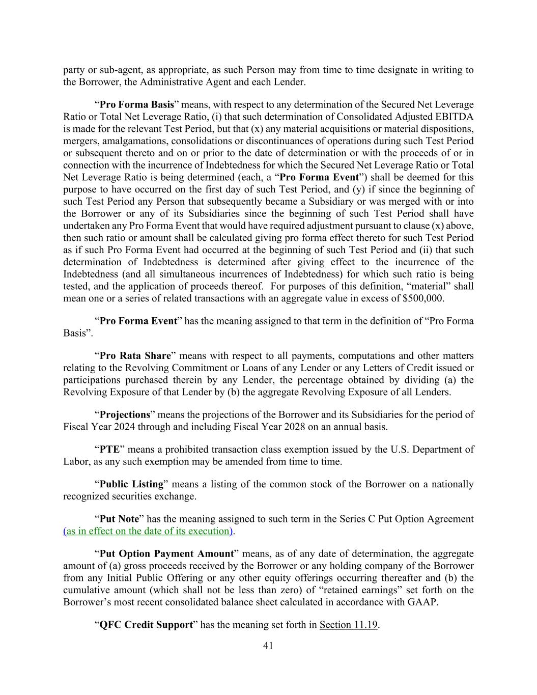41 party or sub-agent, as appropriate, as such Person may from time to time designate in writing to the Borrower, the Administrative Agent and each Lender. “Pro Forma Basis” means, with respect to any determination of the Secured Net Leverage Ratio or Total Net Leverage Ratio, (i) that such determination of Consolidated Adjusted EBITDA is made for the relevant Test Period, but that (x) any material acquisitions or material dispositions, mergers, amalgamations, consolidations or discontinuances of operations during such Test Period or subsequent thereto and on or prior to the date of determination or with the proceeds of or in connection with the incurrence of Indebtedness for which the Secured Net Leverage Ratio or Total Net Leverage Ratio is being determined (each, a “Pro Forma Event”) shall be deemed for this purpose to have occurred on the first day of such Test Period, and (y) if since the beginning of such Test Period any Person that subsequently became a Subsidiary or was merged with or into the Borrower or any of its Subsidiaries since the beginning of such Test Period shall have undertaken any Pro Forma Event that would have required adjustment pursuant to clause (x) above, then such ratio or amount shall be calculated giving pro forma effect thereto for such Test Period as if such Pro Forma Event had occurred at the beginning of such Test Period and (ii) that such determination of Indebtedness is determined after giving effect to the incurrence of the Indebtedness (and all simultaneous incurrences of Indebtedness) for which such ratio is being tested, and the application of proceeds thereof. For purposes of this definition, “material” shall mean one or a series of related transactions with an aggregate value in excess of $500,000. “Pro Forma Event” has the meaning assigned to that term in the definition of “Pro Forma Basis”. “Pro Rata Share” means with respect to all payments, computations and other matters relating to the Revolving Commitment or Loans of any Lender or any Letters of Credit issued or participations purchased therein by any Lender, the percentage obtained by dividing (a) the Revolving Exposure of that Lender by (b) the aggregate Revolving Exposure of all Lenders. “Projections” means the projections of the Borrower and its Subsidiaries for the period of Fiscal Year 2024 through and including Fiscal Year 2028 on an annual basis. “PTE” means a prohibited transaction class exemption issued by the U.S. Department of Labor, as any such exemption may be amended from time to time. “Public Listing” means a listing of the common stock of the Borrower on a nationally recognized securities exchange. “Put Note” has the meaning assigned to such term in the Series C Put Option Agreement (as in effect on the date of its execution). “Put Option Payment Amount” means, as of any date of determination, the aggregate amount of (a) gross proceeds received by the Borrower or any holding company of the Borrower from any Initial Public Offering or any other equity offerings occurring thereafter and (b) the cumulative amount (which shall not be less than zero) of “retained earnings” set forth on the Borrower’s most recent consolidated balance sheet calculated in accordance with GAAP. “QFC Credit Support” has the meaning set forth in Section 11.19.