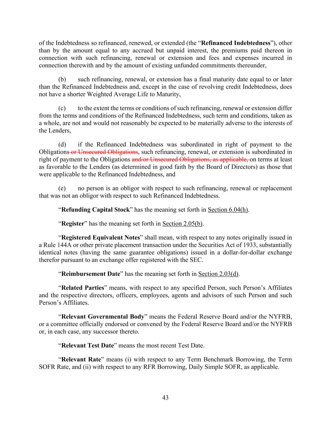 43 of the Indebtedness so refinanced, renewed, or extended (the “Refinanced Indebtedness”), other than by the amount equal to any accrued but unpaid interest, the premiums paid thereon in connection with such refinancing, renewal or extension and fees and expenses incurred in connection therewith and by the amount of existing unfunded commitments thereunder, (b) such refinancing, renewal, or extension has a final maturity date equal to or later than the Refinanced Indebtedness and, except in the case of revolving credit Indebtedness, does not have a shorter Weighted Average Life to Maturity, (c) to the extent the terms or conditions of such refinancing, renewal or extension differ from the terms and conditions of the Refinanced Indebtedness, such term and conditions, taken as a whole, are not and would not reasonably be expected to be materially adverse to the interests of the Lenders, (d) if the Refinanced Indebtedness was subordinated in right of payment to the Obligations or Unsecured Obligations, such refinancing, renewal, or extension is subordinated in right of payment to the Obligations and/or Unsecured Obligations, as applicable, on terms at least as favorable to the Lenders (as determined in good faith by the Board of Directors) as those that were applicable to the Refinanced Indebtedness, and (e) no person is an obligor with respect to such refinancing, renewal or replacement that was not an obligor with respect to such Refinanced Indebtedness. “Refunding Capital Stock” has the meaning set forth in Section 6.04(h). “Register” has the meaning set forth in Section 2.05(b). “Registered Equivalent Notes” shall mean, with respect to any notes originally issued in a Rule 144A or other private placement transaction under the Securities Act of 1933, substantially identical notes (having the same guarantee obligations) issued in a dollar-for-dollar exchange therefor pursuant to an exchange offer registered with the SEC. “Reimbursement Date” has the meaning set forth in Section 2.03(d). “Related Parties” means, with respect to any specified Person, such Person’s Affiliates and the respective directors, officers, employees, agents and advisors of such Person and such Person’s Affiliates. “Relevant Governmental Body” means the Federal Reserve Board and/or the NYFRB, or a committee officially endorsed or convened by the Federal Reserve Board and/or the NYFRB or, in each case, any successor thereto. “Relevant Test Date” means the most recent Test Date. “Relevant Rate” means (i) with respect to any Term Benchmark Borrowing, the Term SOFR Rate, and (ii) with respect to any RFR Borrowing, Daily Simple SOFR, as applicable.
