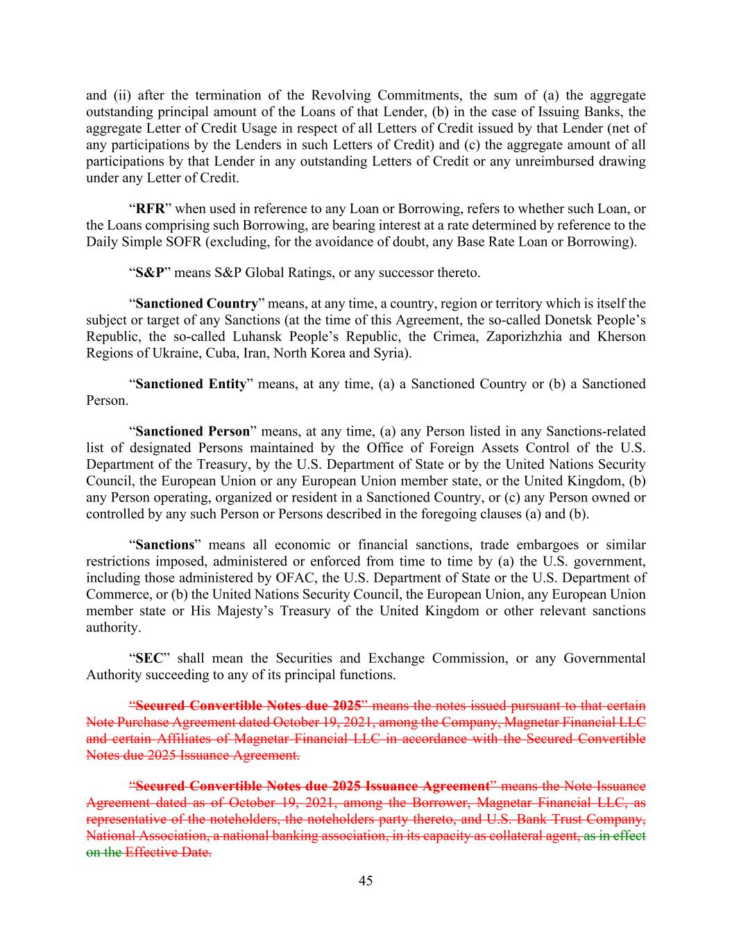 45 and (ii) after the termination of the Revolving Commitments, the sum of (a) the aggregate outstanding principal amount of the Loans of that Lender, (b) in the case of Issuing Banks, the aggregate Letter of Credit Usage in respect of all Letters of Credit issued by that Lender (net of any participations by the Lenders in such Letters of Credit) and (c) the aggregate amount of all participations by that Lender in any outstanding Letters of Credit or any unreimbursed drawing under any Letter of Credit. “RFR” when used in reference to any Loan or Borrowing, refers to whether such Loan, or the Loans comprising such Borrowing, are bearing interest at a rate determined by reference to the Daily Simple SOFR (excluding, for the avoidance of doubt, any Base Rate Loan or Borrowing). “S&P” means S&P Global Ratings, or any successor thereto. “Sanctioned Country” means, at any time, a country, region or territory which is itself the subject or target of any Sanctions (at the time of this Agreement, the so-called Donetsk People’s Republic, the so-called Luhansk People’s Republic, the Crimea, Zaporizhzhia and Kherson Regions of Ukraine, Cuba, Iran, North Korea and Syria). “Sanctioned Entity” means, at any time, (a) a Sanctioned Country or (b) a Sanctioned Person. “Sanctioned Person” means, at any time, (a) any Person listed in any Sanctions-related list of designated Persons maintained by the Office of Foreign Assets Control of the U.S. Department of the Treasury, by the U.S. Department of State or by the United Nations Security Council, the European Union or any European Union member state, or the United Kingdom, (b) any Person operating, organized or resident in a Sanctioned Country, or (c) any Person owned or controlled by any such Person or Persons described in the foregoing clauses (a) and (b). “Sanctions” means all economic or financial sanctions, trade embargoes or similar restrictions imposed, administered or enforced from time to time by (a) the U.S. government, including those administered by OFAC, the U.S. Department of State or the U.S. Department of Commerce, or (b) the United Nations Security Council, the European Union, any European Union member state or His Majesty’s Treasury of the United Kingdom or other relevant sanctions authority. “SEC” shall mean the Securities and Exchange Commission, or any Governmental Authority succeeding to any of its principal functions. “Secured Convertible Notes due 2025” means the notes issued pursuant to that certain Note Purchase Agreement dated October 19, 2021, among the Company, Magnetar Financial LLC and certain Affiliates of Magnetar Financial LLC in accordance with the Secured Convertible Notes due 2025 Issuance Agreement. “Secured Convertible Notes due 2025 Issuance Agreement” means the Note Issuance Agreement dated as of October 19, 2021, among the Borrower, Magnetar Financial LLC, as representative of the noteholders, the noteholders party thereto, and U.S. Bank Trust Company, National Association, a national banking association, in its capacity as collateral agent, as in effect on the Effective Date.