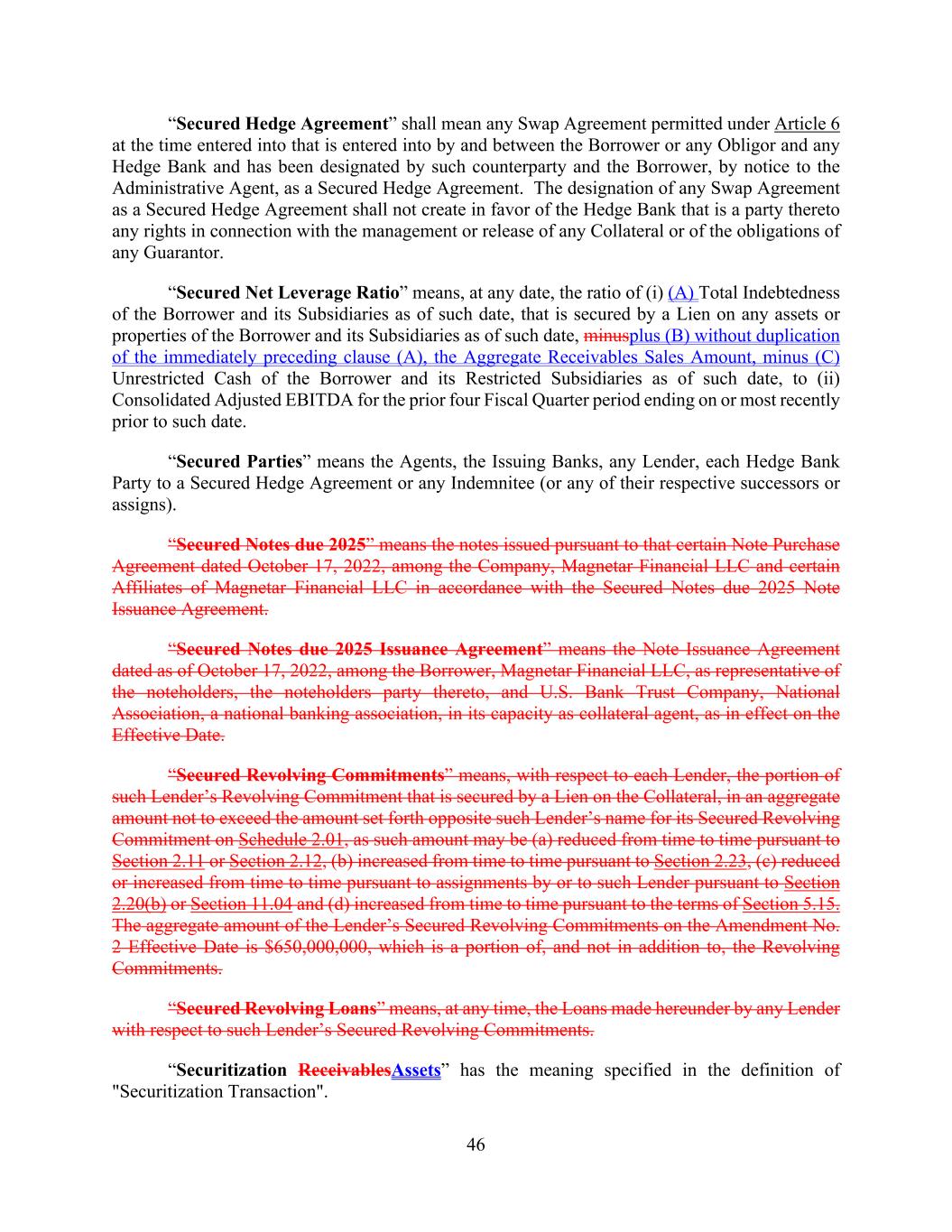 46 “Secured Hedge Agreement” shall mean any Swap Agreement permitted under Article 6 at the time entered into that is entered into by and between the Borrower or any Obligor and any Hedge Bank and has been designated by such counterparty and the Borrower, by notice to the Administrative Agent, as a Secured Hedge Agreement. The designation of any Swap Agreement as a Secured Hedge Agreement shall not create in favor of the Hedge Bank that is a party thereto any rights in connection with the management or release of any Collateral or of the obligations of any Guarantor. “Secured Net Leverage Ratio” means, at any date, the ratio of (i) (A) Total Indebtedness of the Borrower and its Subsidiaries as of such date, that is secured by a Lien on any assets or properties of the Borrower and its Subsidiaries as of such date, minusplus (B) without duplication of the immediately preceding clause (A), the Aggregate Receivables Sales Amount, minus (C) Unrestricted Cash of the Borrower and its Restricted Subsidiaries as of such date, to (ii) Consolidated Adjusted EBITDA for the prior four Fiscal Quarter period ending on or most recently prior to such date. “Secured Parties” means the Agents, the Issuing Banks, any Lender, each Hedge Bank Party to a Secured Hedge Agreement or any Indemnitee (or any of their respective successors or assigns). “Secured Notes due 2025” means the notes issued pursuant to that certain Note Purchase Agreement dated October 17, 2022, among the Company, Magnetar Financial LLC and certain Affiliates of Magnetar Financial LLC in accordance with the Secured Notes due 2025 Note Issuance Agreement. “Secured Notes due 2025 Issuance Agreement” means the Note Issuance Agreement dated as of October 17, 2022, among the Borrower, Magnetar Financial LLC, as representative of the noteholders, the noteholders party thereto, and U.S. Bank Trust Company, National Association, a national banking association, in its capacity as collateral agent, as in effect on the Effective Date. “Secured Revolving Commitments” means, with respect to each Lender, the portion of such Lender’s Revolving Commitment that is secured by a Lien on the Collateral, in an aggregate amount not to exceed the amount set forth opposite such Lender’s name for its Secured Revolving Commitment on Schedule 2.01, as such amount may be (a) reduced from time to time pursuant to Section 2.11 or Section 2.12, (b) increased from time to time pursuant to Section 2.23, (c) reduced or increased from time to time pursuant to assignments by or to such Lender pursuant to Section 2.20(b) or Section 11.04 and (d) increased from time to time pursuant to the terms of Section 5.15. The aggregate amount of the Lender’s Secured Revolving Commitments on the Amendment No. 2 Effective Date is $650,000,000, which is a portion of, and not in addition to, the Revolving Commitments. “Secured Revolving Loans” means, at any time, the Loans made hereunder by any Lender with respect to such Lender’s Secured Revolving Commitments. “Securitization ReceivablesAssets” has the meaning specified in the definition of "Securitization Transaction".
