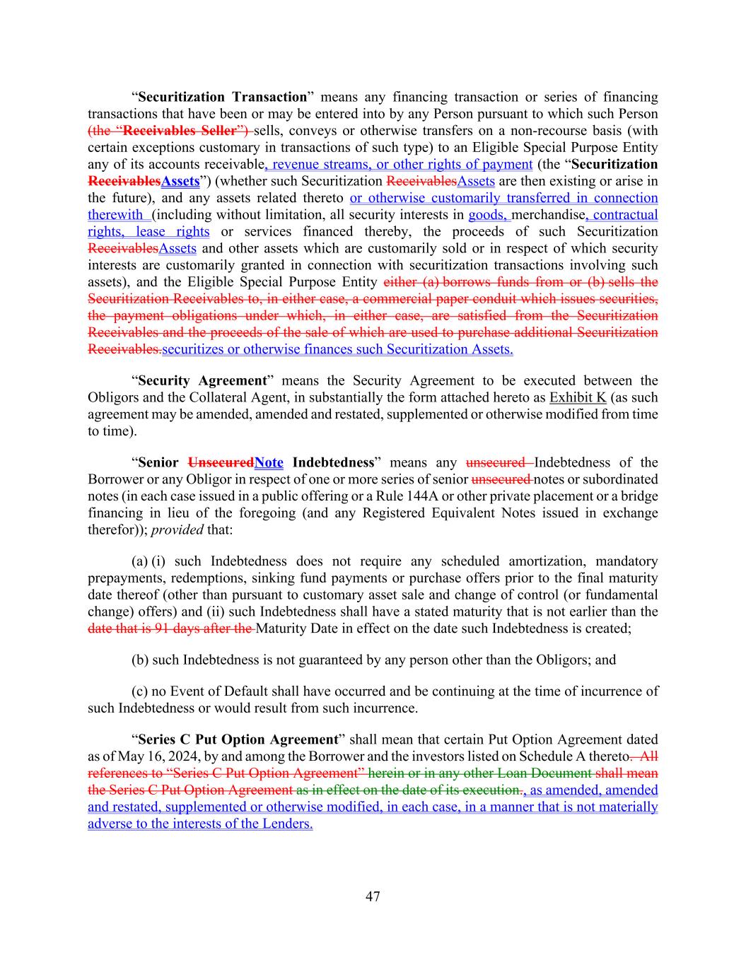 47 “Securitization Transaction” means any financing transaction or series of financing transactions that have been or may be entered into by any Person pursuant to which such Person (the “Receivables Seller”) sells, conveys or otherwise transfers on a non-recourse basis (with certain exceptions customary in transactions of such type) to an Eligible Special Purpose Entity any of its accounts receivable, revenue streams, or other rights of payment (the “Securitization ReceivablesAssets”) (whether such Securitization ReceivablesAssets are then existing or arise in the future), and any assets related thereto or otherwise customarily transferred in connection therewith (including without limitation, all security interests in goods, merchandise, contractual rights, lease rights or services financed thereby, the proceeds of such Securitization ReceivablesAssets and other assets which are customarily sold or in respect of which security interests are customarily granted in connection with securitization transactions involving such assets), and the Eligible Special Purpose Entity either (a) borrows funds from or (b) sells the Securitization Receivables to, in either case, a commercial paper conduit which issues securities, the payment obligations under which, in either case, are satisfied from the Securitization Receivables and the proceeds of the sale of which are used to purchase additional Securitization Receivables.securitizes or otherwise finances such Securitization Assets. “Security Agreement” means the Security Agreement to be executed between the Obligors and the Collateral Agent, in substantially the form attached hereto as Exhibit K (as such agreement may be amended, amended and restated, supplemented or otherwise modified from time to time). “Senior UnsecuredNote Indebtedness” means any unsecured Indebtedness of the Borrower or any Obligor in respect of one or more series of senior unsecured notes or subordinated notes (in each case issued in a public offering or a Rule 144A or other private placement or a bridge financing in lieu of the foregoing (and any Registered Equivalent Notes issued in exchange therefor)); provided that: (a) (i) such Indebtedness does not require any scheduled amortization, mandatory prepayments, redemptions, sinking fund payments or purchase offers prior to the final maturity date thereof (other than pursuant to customary asset sale and change of control (or fundamental change) offers) and (ii) such Indebtedness shall have a stated maturity that is not earlier than the date that is 91 days after the Maturity Date in effect on the date such Indebtedness is created; (b) such Indebtedness is not guaranteed by any person other than the Obligors; and (c) no Event of Default shall have occurred and be continuing at the time of incurrence of such Indebtedness or would result from such incurrence. “Series C Put Option Agreement” shall mean that certain Put Option Agreement dated as of May 16, 2024, by and among the Borrower and the investors listed on Schedule A thereto. All references to “Series C Put Option Agreement” herein or in any other Loan Document shall mean the Series C Put Option Agreement as in effect on the date of its execution., as amended, amended and restated, supplemented or otherwise modified, in each case, in a manner that is not materially adverse to the interests of the Lenders.
