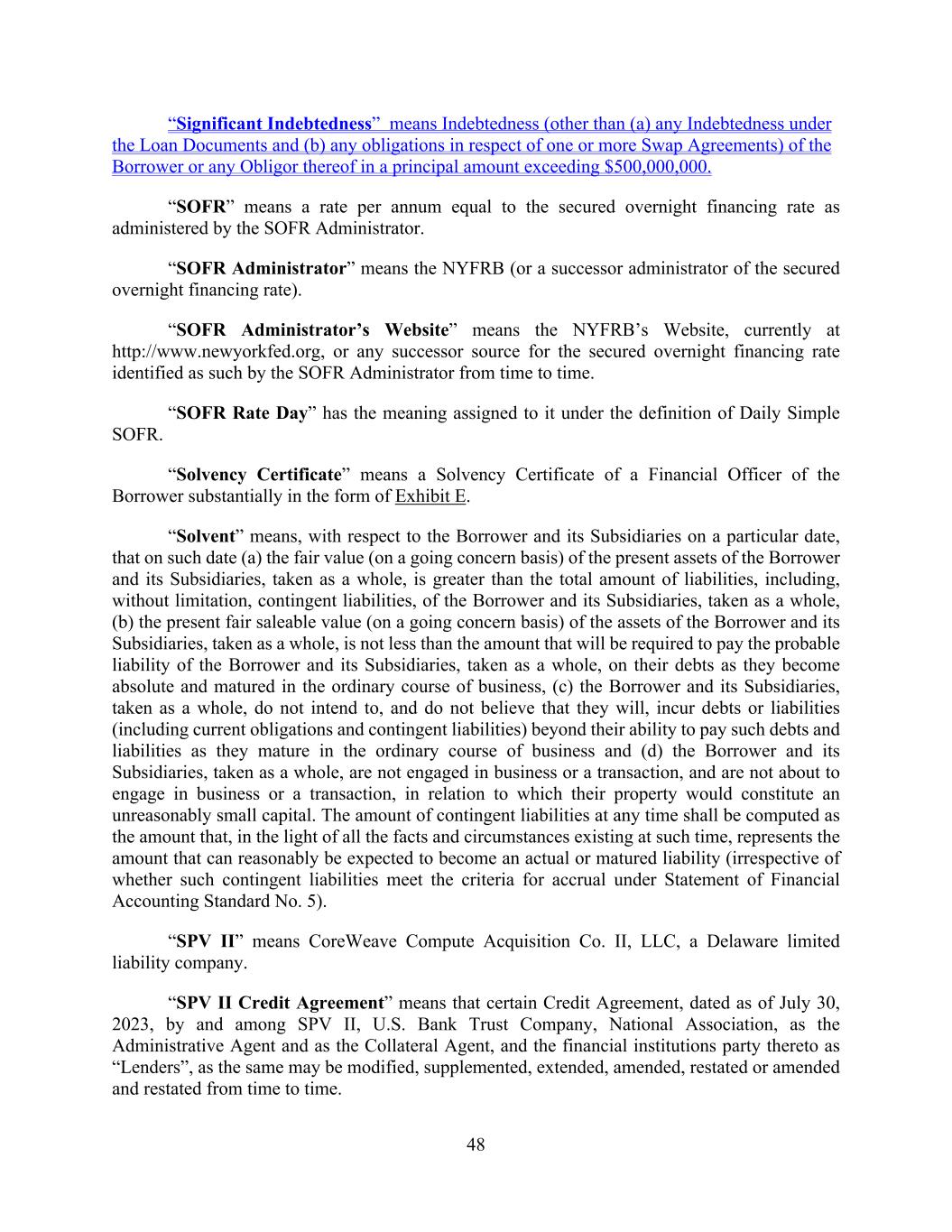 48 “Significant Indebtedness” means Indebtedness (other than (a) any Indebtedness under the Loan Documents and (b) any obligations in respect of one or more Swap Agreements) of the Borrower or any Obligor thereof in a principal amount exceeding $500,000,000. “SOFR” means a rate per annum equal to the secured overnight financing rate as administered by the SOFR Administrator. “SOFR Administrator” means the NYFRB (or a successor administrator of the secured overnight financing rate). “SOFR Administrator’s Website” means the NYFRB’s Website, currently at http://www.newyorkfed.org, or any successor source for the secured overnight financing rate identified as such by the SOFR Administrator from time to time. “SOFR Rate Day” has the meaning assigned to it under the definition of Daily Simple SOFR. “Solvency Certificate” means a Solvency Certificate of a Financial Officer of the Borrower substantially in the form of Exhibit E. “Solvent” means, with respect to the Borrower and its Subsidiaries on a particular date, that on such date (a) the fair value (on a going concern basis) of the present assets of the Borrower and its Subsidiaries, taken as a whole, is greater than the total amount of liabilities, including, without limitation, contingent liabilities, of the Borrower and its Subsidiaries, taken as a whole, (b) the present fair saleable value (on a going concern basis) of the assets of the Borrower and its Subsidiaries, taken as a whole, is not less than the amount that will be required to pay the probable liability of the Borrower and its Subsidiaries, taken as a whole, on their debts as they become absolute and matured in the ordinary course of business, (c) the Borrower and its Subsidiaries, taken as a whole, do not intend to, and do not believe that they will, incur debts or liabilities (including current obligations and contingent liabilities) beyond their ability to pay such debts and liabilities as they mature in the ordinary course of business and (d) the Borrower and its Subsidiaries, taken as a whole, are not engaged in business or a transaction, and are not about to engage in business or a transaction, in relation to which their property would constitute an unreasonably small capital. The amount of contingent liabilities at any time shall be computed as the amount that, in the light of all the facts and circumstances existing at such time, represents the amount that can reasonably be expected to become an actual or matured liability (irrespective of whether such contingent liabilities meet the criteria for accrual under Statement of Financial Accounting Standard No. 5). “SPV II” means CoreWeave Compute Acquisition Co. II, LLC, a Delaware limited liability company. “SPV II Credit Agreement” means that certain Credit Agreement, dated as of July 30, 2023, by and among SPV II, U.S. Bank Trust Company, National Association, as the Administrative Agent and as the Collateral Agent, and the financial institutions party thereto as “Lenders”, as the same may be modified, supplemented, extended, amended, restated or amended and restated from time to time.