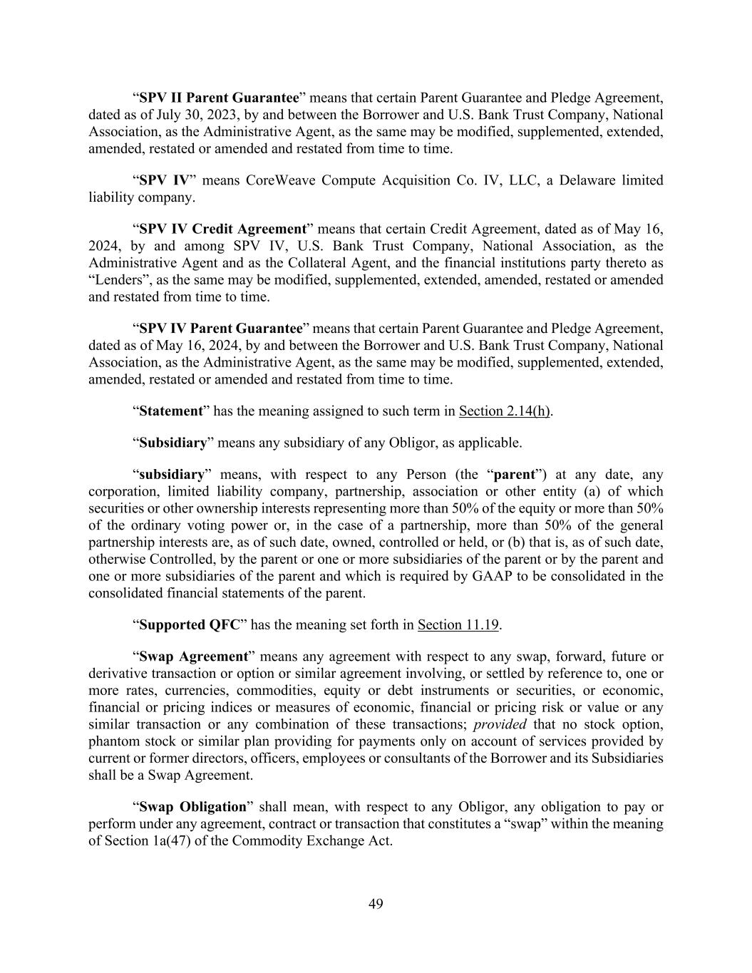 49 “SPV II Parent Guarantee” means that certain Parent Guarantee and Pledge Agreement, dated as of July 30, 2023, by and between the Borrower and U.S. Bank Trust Company, National Association, as the Administrative Agent, as the same may be modified, supplemented, extended, amended, restated or amended and restated from time to time. “SPV IV” means CoreWeave Compute Acquisition Co. IV, LLC, a Delaware limited liability company. “SPV IV Credit Agreement” means that certain Credit Agreement, dated as of May 16, 2024, by and among SPV IV, U.S. Bank Trust Company, National Association, as the Administrative Agent and as the Collateral Agent, and the financial institutions party thereto as “Lenders”, as the same may be modified, supplemented, extended, amended, restated or amended and restated from time to time. “SPV IV Parent Guarantee” means that certain Parent Guarantee and Pledge Agreement, dated as of May 16, 2024, by and between the Borrower and U.S. Bank Trust Company, National Association, as the Administrative Agent, as the same may be modified, supplemented, extended, amended, restated or amended and restated from time to time. “Statement” has the meaning assigned to such term in Section 2.14(h). “Subsidiary” means any subsidiary of any Obligor, as applicable. “subsidiary” means, with respect to any Person (the “parent”) at any date, any corporation, limited liability company, partnership, association or other entity (a) of which securities or other ownership interests representing more than 50% of the equity or more than 50% of the ordinary voting power or, in the case of a partnership, more than 50% of the general partnership interests are, as of such date, owned, controlled or held, or (b) that is, as of such date, otherwise Controlled, by the parent or one or more subsidiaries of the parent or by the parent and one or more subsidiaries of the parent and which is required by GAAP to be consolidated in the consolidated financial statements of the parent. “Supported QFC” has the meaning set forth in Section 11.19. “Swap Agreement” means any agreement with respect to any swap, forward, future or derivative transaction or option or similar agreement involving, or settled by reference to, one or more rates, currencies, commodities, equity or debt instruments or securities, or economic, financial or pricing indices or measures of economic, financial or pricing risk or value or any similar transaction or any combination of these transactions; provided that no stock option, phantom stock or similar plan providing for payments only on account of services provided by current or former directors, officers, employees or consultants of the Borrower and its Subsidiaries shall be a Swap Agreement. “Swap Obligation” shall mean, with respect to any Obligor, any obligation to pay or perform under any agreement, contract or transaction that constitutes a “swap” within the meaning of Section 1a(47) of the Commodity Exchange Act.