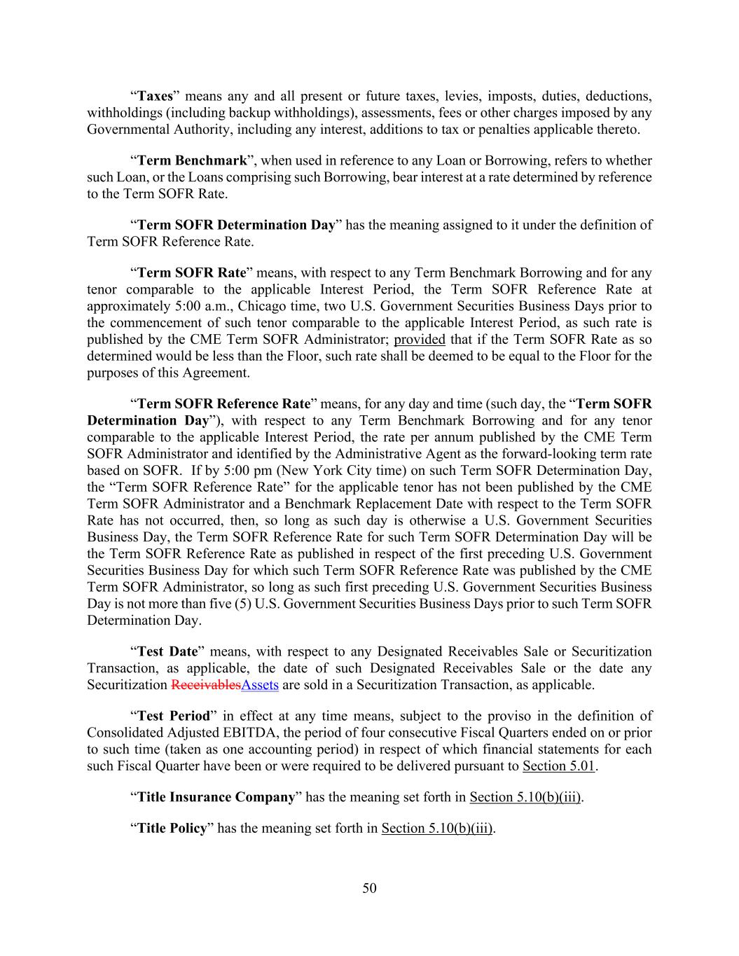 50 “Taxes” means any and all present or future taxes, levies, imposts, duties, deductions, withholdings (including backup withholdings), assessments, fees or other charges imposed by any Governmental Authority, including any interest, additions to tax or penalties applicable thereto. “Term Benchmark”, when used in reference to any Loan or Borrowing, refers to whether such Loan, or the Loans comprising such Borrowing, bear interest at a rate determined by reference to the Term SOFR Rate. “Term SOFR Determination Day” has the meaning assigned to it under the definition of Term SOFR Reference Rate. “Term SOFR Rate” means, with respect to any Term Benchmark Borrowing and for any tenor comparable to the applicable Interest Period, the Term SOFR Reference Rate at approximately 5:00 a.m., Chicago time, two U.S. Government Securities Business Days prior to the commencement of such tenor comparable to the applicable Interest Period, as such rate is published by the CME Term SOFR Administrator; provided that if the Term SOFR Rate as so determined would be less than the Floor, such rate shall be deemed to be equal to the Floor for the purposes of this Agreement. “Term SOFR Reference Rate” means, for any day and time (such day, the “Term SOFR Determination Day”), with respect to any Term Benchmark Borrowing and for any tenor comparable to the applicable Interest Period, the rate per annum published by the CME Term SOFR Administrator and identified by the Administrative Agent as the forward-looking term rate based on SOFR. If by 5:00 pm (New York City time) on such Term SOFR Determination Day, the “Term SOFR Reference Rate” for the applicable tenor has not been published by the CME Term SOFR Administrator and a Benchmark Replacement Date with respect to the Term SOFR Rate has not occurred, then, so long as such day is otherwise a U.S. Government Securities Business Day, the Term SOFR Reference Rate for such Term SOFR Determination Day will be the Term SOFR Reference Rate as published in respect of the first preceding U.S. Government Securities Business Day for which such Term SOFR Reference Rate was published by the CME Term SOFR Administrator, so long as such first preceding U.S. Government Securities Business Day is not more than five (5) U.S. Government Securities Business Days prior to such Term SOFR Determination Day. “Test Date” means, with respect to any Designated Receivables Sale or Securitization Transaction, as applicable, the date of such Designated Receivables Sale or the date any Securitization ReceivablesAssets are sold in a Securitization Transaction, as applicable. “Test Period” in effect at any time means, subject to the proviso in the definition of Consolidated Adjusted EBITDA, the period of four consecutive Fiscal Quarters ended on or prior to such time (taken as one accounting period) in respect of which financial statements for each such Fiscal Quarter have been or were required to be delivered pursuant to Section 5.01. “Title Insurance Company” has the meaning set forth in Section 5.10(b)(iii). “Title Policy” has the meaning set forth in Section 5.10(b)(iii).
