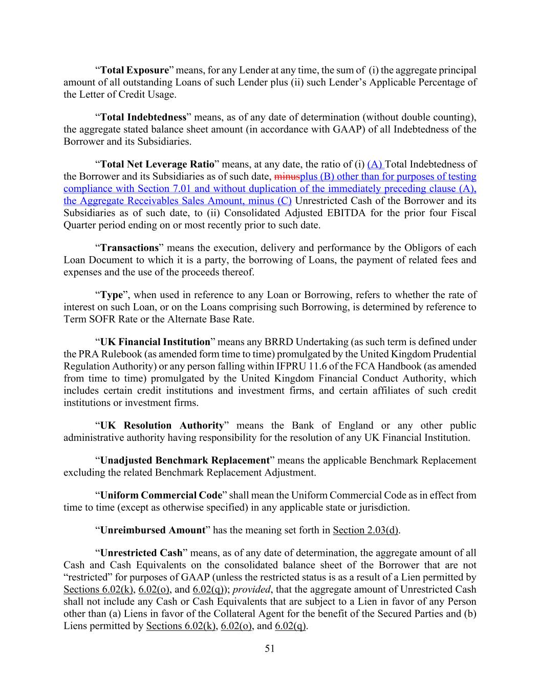 51 “Total Exposure” means, for any Lender at any time, the sum of (i) the aggregate principal amount of all outstanding Loans of such Lender plus (ii) such Lender’s Applicable Percentage of the Letter of Credit Usage. “Total Indebtedness” means, as of any date of determination (without double counting), the aggregate stated balance sheet amount (in accordance with GAAP) of all Indebtedness of the Borrower and its Subsidiaries. “Total Net Leverage Ratio” means, at any date, the ratio of (i) (A) Total Indebtedness of the Borrower and its Subsidiaries as of such date, minusplus (B) other than for purposes of testing compliance with Section 7.01 and without duplication of the immediately preceding clause (A), the Aggregate Receivables Sales Amount, minus (C) Unrestricted Cash of the Borrower and its Subsidiaries as of such date, to (ii) Consolidated Adjusted EBITDA for the prior four Fiscal Quarter period ending on or most recently prior to such date. “Transactions” means the execution, delivery and performance by the Obligors of each Loan Document to which it is a party, the borrowing of Loans, the payment of related fees and expenses and the use of the proceeds thereof. “Type”, when used in reference to any Loan or Borrowing, refers to whether the rate of interest on such Loan, or on the Loans comprising such Borrowing, is determined by reference to Term SOFR Rate or the Alternate Base Rate. “UK Financial Institution” means any BRRD Undertaking (as such term is defined under the PRA Rulebook (as amended form time to time) promulgated by the United Kingdom Prudential Regulation Authority) or any person falling within IFPRU 11.6 of the FCA Handbook (as amended from time to time) promulgated by the United Kingdom Financial Conduct Authority, which includes certain credit institutions and investment firms, and certain affiliates of such credit institutions or investment firms. “UK Resolution Authority” means the Bank of England or any other public administrative authority having responsibility for the resolution of any UK Financial Institution. “Unadjusted Benchmark Replacement” means the applicable Benchmark Replacement excluding the related Benchmark Replacement Adjustment. “Uniform Commercial Code” shall mean the Uniform Commercial Code as in effect from time to time (except as otherwise specified) in any applicable state or jurisdiction. “Unreimbursed Amount” has the meaning set forth in Section 2.03(d). “Unrestricted Cash” means, as of any date of determination, the aggregate amount of all Cash and Cash Equivalents on the consolidated balance sheet of the Borrower that are not “restricted” for purposes of GAAP (unless the restricted status is as a result of a Lien permitted by Sections 6.02(k), 6.02(o), and 6.02(q)); provided, that the aggregate amount of Unrestricted Cash shall not include any Cash or Cash Equivalents that are subject to a Lien in favor of any Person other than (a) Liens in favor of the Collateral Agent for the benefit of the Secured Parties and (b) Liens permitted by Sections 6.02(k), 6.02(o), and 6.02(q).