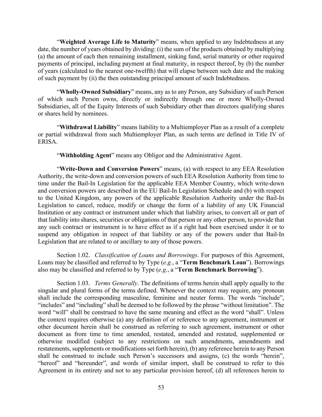 53 “Weighted Average Life to Maturity” means, when applied to any Indebtedness at any date, the number of years obtained by dividing: (i) the sum of the products obtained by multiplying (a) the amount of each then remaining installment, sinking fund, serial maturity or other required payments of principal, including payment at final maturity, in respect thereof, by (b) the number of years (calculated to the nearest one-twelfth) that will elapse between such date and the making of such payment by (ii) the then outstanding principal amount of such Indebtedness. “Wholly-Owned Subsidiary” means, any as to any Person, any Subsidiary of such Person of which such Person owns, directly or indirectly through one or more Wholly-Owned Subsidiaries, all of the Equity Interests of such Subsidiary other than directors qualifying shares or shares held by nominees. “Withdrawal Liability” means liability to a Multiemployer Plan as a result of a complete or partial withdrawal from such Multiemployer Plan, as such terms are defined in Title IV of ERISA. “Withholding Agent” means any Obligor and the Administrative Agent. “Write-Down and Conversion Powers” means, (a) with respect to any EEA Resolution Authority, the write-down and conversion powers of such EEA Resolution Authority from time to time under the Bail-In Legislation for the applicable EEA Member Country, which write-down and conversion powers are described in the EU Bail-In Legislation Schedule and (b) with respect to the United Kingdom, any powers of the applicable Resolution Authority under the Bail-In Legislation to cancel, reduce, modify or change the form of a liability of any UK Financial Institution or any contract or instrument under which that liability arises, to convert all or part of that liability into shares, securities or obligations of that person or any other person, to provide that any such contract or instrument is to have effect as if a right had been exercised under it or to suspend any obligation in respect of that liability or any of the powers under that Bail-In Legislation that are related to or ancillary to any of those powers. Section 1.02. Classification of Loans and Borrowings. For purposes of this Agreement, Loans may be classified and referred to by Type (e.g., a “Term Benchmark Loan”). Borrowings also may be classified and referred to by Type (e.g., a “Term Benchmark Borrowing”). Section 1.03. Terms Generally. The definitions of terms herein shall apply equally to the singular and plural forms of the terms defined. Whenever the context may require, any pronoun shall include the corresponding masculine, feminine and neuter forms. The words “include”, “includes” and “including” shall be deemed to be followed by the phrase “without limitation”. The word “will” shall be construed to have the same meaning and effect as the word “shall”. Unless the context requires otherwise (a) any definition of or reference to any agreement, instrument or other document herein shall be construed as referring to such agreement, instrument or other document as from time to time amended, restated, amended and restated, supplemented or otherwise modified (subject to any restrictions on such amendments, amendments and restatements, supplements or modifications set forth herein), (b) any reference herein to any Person shall be construed to include such Person’s successors and assigns, (c) the words “herein”, “hereof” and “hereunder”, and words of similar import, shall be construed to refer to this Agreement in its entirety and not to any particular provision hereof, (d) all references herein to