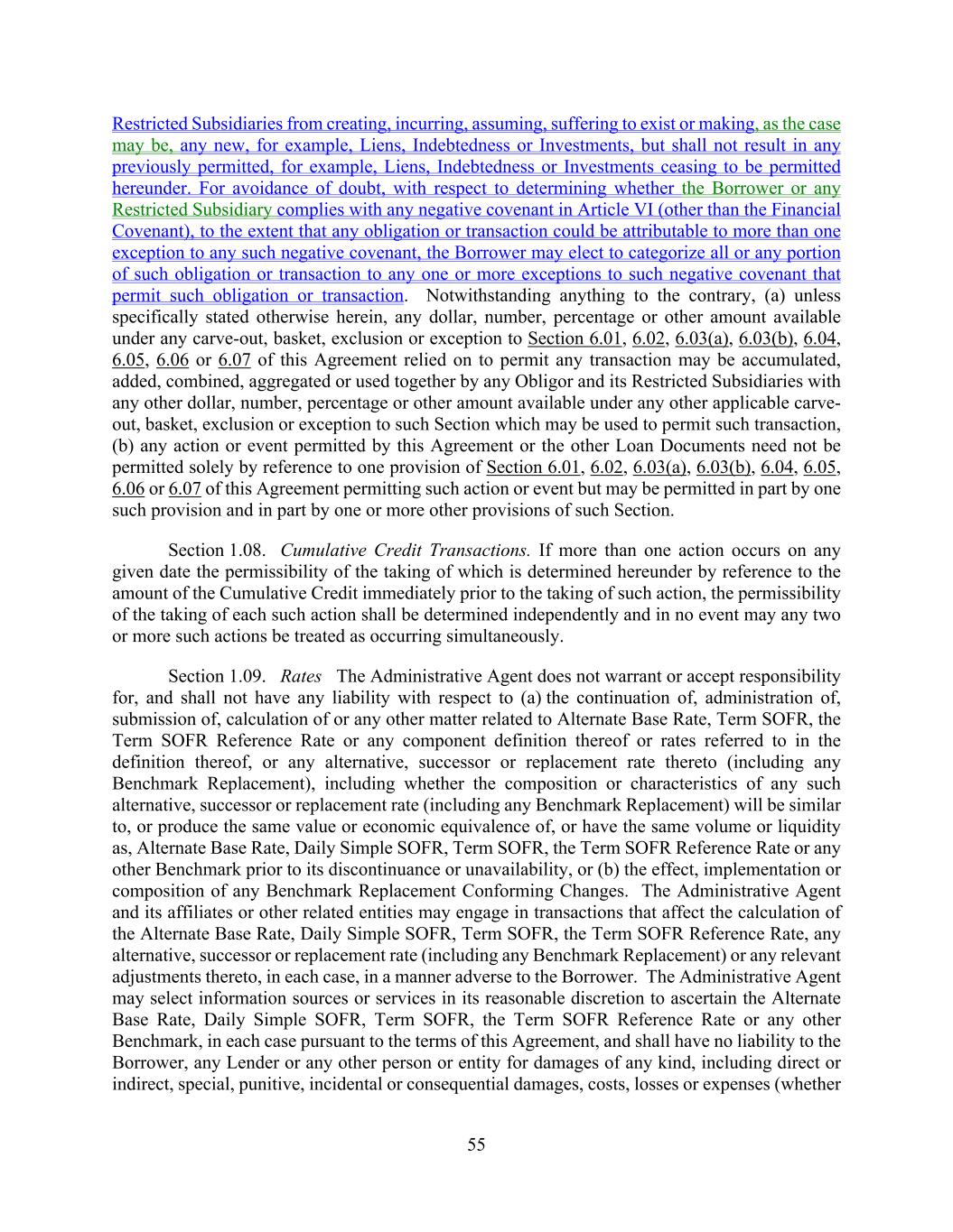 55 Restricted Subsidiaries from creating, incurring, assuming, suffering to exist or making, as the case may be, any new, for example, Liens, Indebtedness or Investments, but shall not result in any previously permitted, for example, Liens, Indebtedness or Investments ceasing to be permitted hereunder. For avoidance of doubt, with respect to determining whether the Borrower or any Restricted Subsidiary complies with any negative covenant in Article VI (other than the Financial Covenant), to the extent that any obligation or transaction could be attributable to more than one exception to any such negative covenant, the Borrower may elect to categorize all or any portion of such obligation or transaction to any one or more exceptions to such negative covenant that permit such obligation or transaction. Notwithstanding anything to the contrary, (a) unless specifically stated otherwise herein, any dollar, number, percentage or other amount available under any carve-out, basket, exclusion or exception to Section 6.01, 6.02, 6.03(a), 6.03(b), 6.04, 6.05, 6.06 or 6.07 of this Agreement relied on to permit any transaction may be accumulated, added, combined, aggregated or used together by any Obligor and its Restricted Subsidiaries with any other dollar, number, percentage or other amount available under any other applicable carve- out, basket, exclusion or exception to such Section which may be used to permit such transaction, (b) any action or event permitted by this Agreement or the other Loan Documents need not be permitted solely by reference to one provision of Section 6.01, 6.02, 6.03(a), 6.03(b), 6.04, 6.05, 6.06 or 6.07 of this Agreement permitting such action or event but may be permitted in part by one such provision and in part by one or more other provisions of such Section. Section 1.08. Cumulative Credit Transactions. If more than one action occurs on any given date the permissibility of the taking of which is determined hereunder by reference to the amount of the Cumulative Credit immediately prior to the taking of such action, the permissibility of the taking of each such action shall be determined independently and in no event may any two or more such actions be treated as occurring simultaneously. Section 1.09. Rates The Administrative Agent does not warrant or accept responsibility for, and shall not have any liability with respect to (a) the continuation of, administration of, submission of, calculation of or any other matter related to Alternate Base Rate, Term SOFR, the Term SOFR Reference Rate or any component definition thereof or rates referred to in the definition thereof, or any alternative, successor or replacement rate thereto (including any Benchmark Replacement), including whether the composition or characteristics of any such alternative, successor or replacement rate (including any Benchmark Replacement) will be similar to, or produce the same value or economic equivalence of, or have the same volume or liquidity as, Alternate Base Rate, Daily Simple SOFR, Term SOFR, the Term SOFR Reference Rate or any other Benchmark prior to its discontinuance or unavailability, or (b) the effect, implementation or composition of any Benchmark Replacement Conforming Changes. The Administrative Agent and its affiliates or other related entities may engage in transactions that affect the calculation of the Alternate Base Rate, Daily Simple SOFR, Term SOFR, the Term SOFR Reference Rate, any alternative, successor or replacement rate (including any Benchmark Replacement) or any relevant adjustments thereto, in each case, in a manner adverse to the Borrower. The Administrative Agent may select information sources or services in its reasonable discretion to ascertain the Alternate Base Rate, Daily Simple SOFR, Term SOFR, the Term SOFR Reference Rate or any other Benchmark, in each case pursuant to the terms of this Agreement, and shall have no liability to the Borrower, any Lender or any other person or entity for damages of any kind, including direct or indirect, special, punitive, incidental or consequential damages, costs, losses or expenses (whether