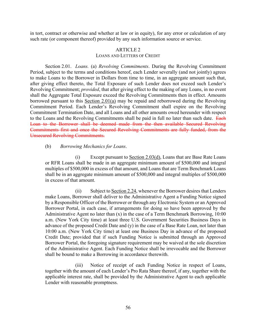 56 in tort, contract or otherwise and whether at law or in equity), for any error or calculation of any such rate (or component thereof) provided by any such information source or service. ARTICLE 2 LOANS AND LETTERS OF CREDIT Section 2.01. Loans. (a) Revolving Commitments. During the Revolving Commitment Period, subject to the terms and conditions hereof, each Lender severally (and not jointly) agrees to make Loans to the Borrower in Dollars from time to time, in an aggregate amount such that, after giving effect thereto, the Total Exposure of such Lender does not exceed such Lender’s Revolving Commitment; provided, that after giving effect to the making of any Loans, in no event shall the Aggregate Total Exposure exceed the Revolving Commitments then in effect. Amounts borrowed pursuant to this Section 2.01(a) may be repaid and reborrowed during the Revolving Commitment Period. Each Lender’s Revolving Commitment shall expire on the Revolving Commitment Termination Date, and all Loans and all other amounts owed hereunder with respect to the Loans and the Revolving Commitments shall be paid in full no later than such date. Each Loan to the Borrower shall be deemed made from the then available Secured Revolving Commitments first and once the Secured Revolving Commitments are fully funded, from the Unsecured Revolving Commitments. (b) Borrowing Mechanics for Loans. (i) Except pursuant to Section 2.03(d), Loans that are Base Rate Loans or RFR Loans shall be made in an aggregate minimum amount of $500,000 and integral multiples of $500,000 in excess of that amount, and Loans that are Term Benchmark Loans shall be in an aggregate minimum amount of $500,000 and integral multiples of $500,000 in excess of that amount. (ii) Subject to Section 2.24, whenever the Borrower desires that Lenders make Loans, Borrower shall deliver to the Administrative Agent a Funding Notice signed by a Responsible Officer of the Borrower or through any Electronic System or an Approved Borrower Portal, in each case, if arrangements for doing so have been approved by the Administrative Agent no later than (x) in the case of a Term Benchmark Borrowing, 10:00 a.m. (New York City time) at least three U.S. Government Securities Business Days in advance of the proposed Credit Date and (y) in the case of a Base Rate Loan, not later than 10:00 a.m. (New York City time) at least one Business Day in advance of the proposed Credit Date; provided that if such Funding Notice is submitted through an Approved Borrower Portal, the foregoing signature requirement may be waived at the sole discretion of the Administrative Agent. Each Funding Notice shall be irrevocable and the Borrower shall be bound to make a Borrowing in accordance therewith. (iii) Notice of receipt of each Funding Notice in respect of Loans, together with the amount of each Lender’s Pro Rata Share thereof, if any, together with the applicable interest rate, shall be provided by the Administrative Agent to each applicable Lender with reasonable promptness.