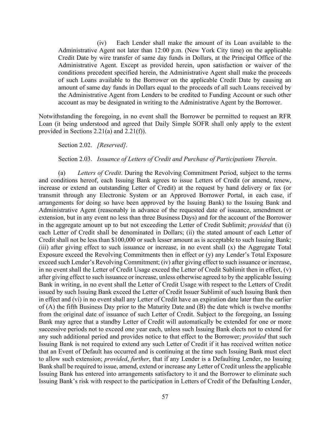 57 (iv) Each Lender shall make the amount of its Loan available to the Administrative Agent not later than 12:00 p.m. (New York City time) on the applicable Credit Date by wire transfer of same day funds in Dollars, at the Principal Office of the Administrative Agent. Except as provided herein, upon satisfaction or waiver of the conditions precedent specified herein, the Administrative Agent shall make the proceeds of such Loans available to the Borrower on the applicable Credit Date by causing an amount of same day funds in Dollars equal to the proceeds of all such Loans received by the Administrative Agent from Lenders to be credited to Funding Account or such other account as may be designated in writing to the Administrative Agent by the Borrower. Notwithstanding the foregoing, in no event shall the Borrower be permitted to request an RFR Loan (it being understood and agreed that Daily Simple SOFR shall only apply to the extent provided in Sections 2.21(a) and 2.21(f)). Section 2.02. [Reserved]. Section 2.03. Issuance of Letters of Credit and Purchase of Participations Therein. (a) Letters of Credit. During the Revolving Commitment Period, subject to the terms and conditions hereof, each Issuing Bank agrees to issue Letters of Credit (or amend, renew, increase or extend an outstanding Letter of Credit) at the request by hand delivery or fax (or transmit through any Electronic System or an Approved Borrower Portal, in each case, if arrangements for doing so have been approved by the Issuing Bank) to the Issuing Bank and Administrative Agent (reasonably in advance of the requested date of issuance, amendment or extension, but in any event no less than three Business Days) and for the account of the Borrower in the aggregate amount up to but not exceeding the Letter of Credit Sublimit; provided that (i) each Letter of Credit shall be denominated in Dollars; (ii) the stated amount of each Letter of Credit shall not be less than $100,000 or such lesser amount as is acceptable to such Issuing Bank; (iii) after giving effect to such issuance or increase, in no event shall (x) the Aggregate Total Exposure exceed the Revolving Commitments then in effect or (y) any Lender’s Total Exposure exceed such Lender’s Revolving Commitment; (iv) after giving effect to such issuance or increase, in no event shall the Letter of Credit Usage exceed the Letter of Credit Sublimit then in effect, (v) after giving effect to such issuance or increase, unless otherwise agreed to by the applicable Issuing Bank in writing, in no event shall the Letter of Credit Usage with respect to the Letters of Credit issued by such Issuing Bank exceed the Letter of Credit Issuer Sublimit of such Issuing Bank then in effect and (vi) in no event shall any Letter of Credit have an expiration date later than the earlier of (A) the fifth Business Day prior to the Maturity Date and (B) the date which is twelve months from the original date of issuance of such Letter of Credit. Subject to the foregoing, an Issuing Bank may agree that a standby Letter of Credit will automatically be extended for one or more successive periods not to exceed one year each, unless such Issuing Bank elects not to extend for any such additional period and provides notice to that effect to the Borrower; provided that such Issuing Bank is not required to extend any such Letter of Credit if it has received written notice that an Event of Default has occurred and is continuing at the time such Issuing Bank must elect to allow such extension; provided, further, that if any Lender is a Defaulting Lender, no Issuing Bank shall be required to issue, amend, extend or increase any Letter of Credit unless the applicable Issuing Bank has entered into arrangements satisfactory to it and the Borrower to eliminate such Issuing Bank’s risk with respect to the participation in Letters of Credit of the Defaulting Lender,