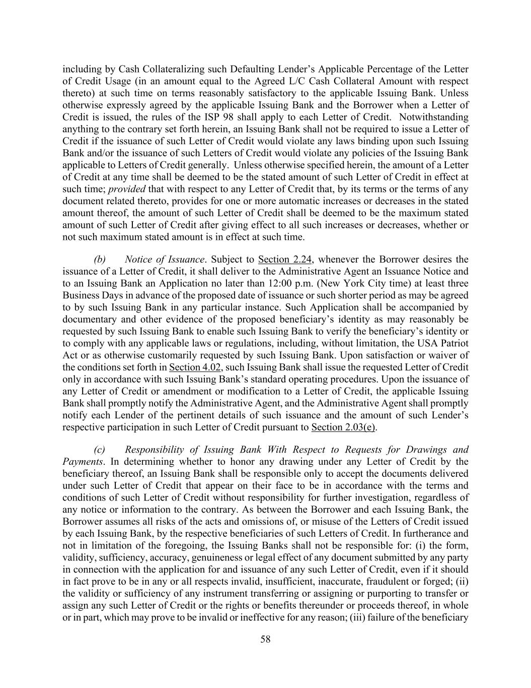 58 including by Cash Collateralizing such Defaulting Lender’s Applicable Percentage of the Letter of Credit Usage (in an amount equal to the Agreed L/C Cash Collateral Amount with respect thereto) at such time on terms reasonably satisfactory to the applicable Issuing Bank. Unless otherwise expressly agreed by the applicable Issuing Bank and the Borrower when a Letter of Credit is issued, the rules of the ISP 98 shall apply to each Letter of Credit. Notwithstanding anything to the contrary set forth herein, an Issuing Bank shall not be required to issue a Letter of Credit if the issuance of such Letter of Credit would violate any laws binding upon such Issuing Bank and/or the issuance of such Letters of Credit would violate any policies of the Issuing Bank applicable to Letters of Credit generally. Unless otherwise specified herein, the amount of a Letter of Credit at any time shall be deemed to be the stated amount of such Letter of Credit in effect at such time; provided that with respect to any Letter of Credit that, by its terms or the terms of any document related thereto, provides for one or more automatic increases or decreases in the stated amount thereof, the amount of such Letter of Credit shall be deemed to be the maximum stated amount of such Letter of Credit after giving effect to all such increases or decreases, whether or not such maximum stated amount is in effect at such time. (b) Notice of Issuance. Subject to Section 2.24, whenever the Borrower desires the issuance of a Letter of Credit, it shall deliver to the Administrative Agent an Issuance Notice and to an Issuing Bank an Application no later than 12:00 p.m. (New York City time) at least three Business Days in advance of the proposed date of issuance or such shorter period as may be agreed to by such Issuing Bank in any particular instance. Such Application shall be accompanied by documentary and other evidence of the proposed beneficiary’s identity as may reasonably be requested by such Issuing Bank to enable such Issuing Bank to verify the beneficiary’s identity or to comply with any applicable laws or regulations, including, without limitation, the USA Patriot Act or as otherwise customarily requested by such Issuing Bank. Upon satisfaction or waiver of the conditions set forth in Section 4.02, such Issuing Bank shall issue the requested Letter of Credit only in accordance with such Issuing Bank’s standard operating procedures. Upon the issuance of any Letter of Credit or amendment or modification to a Letter of Credit, the applicable Issuing Bank shall promptly notify the Administrative Agent, and the Administrative Agent shall promptly notify each Lender of the pertinent details of such issuance and the amount of such Lender’s respective participation in such Letter of Credit pursuant to Section 2.03(e). (c) Responsibility of Issuing Bank With Respect to Requests for Drawings and Payments. In determining whether to honor any drawing under any Letter of Credit by the beneficiary thereof, an Issuing Bank shall be responsible only to accept the documents delivered under such Letter of Credit that appear on their face to be in accordance with the terms and conditions of such Letter of Credit without responsibility for further investigation, regardless of any notice or information to the contrary. As between the Borrower and each Issuing Bank, the Borrower assumes all risks of the acts and omissions of, or misuse of the Letters of Credit issued by each Issuing Bank, by the respective beneficiaries of such Letters of Credit. In furtherance and not in limitation of the foregoing, the Issuing Banks shall not be responsible for: (i) the form, validity, sufficiency, accuracy, genuineness or legal effect of any document submitted by any party in connection with the application for and issuance of any such Letter of Credit, even if it should in fact prove to be in any or all respects invalid, insufficient, inaccurate, fraudulent or forged; (ii) the validity or sufficiency of any instrument transferring or assigning or purporting to transfer or assign any such Letter of Credit or the rights or benefits thereunder or proceeds thereof, in whole or in part, which may prove to be invalid or ineffective for any reason; (iii) failure of the beneficiary