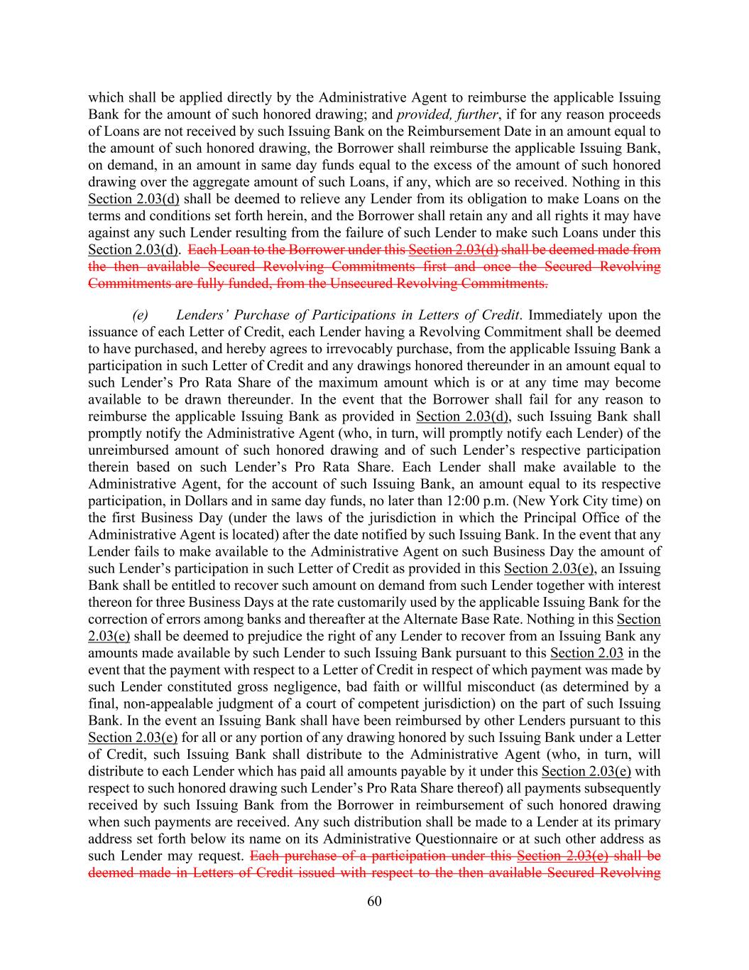 60 which shall be applied directly by the Administrative Agent to reimburse the applicable Issuing Bank for the amount of such honored drawing; and provided, further, if for any reason proceeds of Loans are not received by such Issuing Bank on the Reimbursement Date in an amount equal to the amount of such honored drawing, the Borrower shall reimburse the applicable Issuing Bank, on demand, in an amount in same day funds equal to the excess of the amount of such honored drawing over the aggregate amount of such Loans, if any, which are so received. Nothing in this Section 2.03(d) shall be deemed to relieve any Lender from its obligation to make Loans on the terms and conditions set forth herein, and the Borrower shall retain any and all rights it may have against any such Lender resulting from the failure of such Lender to make such Loans under this Section 2.03(d). Each Loan to the Borrower under this Section 2.03(d) shall be deemed made from the then available Secured Revolving Commitments first and once the Secured Revolving Commitments are fully funded, from the Unsecured Revolving Commitments. (e) Lenders’ Purchase of Participations in Letters of Credit. Immediately upon the issuance of each Letter of Credit, each Lender having a Revolving Commitment shall be deemed to have purchased, and hereby agrees to irrevocably purchase, from the applicable Issuing Bank a participation in such Letter of Credit and any drawings honored thereunder in an amount equal to such Lender’s Pro Rata Share of the maximum amount which is or at any time may become available to be drawn thereunder. In the event that the Borrower shall fail for any reason to reimburse the applicable Issuing Bank as provided in Section 2.03(d), such Issuing Bank shall promptly notify the Administrative Agent (who, in turn, will promptly notify each Lender) of the unreimbursed amount of such honored drawing and of such Lender’s respective participation therein based on such Lender’s Pro Rata Share. Each Lender shall make available to the Administrative Agent, for the account of such Issuing Bank, an amount equal to its respective participation, in Dollars and in same day funds, no later than 12:00 p.m. (New York City time) on the first Business Day (under the laws of the jurisdiction in which the Principal Office of the Administrative Agent is located) after the date notified by such Issuing Bank. In the event that any Lender fails to make available to the Administrative Agent on such Business Day the amount of such Lender’s participation in such Letter of Credit as provided in this Section 2.03(e), an Issuing Bank shall be entitled to recover such amount on demand from such Lender together with interest thereon for three Business Days at the rate customarily used by the applicable Issuing Bank for the correction of errors among banks and thereafter at the Alternate Base Rate. Nothing in this Section 2.03(e) shall be deemed to prejudice the right of any Lender to recover from an Issuing Bank any amounts made available by such Lender to such Issuing Bank pursuant to this Section 2.03 in the event that the payment with respect to a Letter of Credit in respect of which payment was made by such Lender constituted gross negligence, bad faith or willful misconduct (as determined by a final, non-appealable judgment of a court of competent jurisdiction) on the part of such Issuing Bank. In the event an Issuing Bank shall have been reimbursed by other Lenders pursuant to this Section 2.03(e) for all or any portion of any drawing honored by such Issuing Bank under a Letter of Credit, such Issuing Bank shall distribute to the Administrative Agent (who, in turn, will distribute to each Lender which has paid all amounts payable by it under this Section 2.03(e) with respect to such honored drawing such Lender’s Pro Rata Share thereof) all payments subsequently received by such Issuing Bank from the Borrower in reimbursement of such honored drawing when such payments are received. Any such distribution shall be made to a Lender at its primary address set forth below its name on its Administrative Questionnaire or at such other address as such Lender may request. Each purchase of a participation under this Section 2.03(e) shall be deemed made in Letters of Credit issued with respect to the then available Secured Revolving