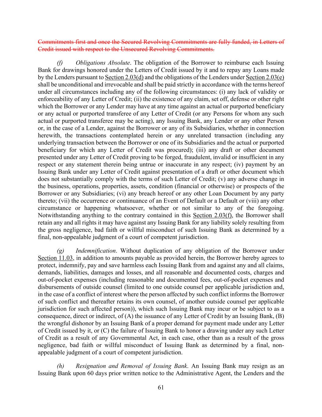 61 Commitments first and once the Secured Revolving Commitments are fully funded, in Letters of Credit issued with respect to the Unsecured Revolving Commitments. (f) Obligations Absolute. The obligation of the Borrower to reimburse each Issuing Bank for drawings honored under the Letters of Credit issued by it and to repay any Loans made by the Lenders pursuant to Section 2.03(d) and the obligations of the Lenders under Section 2.03(e) shall be unconditional and irrevocable and shall be paid strictly in accordance with the terms hereof under all circumstances including any of the following circumstances: (i) any lack of validity or enforceability of any Letter of Credit; (ii) the existence of any claim, set off, defense or other right which the Borrower or any Lender may have at any time against an actual or purported beneficiary or any actual or purported transferee of any Letter of Credit (or any Persons for whom any such actual or purported transferee may be acting), any Issuing Bank, any Lender or any other Person or, in the case of a Lender, against the Borrower or any of its Subsidiaries, whether in connection herewith, the transactions contemplated herein or any unrelated transaction (including any underlying transaction between the Borrower or one of its Subsidiaries and the actual or purported beneficiary for which any Letter of Credit was procured); (iii) any draft or other document presented under any Letter of Credit proving to be forged, fraudulent, invalid or insufficient in any respect or any statement therein being untrue or inaccurate in any respect; (iv) payment by an Issuing Bank under any Letter of Credit against presentation of a draft or other document which does not substantially comply with the terms of such Letter of Credit; (v) any adverse change in the business, operations, properties, assets, condition (financial or otherwise) or prospects of the Borrower or any Subsidiaries; (vi) any breach hereof or any other Loan Document by any party thereto; (vii) the occurrence or continuance of an Event of Default or a Default or (viii) any other circumstance or happening whatsoever, whether or not similar to any of the foregoing. Notwithstanding anything to the contrary contained in this Section 2.03(f), the Borrower shall retain any and all rights it may have against any Issuing Bank for any liability solely resulting from the gross negligence, bad faith or willful misconduct of such Issuing Bank as determined by a final, non-appealable judgment of a court of competent jurisdiction. (g) Indemnification. Without duplication of any obligation of the Borrower under Section 11.03, in addition to amounts payable as provided herein, the Borrower hereby agrees to protect, indemnify, pay and save harmless each Issuing Bank from and against any and all claims, demands, liabilities, damages and losses, and all reasonable and documented costs, charges and out-of-pocket expenses (including reasonable and documented fees, out-of-pocket expenses and disbursements of outside counsel (limited to one outside counsel per applicable jurisdiction and, in the case of a conflict of interest where the person affected by such conflict informs the Borrower of such conflict and thereafter retains its own counsel, of another outside counsel per applicable jurisdiction for such affected person)), which such Issuing Bank may incur or be subject to as a consequence, direct or indirect, of (A) the issuance of any Letter of Credit by an Issuing Bank, (B) the wrongful dishonor by an Issuing Bank of a proper demand for payment made under any Letter of Credit issued by it, or (C) the failure of Issuing Bank to honor a drawing under any such Letter of Credit as a result of any Governmental Act, in each case, other than as a result of the gross negligence, bad faith or willful misconduct of Issuing Bank as determined by a final, non- appealable judgment of a court of competent jurisdiction. (h) Resignation and Removal of Issuing Bank. An Issuing Bank may resign as an Issuing Bank upon 60 days prior written notice to the Administrative Agent, the Lenders and the