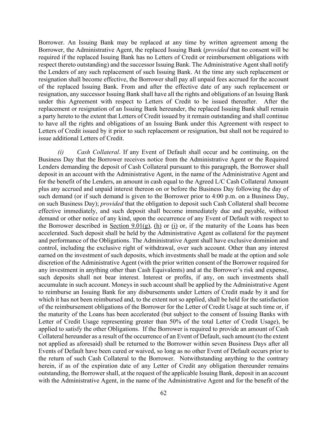 62 Borrower. An Issuing Bank may be replaced at any time by written agreement among the Borrower, the Administrative Agent, the replaced Issuing Bank (provided that no consent will be required if the replaced Issuing Bank has no Letters of Credit or reimbursement obligations with respect thereto outstanding) and the successor Issuing Bank. The Administrative Agent shall notify the Lenders of any such replacement of such Issuing Bank. At the time any such replacement or resignation shall become effective, the Borrower shall pay all unpaid fees accrued for the account of the replaced Issuing Bank. From and after the effective date of any such replacement or resignation, any successor Issuing Bank shall have all the rights and obligations of an Issuing Bank under this Agreement with respect to Letters of Credit to be issued thereafter. After the replacement or resignation of an Issuing Bank hereunder, the replaced Issuing Bank shall remain a party hereto to the extent that Letters of Credit issued by it remain outstanding and shall continue to have all the rights and obligations of an Issuing Bank under this Agreement with respect to Letters of Credit issued by it prior to such replacement or resignation, but shall not be required to issue additional Letters of Credit. (i) Cash Collateral. If any Event of Default shall occur and be continuing, on the Business Day that the Borrower receives notice from the Administrative Agent or the Required Lenders demanding the deposit of Cash Collateral pursuant to this paragraph, the Borrower shall deposit in an account with the Administrative Agent, in the name of the Administrative Agent and for the benefit of the Lenders, an amount in cash equal to the Agreed L/C Cash Collateral Amount plus any accrued and unpaid interest thereon on or before the Business Day following the day of such demand (or if such demand is given to the Borrower prior to 4:00 p.m. on a Business Day, on such Business Day); provided that the obligation to deposit such Cash Collateral shall become effective immediately, and such deposit shall become immediately due and payable, without demand or other notice of any kind, upon the occurrence of any Event of Default with respect to the Borrower described in Section 9.01(g), (h) or (i) or, if the maturity of the Loans has been accelerated. Such deposit shall be held by the Administrative Agent as collateral for the payment and performance of the Obligations. The Administrative Agent shall have exclusive dominion and control, including the exclusive right of withdrawal, over such account. Other than any interest earned on the investment of such deposits, which investments shall be made at the option and sole discretion of the Administrative Agent (with the prior written consent of the Borrower required for any investment in anything other than Cash Equivalents) and at the Borrower’s risk and expense, such deposits shall not bear interest. Interest or profits, if any, on such investments shall accumulate in such account. Moneys in such account shall be applied by the Administrative Agent to reimburse an Issuing Bank for any disbursements under Letters of Credit made by it and for which it has not been reimbursed and, to the extent not so applied, shall be held for the satisfaction of the reimbursement obligations of the Borrower for the Letter of Credit Usage at such time or, if the maturity of the Loans has been accelerated (but subject to the consent of Issuing Banks with Letter of Credit Usage representing greater than 50% of the total Letter of Credit Usage), be applied to satisfy the other Obligations. If the Borrower is required to provide an amount of Cash Collateral hereunder as a result of the occurrence of an Event of Default, such amount (to the extent not applied as aforesaid) shall be returned to the Borrower within seven Business Days after all Events of Default have been cured or waived, so long as no other Event of Default occurs prior to the return of such Cash Collateral to the Borrower. Notwithstanding anything to the contrary herein, if as of the expiration date of any Letter of Credit any obligation thereunder remains outstanding, the Borrower shall, at the request of the applicable Issuing Bank, deposit in an account with the Administrative Agent, in the name of the Administrative Agent and for the benefit of the