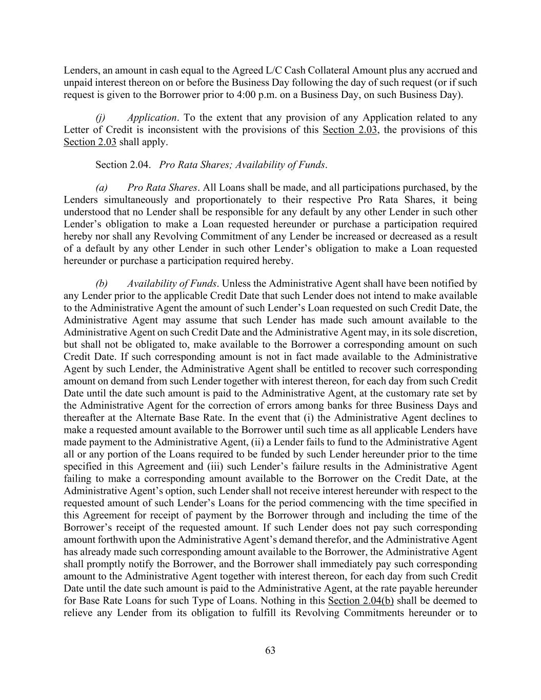 63 Lenders, an amount in cash equal to the Agreed L/C Cash Collateral Amount plus any accrued and unpaid interest thereon on or before the Business Day following the day of such request (or if such request is given to the Borrower prior to 4:00 p.m. on a Business Day, on such Business Day). (j) Application. To the extent that any provision of any Application related to any Letter of Credit is inconsistent with the provisions of this Section 2.03, the provisions of this Section 2.03 shall apply. Section 2.04. Pro Rata Shares; Availability of Funds. (a) Pro Rata Shares. All Loans shall be made, and all participations purchased, by the Lenders simultaneously and proportionately to their respective Pro Rata Shares, it being understood that no Lender shall be responsible for any default by any other Lender in such other Lender’s obligation to make a Loan requested hereunder or purchase a participation required hereby nor shall any Revolving Commitment of any Lender be increased or decreased as a result of a default by any other Lender in such other Lender’s obligation to make a Loan requested hereunder or purchase a participation required hereby. (b) Availability of Funds. Unless the Administrative Agent shall have been notified by any Lender prior to the applicable Credit Date that such Lender does not intend to make available to the Administrative Agent the amount of such Lender’s Loan requested on such Credit Date, the Administrative Agent may assume that such Lender has made such amount available to the Administrative Agent on such Credit Date and the Administrative Agent may, in its sole discretion, but shall not be obligated to, make available to the Borrower a corresponding amount on such Credit Date. If such corresponding amount is not in fact made available to the Administrative Agent by such Lender, the Administrative Agent shall be entitled to recover such corresponding amount on demand from such Lender together with interest thereon, for each day from such Credit Date until the date such amount is paid to the Administrative Agent, at the customary rate set by the Administrative Agent for the correction of errors among banks for three Business Days and thereafter at the Alternate Base Rate. In the event that (i) the Administrative Agent declines to make a requested amount available to the Borrower until such time as all applicable Lenders have made payment to the Administrative Agent, (ii) a Lender fails to fund to the Administrative Agent all or any portion of the Loans required to be funded by such Lender hereunder prior to the time specified in this Agreement and (iii) such Lender’s failure results in the Administrative Agent failing to make a corresponding amount available to the Borrower on the Credit Date, at the Administrative Agent’s option, such Lender shall not receive interest hereunder with respect to the requested amount of such Lender’s Loans for the period commencing with the time specified in this Agreement for receipt of payment by the Borrower through and including the time of the Borrower’s receipt of the requested amount. If such Lender does not pay such corresponding amount forthwith upon the Administrative Agent’s demand therefor, and the Administrative Agent has already made such corresponding amount available to the Borrower, the Administrative Agent shall promptly notify the Borrower, and the Borrower shall immediately pay such corresponding amount to the Administrative Agent together with interest thereon, for each day from such Credit Date until the date such amount is paid to the Administrative Agent, at the rate payable hereunder for Base Rate Loans for such Type of Loans. Nothing in this Section 2.04(b) shall be deemed to relieve any Lender from its obligation to fulfill its Revolving Commitments hereunder or to