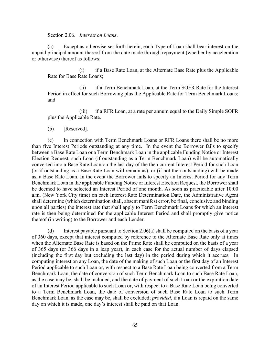 65 Section 2.06. Interest on Loans. (a) Except as otherwise set forth herein, each Type of Loan shall bear interest on the unpaid principal amount thereof from the date made through repayment (whether by acceleration or otherwise) thereof as follows: (i) if a Base Rate Loan, at the Alternate Base Rate plus the Applicable Rate for Base Rate Loans; (ii) if a Term Benchmark Loan, at the Term SOFR Rate for the Interest Period in effect for such Borrowing plus the Applicable Rate for Term Benchmark Loans; and (iii) if a RFR Loan, at a rate per annum equal to the Daily Simple SOFR plus the Applicable Rate. (b) [Reserved]. (c) In connection with Term Benchmark Loans or RFR Loans there shall be no more than five Interest Periods outstanding at any time. In the event the Borrower fails to specify between a Base Rate Loan or a Term Benchmark Loan in the applicable Funding Notice or Interest Election Request, such Loan (if outstanding as a Term Benchmark Loan) will be automatically converted into a Base Rate Loan on the last day of the then current Interest Period for such Loan (or if outstanding as a Base Rate Loan will remain as), or (if not then outstanding) will be made as, a Base Rate Loan. In the event the Borrower fails to specify an Interest Period for any Term Benchmark Loan in the applicable Funding Notice or Interest Election Request, the Borrower shall be deemed to have selected an Interest Period of one month. As soon as practicable after 10:00 a.m. (New York City time) on each Interest Rate Determination Date, the Administrative Agent shall determine (which determination shall, absent manifest error, be final, conclusive and binding upon all parties) the interest rate that shall apply to Term Benchmark Loans for which an interest rate is then being determined for the applicable Interest Period and shall promptly give notice thereof (in writing) to the Borrower and each Lender. (d) Interest payable pursuant to Section 2.06(a) shall be computed on the basis of a year of 360 days, except that interest computed by reference to the Alternate Base Rate only at times when the Alternate Base Rate is based on the Prime Rate shall be computed on the basis of a year of 365 days (or 366 days in a leap year), in each case for the actual number of days elapsed (including the first day but excluding the last day) in the period during which it accrues. In computing interest on any Loan, the date of the making of such Loan or the first day of an Interest Period applicable to such Loan or, with respect to a Base Rate Loan being converted from a Term Benchmark Loan, the date of conversion of such Term Benchmark Loan to such Base Rate Loan, as the case may be, shall be included, and the date of payment of such Loan or the expiration date of an Interest Period applicable to such Loan or, with respect to a Base Rate Loan being converted to a Term Benchmark Loan, the date of conversion of such Base Rate Loan to such Term Benchmark Loan, as the case may be, shall be excluded; provided, if a Loan is repaid on the same day on which it is made, one day’s interest shall be paid on that Loan.