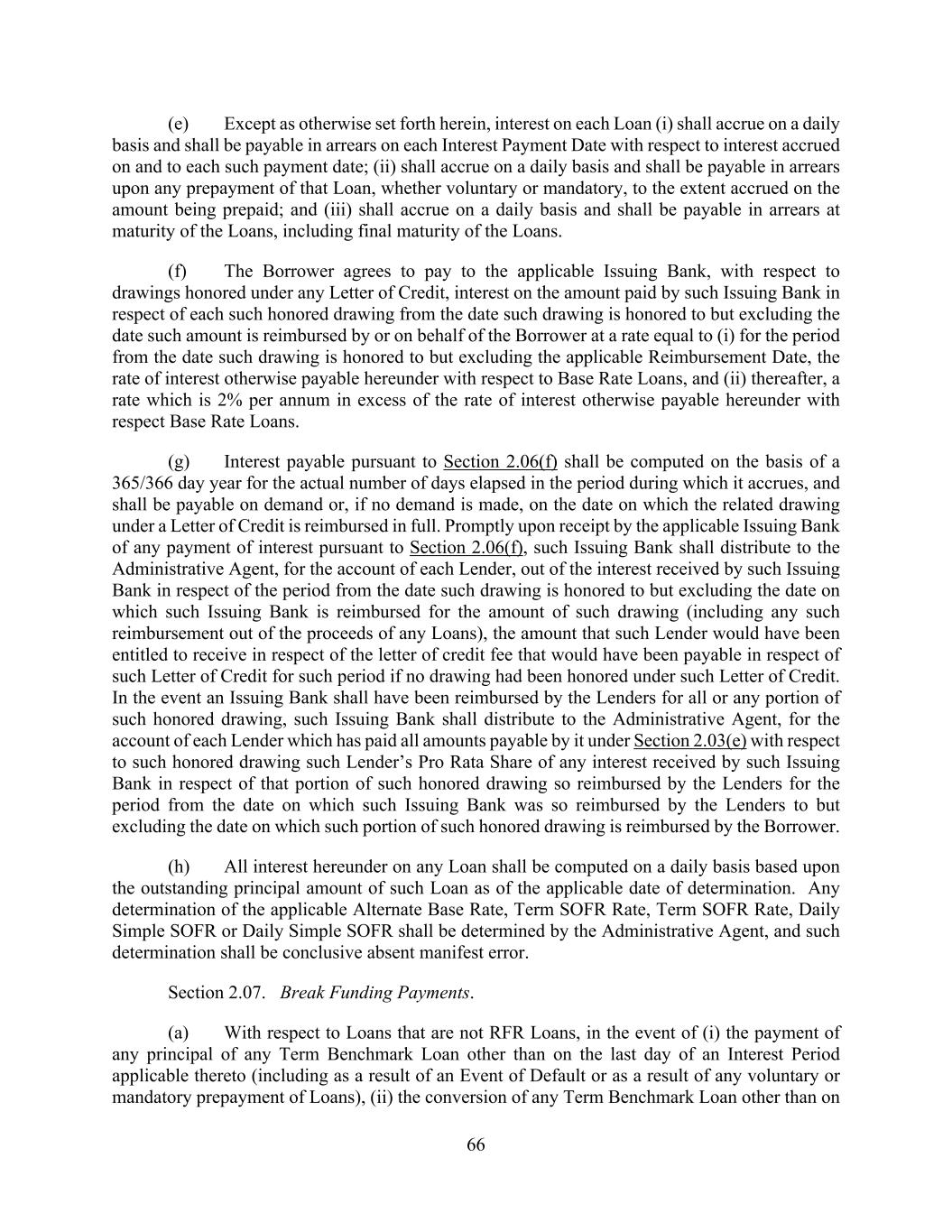 66 (e) Except as otherwise set forth herein, interest on each Loan (i) shall accrue on a daily basis and shall be payable in arrears on each Interest Payment Date with respect to interest accrued on and to each such payment date; (ii) shall accrue on a daily basis and shall be payable in arrears upon any prepayment of that Loan, whether voluntary or mandatory, to the extent accrued on the amount being prepaid; and (iii) shall accrue on a daily basis and shall be payable in arrears at maturity of the Loans, including final maturity of the Loans. (f) The Borrower agrees to pay to the applicable Issuing Bank, with respect to drawings honored under any Letter of Credit, interest on the amount paid by such Issuing Bank in respect of each such honored drawing from the date such drawing is honored to but excluding the date such amount is reimbursed by or on behalf of the Borrower at a rate equal to (i) for the period from the date such drawing is honored to but excluding the applicable Reimbursement Date, the rate of interest otherwise payable hereunder with respect to Base Rate Loans, and (ii) thereafter, a rate which is 2% per annum in excess of the rate of interest otherwise payable hereunder with respect Base Rate Loans. (g) Interest payable pursuant to Section 2.06(f) shall be computed on the basis of a 365/366 day year for the actual number of days elapsed in the period during which it accrues, and shall be payable on demand or, if no demand is made, on the date on which the related drawing under a Letter of Credit is reimbursed in full. Promptly upon receipt by the applicable Issuing Bank of any payment of interest pursuant to Section 2.06(f), such Issuing Bank shall distribute to the Administrative Agent, for the account of each Lender, out of the interest received by such Issuing Bank in respect of the period from the date such drawing is honored to but excluding the date on which such Issuing Bank is reimbursed for the amount of such drawing (including any such reimbursement out of the proceeds of any Loans), the amount that such Lender would have been entitled to receive in respect of the letter of credit fee that would have been payable in respect of such Letter of Credit for such period if no drawing had been honored under such Letter of Credit. In the event an Issuing Bank shall have been reimbursed by the Lenders for all or any portion of such honored drawing, such Issuing Bank shall distribute to the Administrative Agent, for the account of each Lender which has paid all amounts payable by it under Section 2.03(e) with respect to such honored drawing such Lender’s Pro Rata Share of any interest received by such Issuing Bank in respect of that portion of such honored drawing so reimbursed by the Lenders for the period from the date on which such Issuing Bank was so reimbursed by the Lenders to but excluding the date on which such portion of such honored drawing is reimbursed by the Borrower. (h) All interest hereunder on any Loan shall be computed on a daily basis based upon the outstanding principal amount of such Loan as of the applicable date of determination. Any determination of the applicable Alternate Base Rate, Term SOFR Rate, Term SOFR Rate, Daily Simple SOFR or Daily Simple SOFR shall be determined by the Administrative Agent, and such determination shall be conclusive absent manifest error. Section 2.07. Break Funding Payments. (a) With respect to Loans that are not RFR Loans, in the event of (i) the payment of any principal of any Term Benchmark Loan other than on the last day of an Interest Period applicable thereto (including as a result of an Event of Default or as a result of any voluntary or mandatory prepayment of Loans), (ii) the conversion of any Term Benchmark Loan other than on